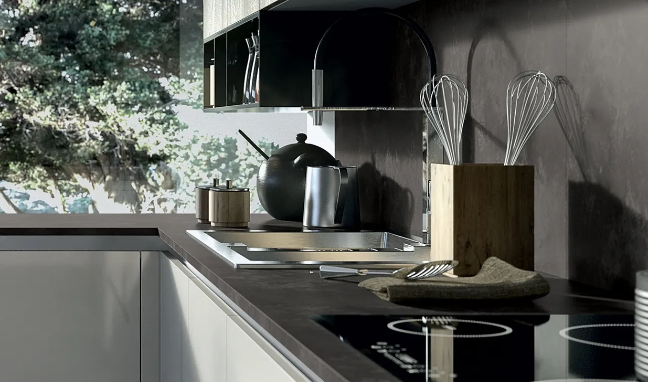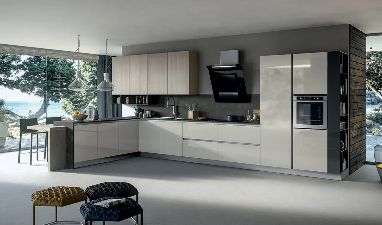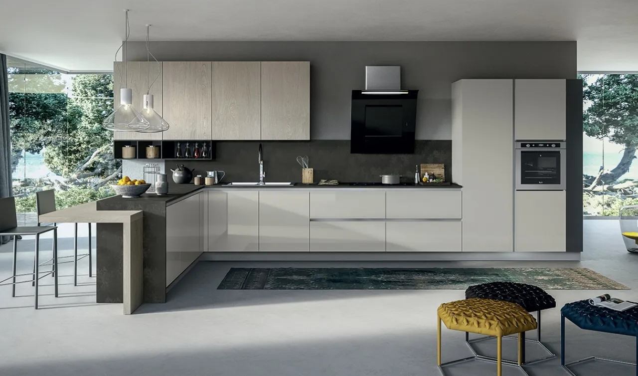 La nostra offerta, per una bella cucina modello Round, con penisola, completa dei elettrodomestici marchiati INDESIT tutti i n classe A+ ( frigo-congelatore, lavastoviglie, forno multifunzione e pian o cottura induzione cm.60 ) Le dimensioni come in foto Lunghezza frontale 514 (compresa la penisola), profondità della penisola 285 cm. è una soluzione del nostro catalogo, su ordinazione, personalizzabile oltre alle misure anche le finiture dei materiali, come le foto allegate di seguito, completa di top in laminato schienale oltre al piano snack sempre in laminato. In foto è proposta in laminato materico per i pensili e in laminato lucido per basi e colonne. Il prezzo ivato Euro 8.8000, 00 la consegna è compresa nel prezzo, per maggiori informazioni e prezzi, compilate il forum di seguito o contattate il nostro ufficio al 340 0557150