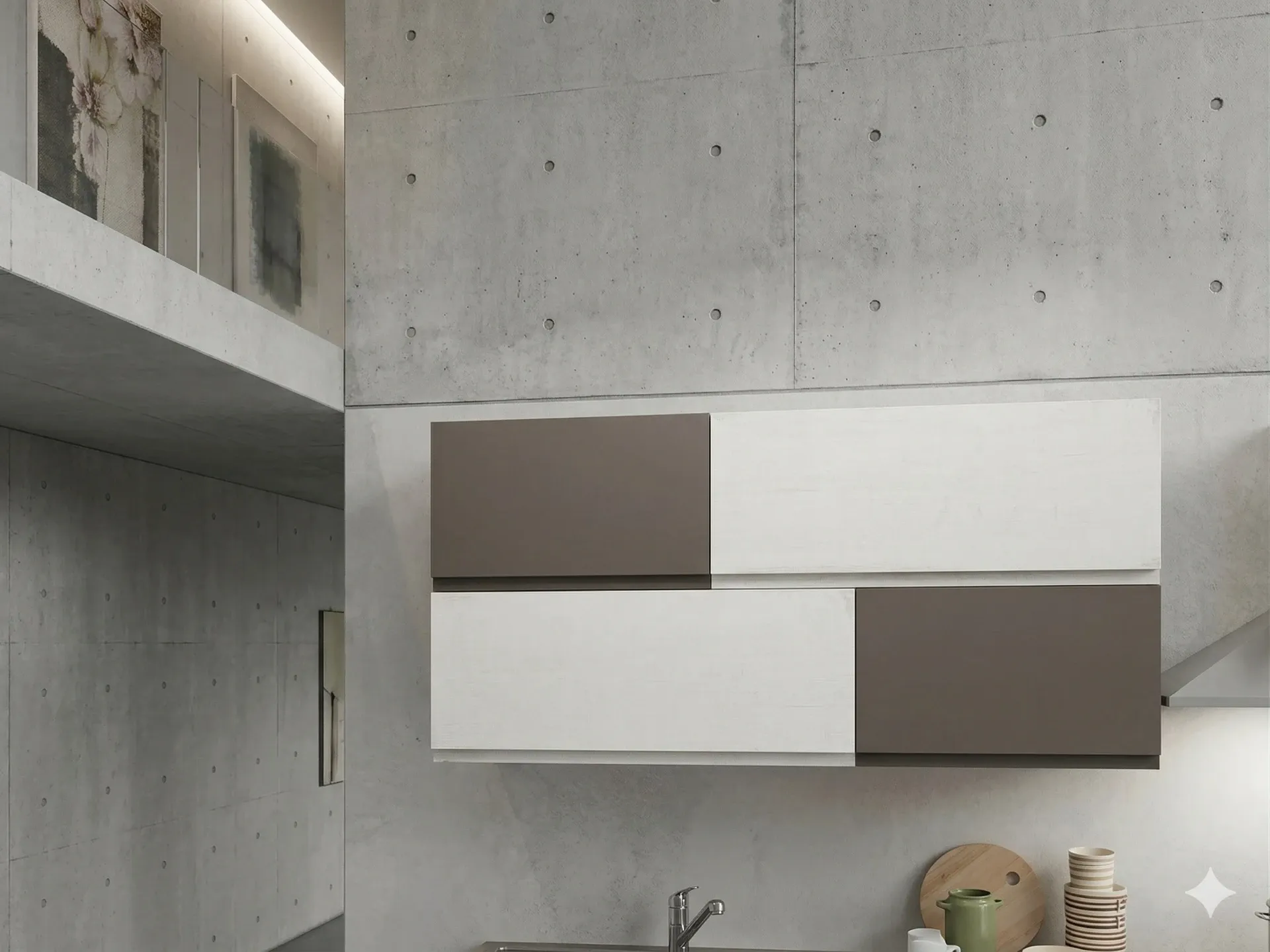 Cucina componibile con ante a cubotto, disponibile in melaminico Antracite Dust e Bianco Dust. La combinazione cromatica gioca sul contrasto mat tra le due finiture, con una superficie a effetto opaco che resiste alle impronte e si pulisce facilmente. Struttura portante in pannello nobilitato con spessori rinforzati. Dimensioni composizione: L 360 cm × H 216 cm.