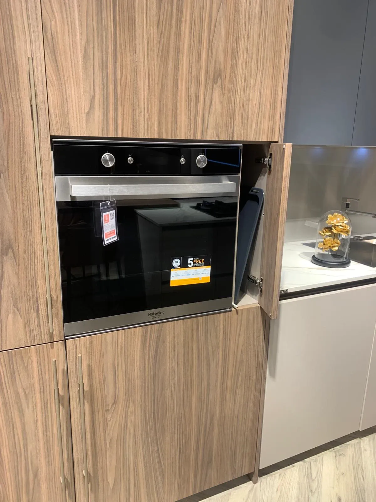 I dettagli fanno la differenza: gola e zoccolo bronzo definiscono il design con una linea pulita e continua, mentre la dotazione di elettrodomestici Hotpoint completa la cucina rendendola pronta da vivere, fin da subito.
