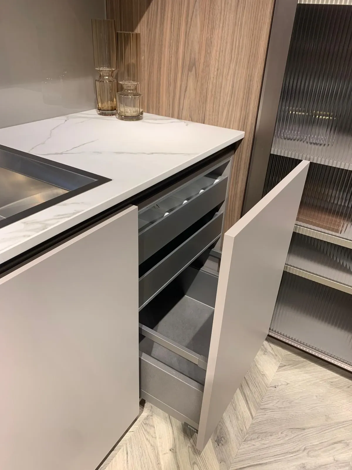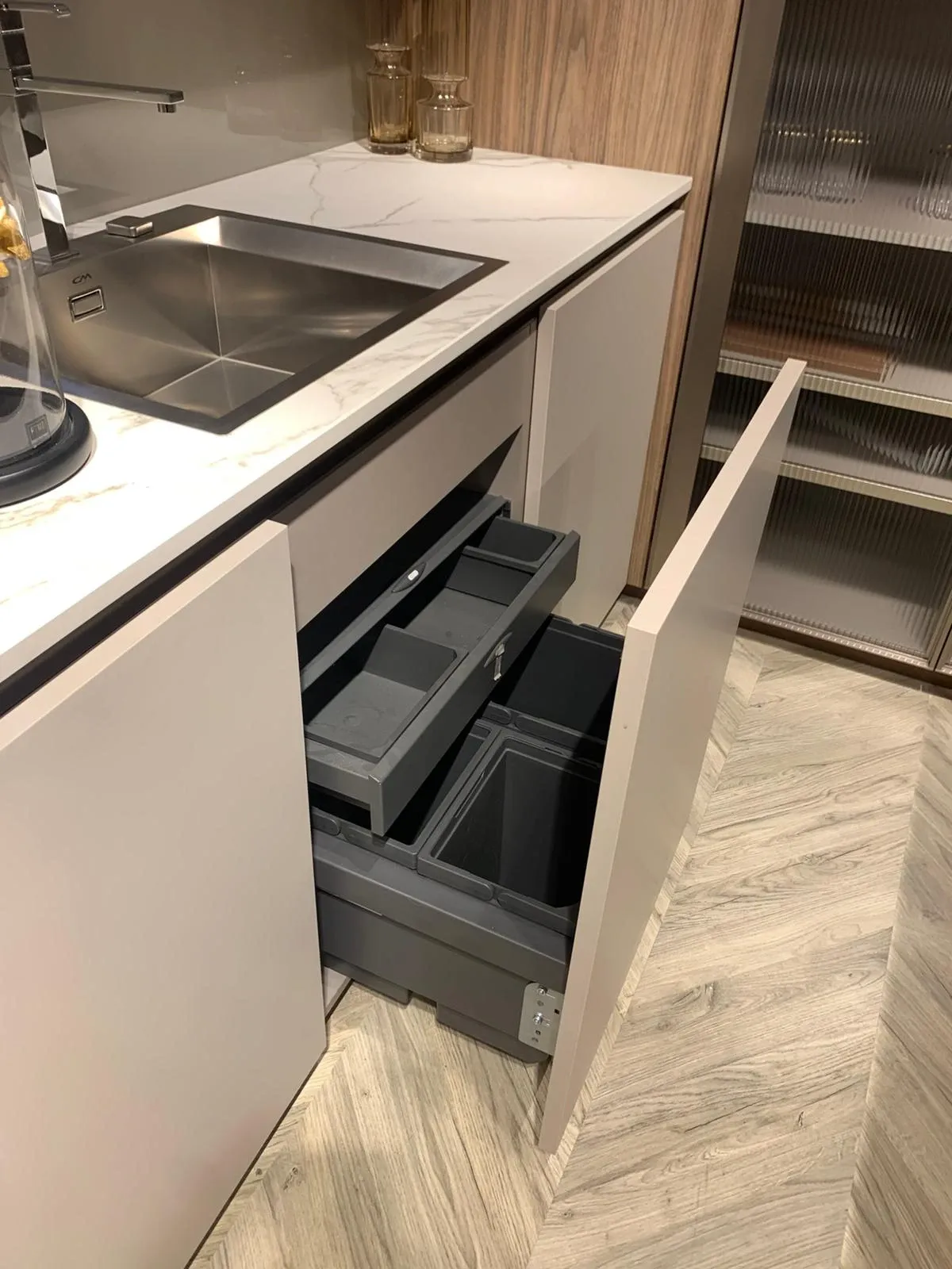 Le finiture raccontano già tanto: il PET beige opaco regala equilibrio e luminosità, il noce eucalipto aggiunge profondità e calore, mentre il Fenix verde Comodoro introduce un tocco deciso, elegante e attuale. Il tutto valorizzato dal top in Neolith Calacatta, resistente, raffinato e perfetto per un utilizzo quotidiano senza compromessi.