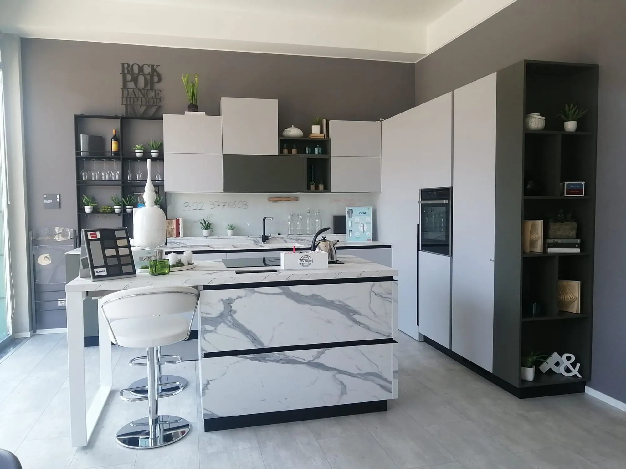 CUCINA SCAVOLINI MODELLO DELINEA FENIX GRIGIO EFESO CON PARTICOLARI LACCATO OPACO VERDE MINERALE
