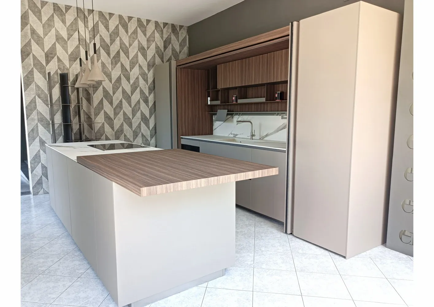 Cucina completa mod. SIGN di Ernestomeda, soluzione ad isola con piano scorrevole trasformabile snack mod. MOVE-ONE e parete attrezzata completamente a scomparsa mod. DOUBLE INDOOR, in finitura FENIX tinta CASTORO OTTAWA ed inserti come foto in Hi-Melamine finitura legno tinta CANYON, con zoccolo e profili in finitura LUCEM. La composizione è completa di un'isola delle seguenti dimensioni totali: profondità 95 cm (con piano scorrevole aperto profondità 139 cm) x lunghezza totale 317 cm (273 cm + parte a sbalzo del bancone snack) e completa di una parete attrezzata a colonne con sistema di ante a scomparsa h 213 x Profondità 80 cm e con una lunghezza totale di 393 cm. La cucina è inoltre completa di top e schienale in gres Abitum tinta CALACATTA DELICATO opaco con vasca grande sottopiano in tinta Jasmine, sistema d'illuminazione Led incassata sul cielo della parete attrezzata delle colonne a scomparsa e sotto le mensole a giorno. Sull'isola inoltre è presenta a scomparsa una doppia presa in finitura nera. La composizione inoltre è completa dei seguenti elettrodomestici: lavello sottopiano in fragranite Telma mod. Cube ON7610ST tinta Jasmine, miscelatore Newform mod. MAKI, lavastoviglie Siemens SN95EX56CE, forno Siemens HB734G1B1, frigocongelatore Electrolux LNS6TE19S e piano cottura ad induzione Siemens EX775LEC1E. Nella composizione NON è prevista la cappa ad isola (possibilità di aggiungerla, costo da quantificare in base al modello scelto). VENDITA PER RINNOVO ESPOSIZIONE. TRASPORTO e MONTAGGIO ESCLUSI (da quantificare eventualmente a parte in base al luogo e piano di consegna).