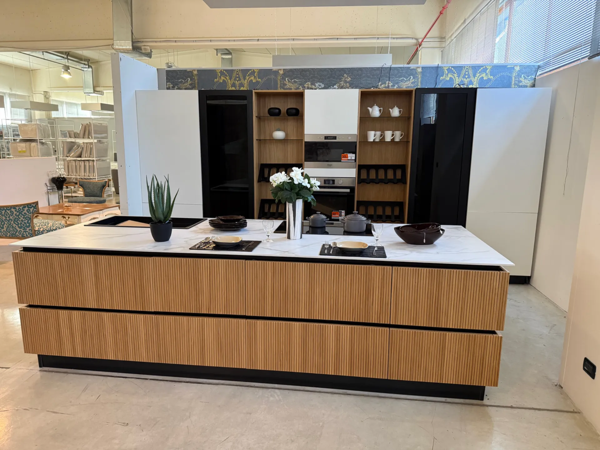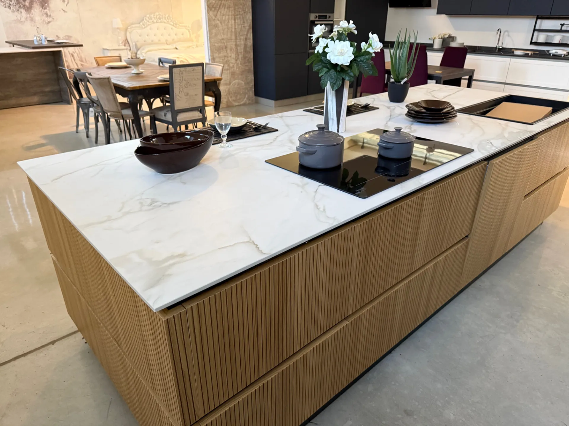 L isola centrale, caratterizzata dal frontale in doghe di legno verticale, è completata da un ampio piano in gres effetto marmo, che dona un aspetto moderno e raffinato.