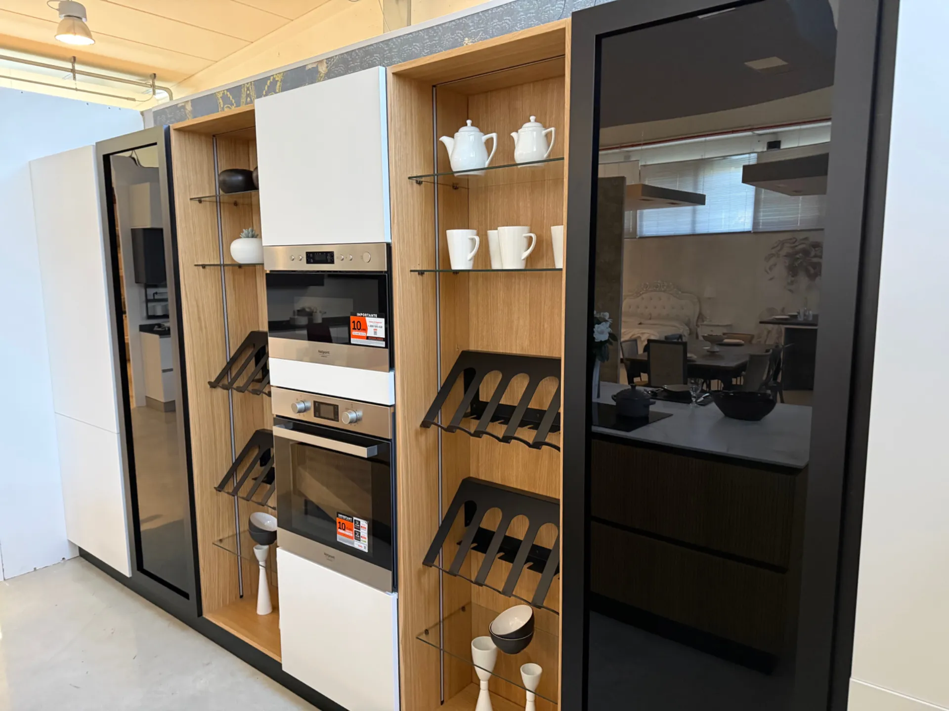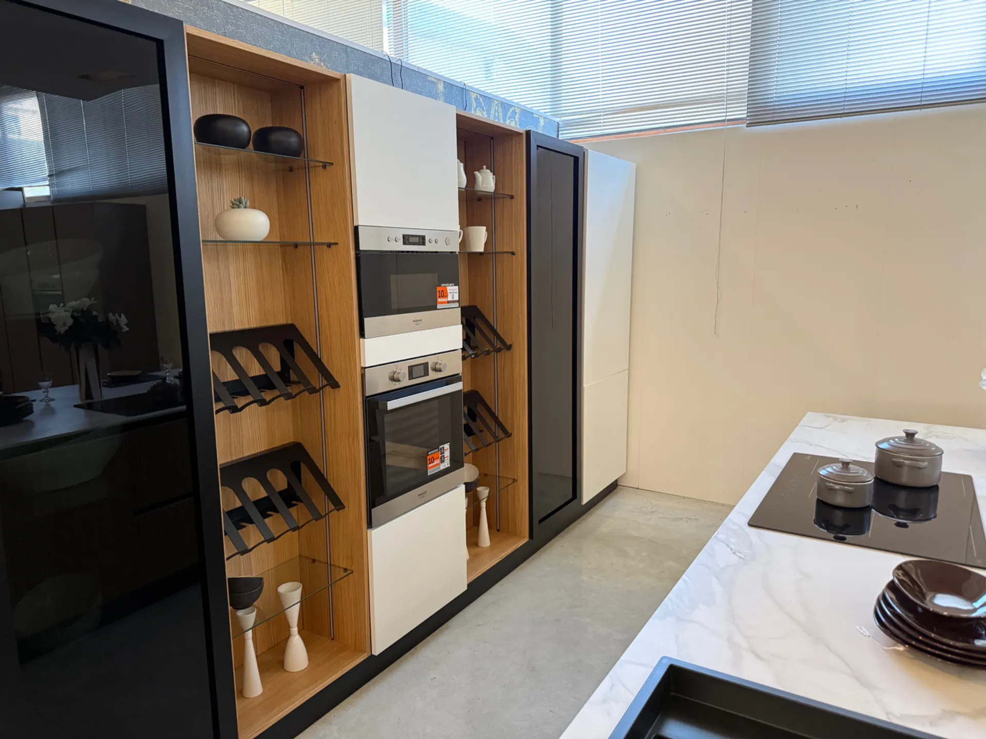 Sul retro si sviluppa una composizione a colonna con vani a giorno in legno, elettrodomestici incassati e moduli a tutta altezza a finitura chiara e scura, creando un piacevole contrasto materico. La presenza della doppia vetrinetta integrata aggiunge un elemento funzionale e di pregio.