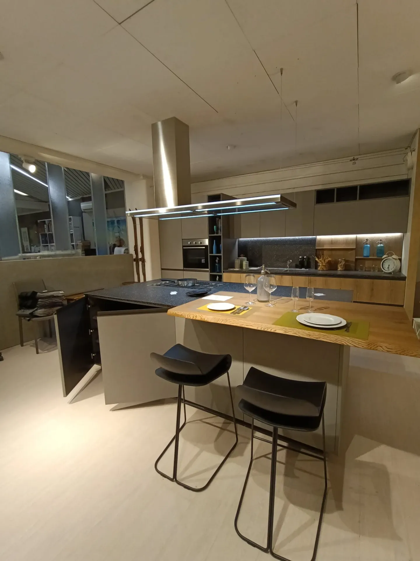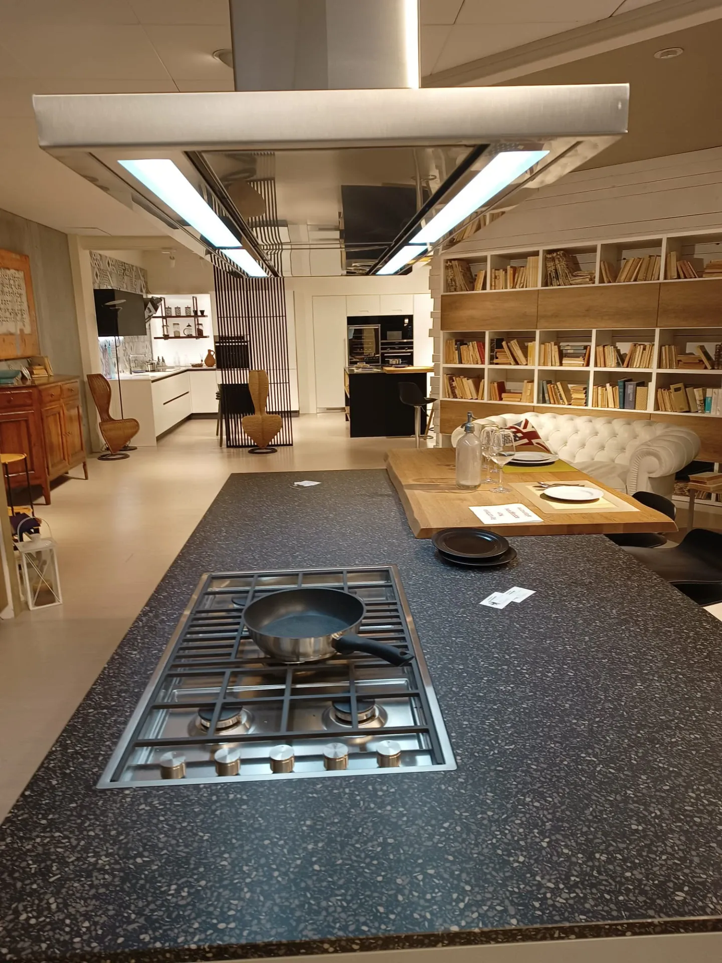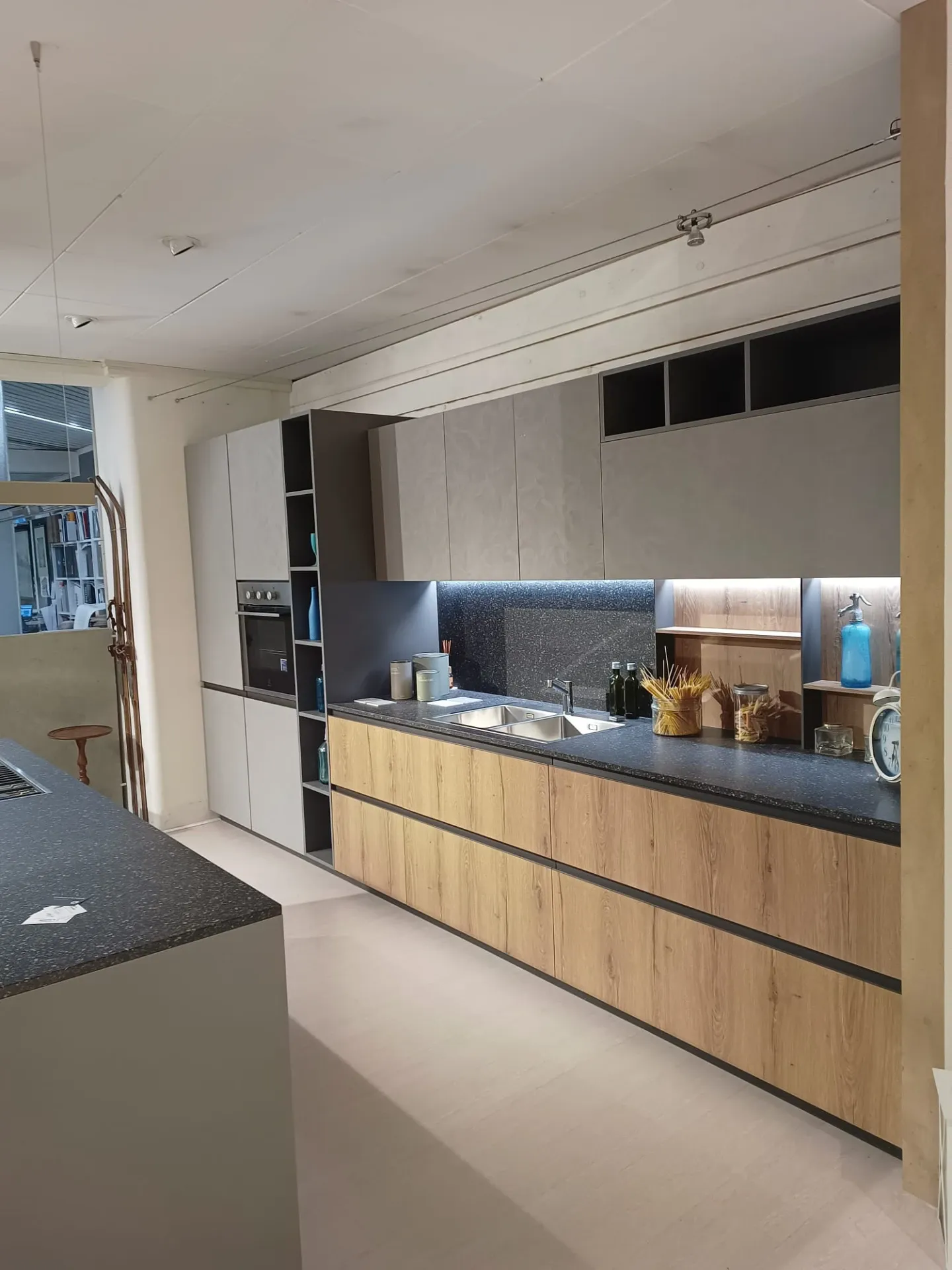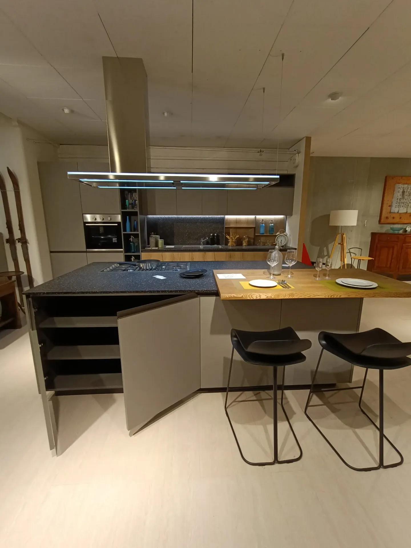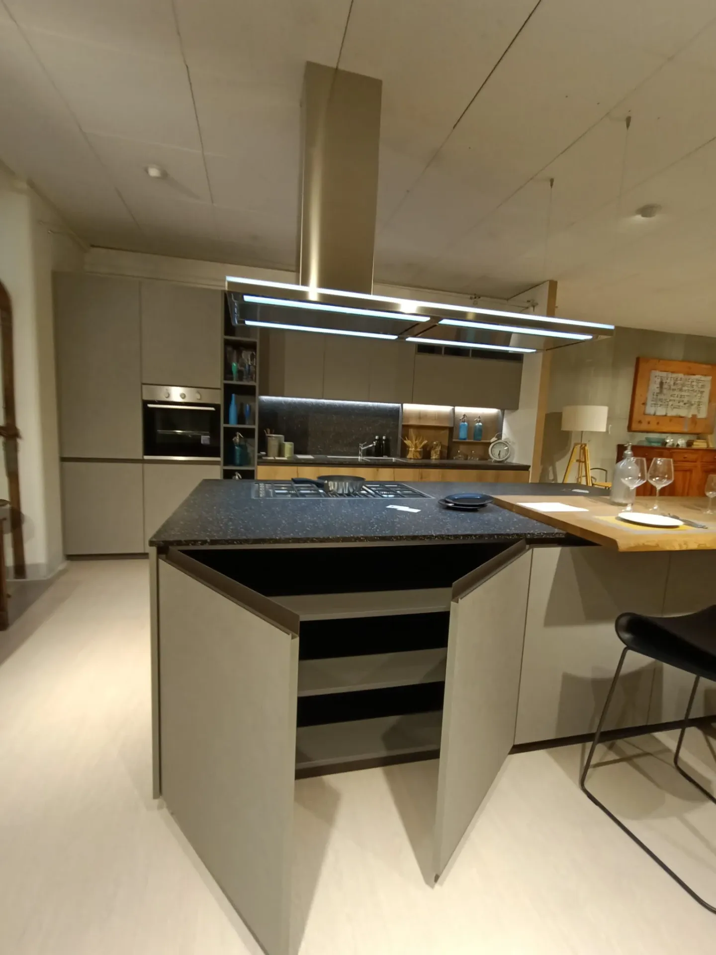 Cucina composta da parete con colonne e basi attrezzate lunga cm 420 p. 70 H 224 , piano e schienale in quarzo finitura Terrazzo nero, con lavello 2 vasche bordo ribassato. Isola da 240 x 120 con cestoni sul lato interno e basi sul lato esterno con comodo piano in legno massello per la colazione , il tutto illuminato da una cappa ad isola con led perimetrali. Il piano cottura è di tipo professionale ribassato con bordo a filo. Manca la lavastoviglie ma c'è lo spazio per integrarla.