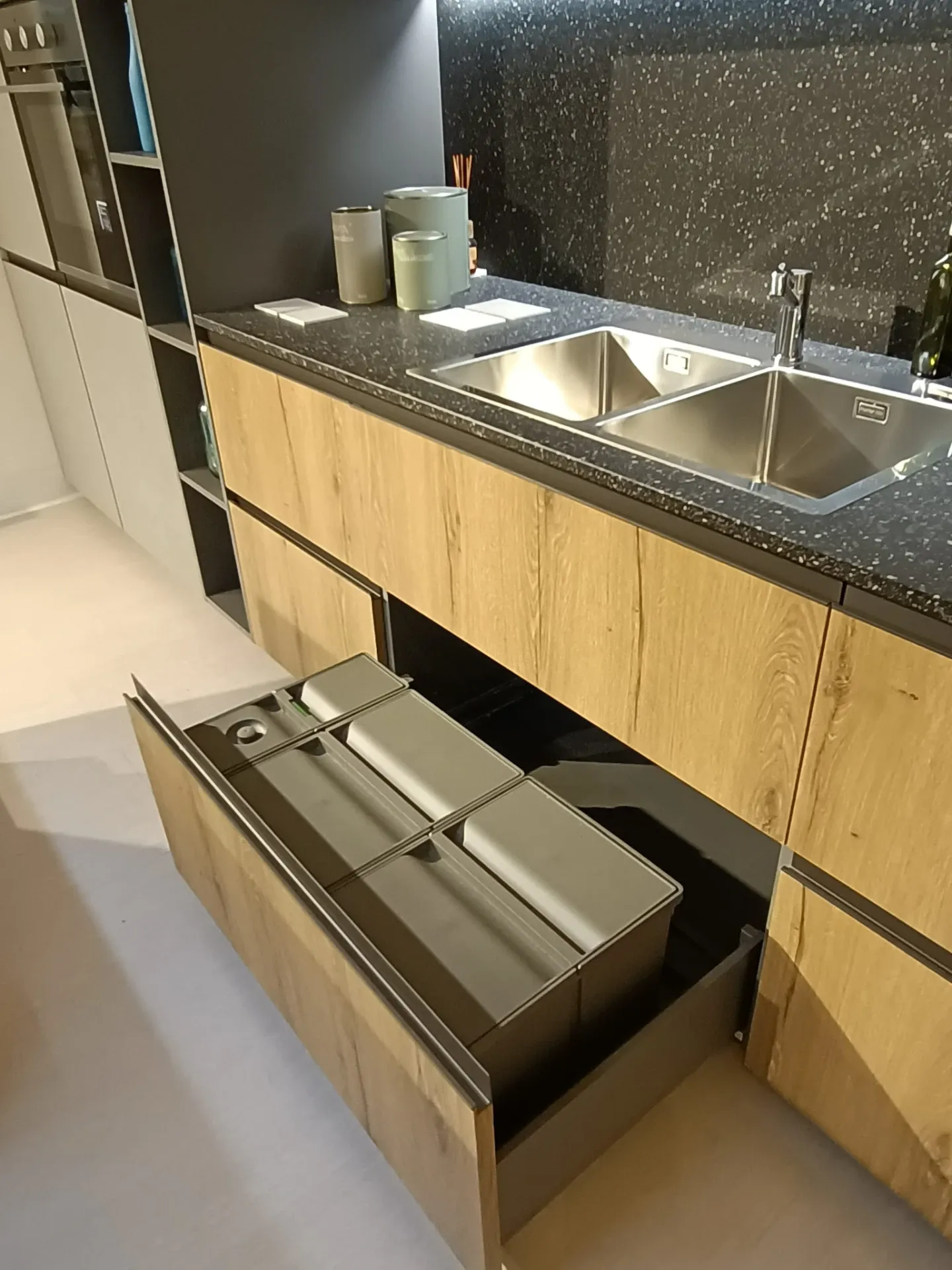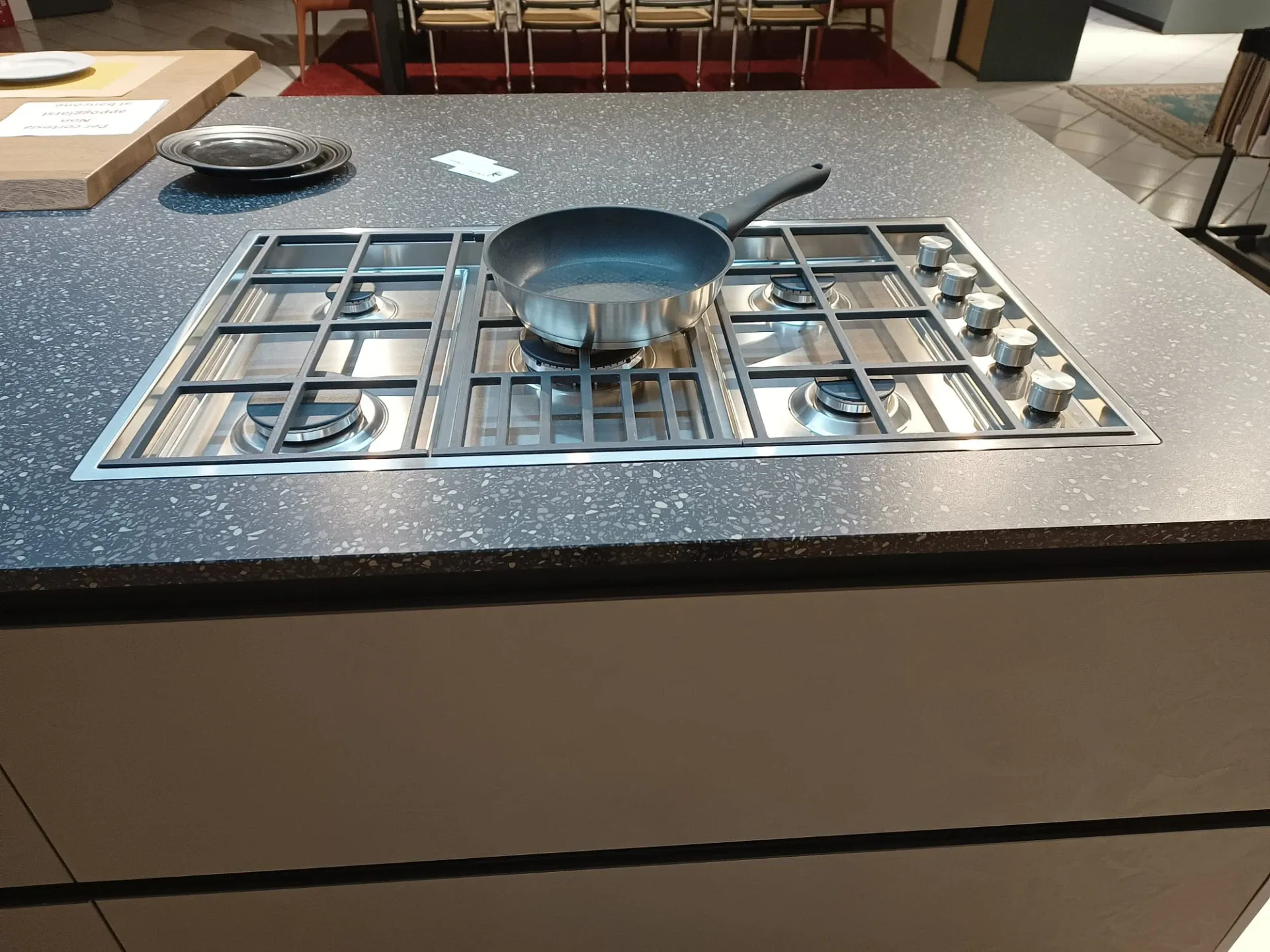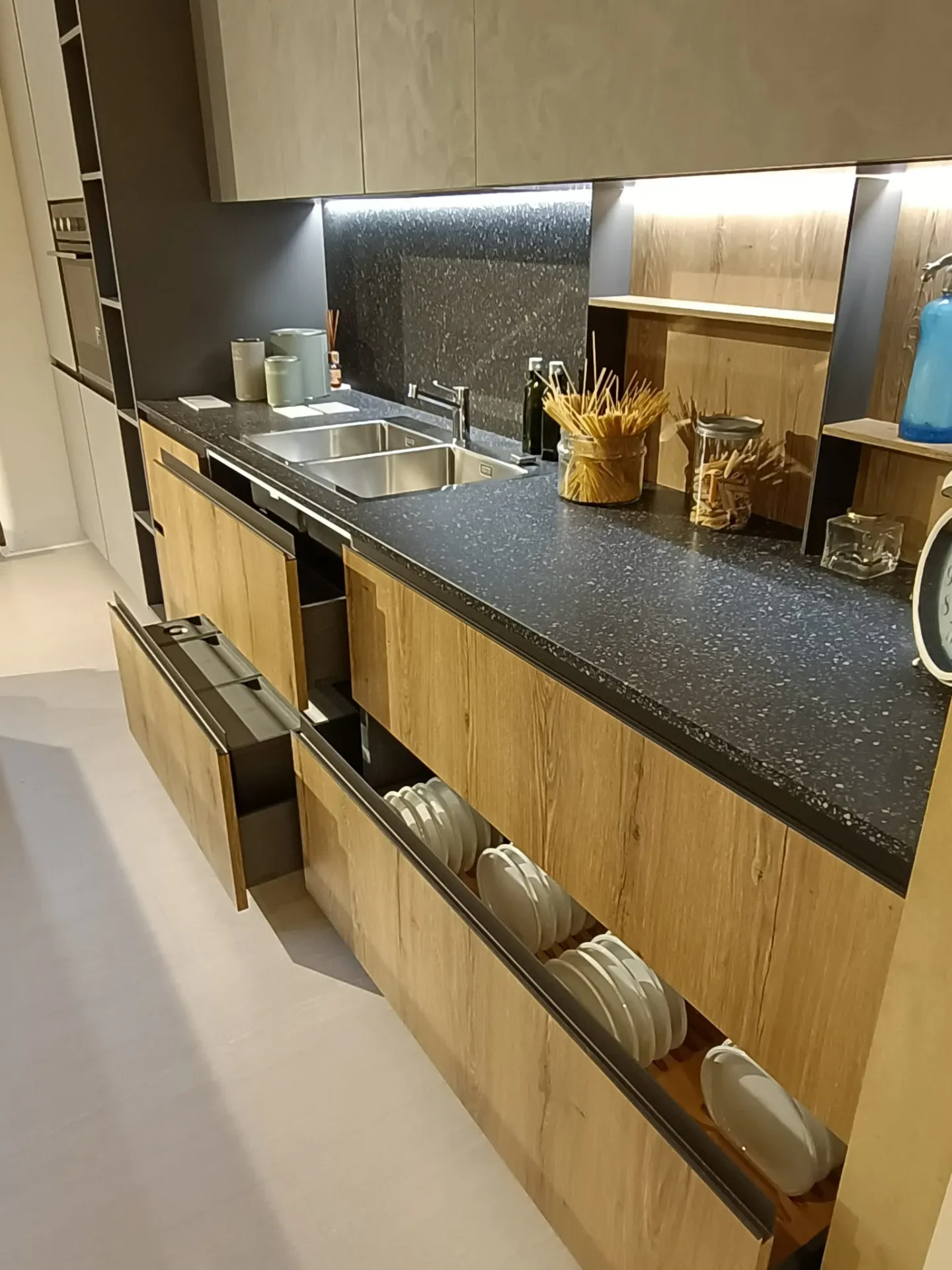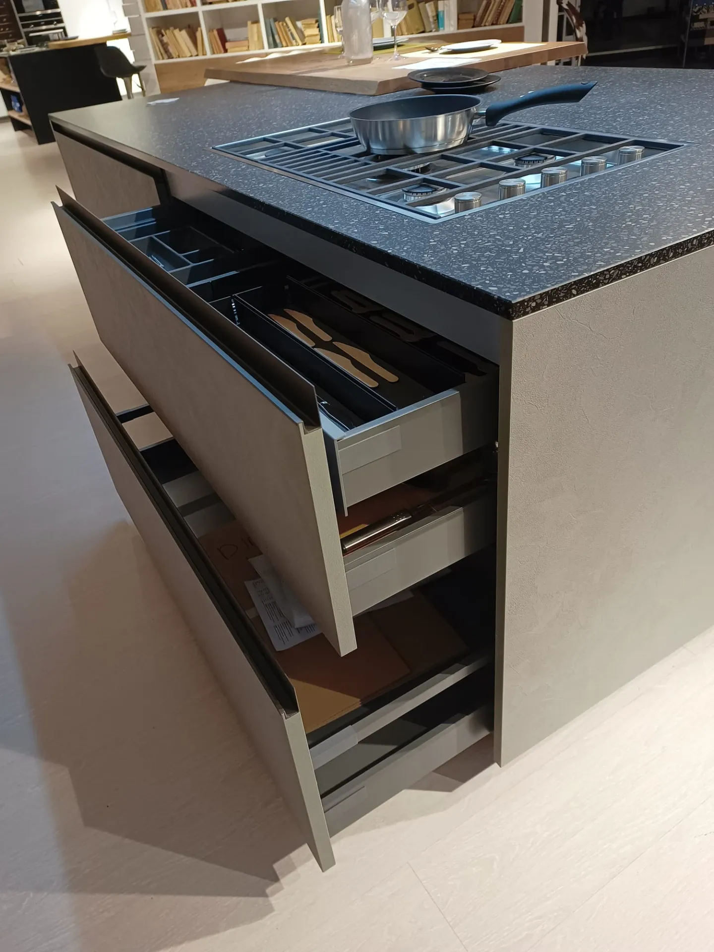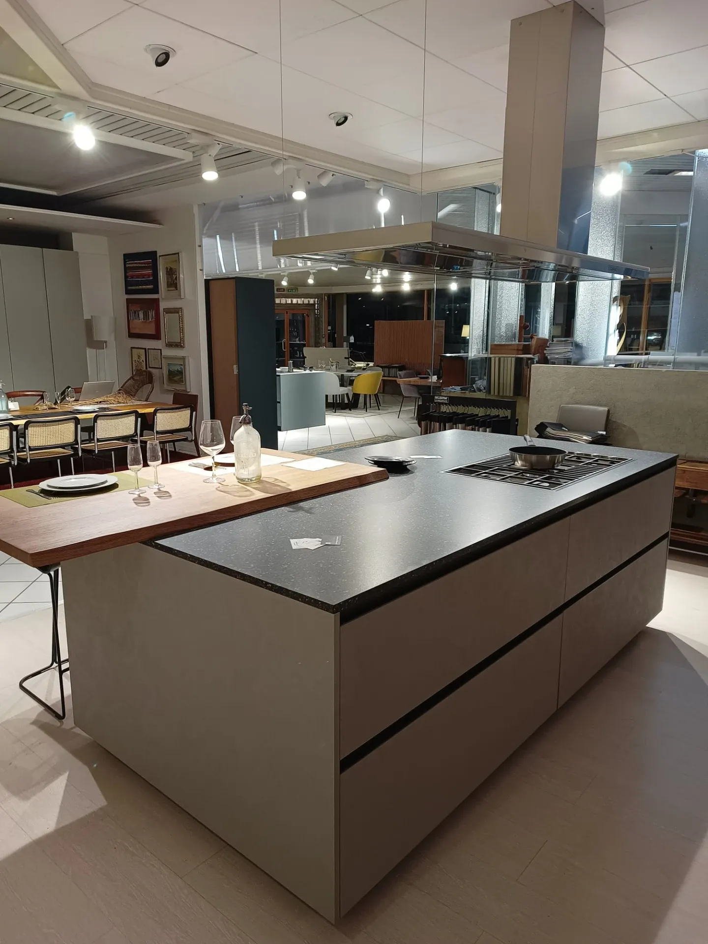 Cucina composta da parete con colonne e basi attrezzate lunga cm 420 p. 70 H 224 , piano e schienale in quarzo finitura Terrazzo nero, con lavello 2 vasche bordo ribassato. Isola da 240 x 120 con cestoni sul lato interno e basi sul lato esterno con comodo piano in legno massello per la colazione , il tutto illuminato da una cappa ad isola con led perimetrali. Il piano cottura è di tipo professionale ribassato con bordo a filo. Manca la lavastoviglie ma c'è lo spazio per integrarla.