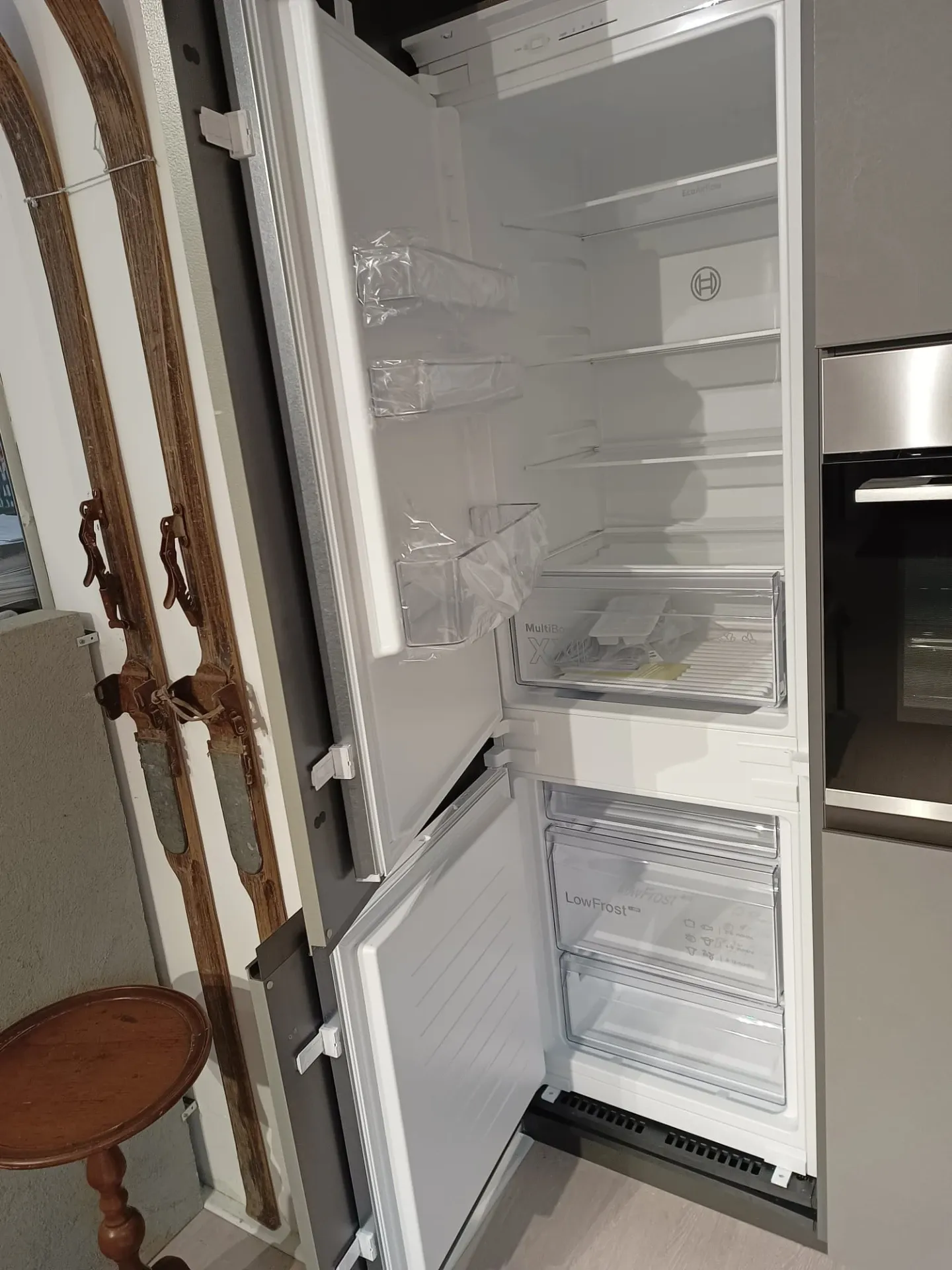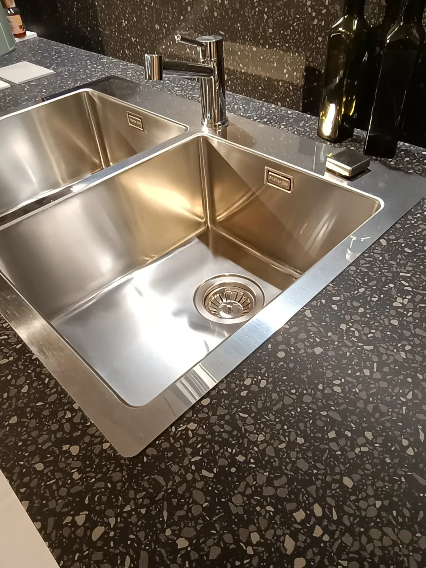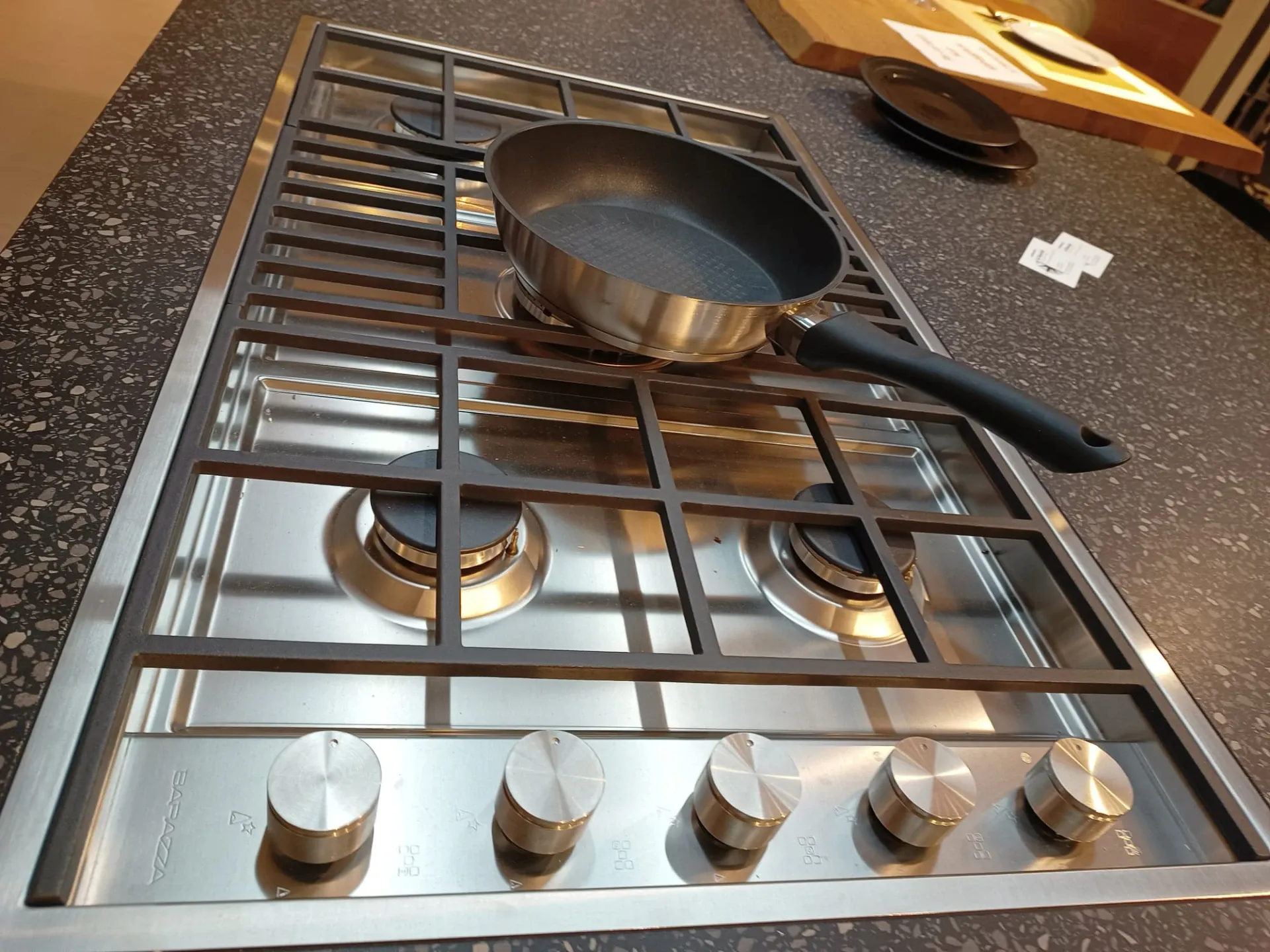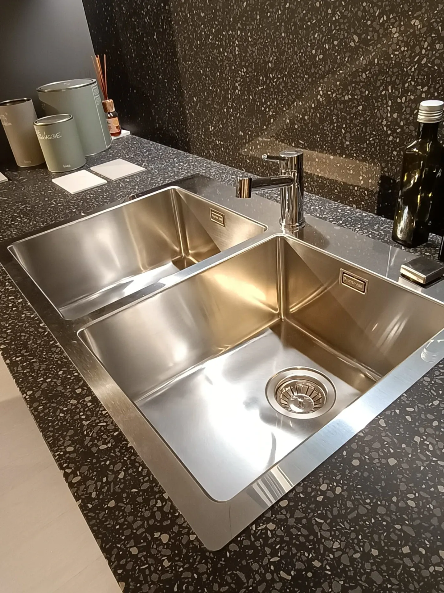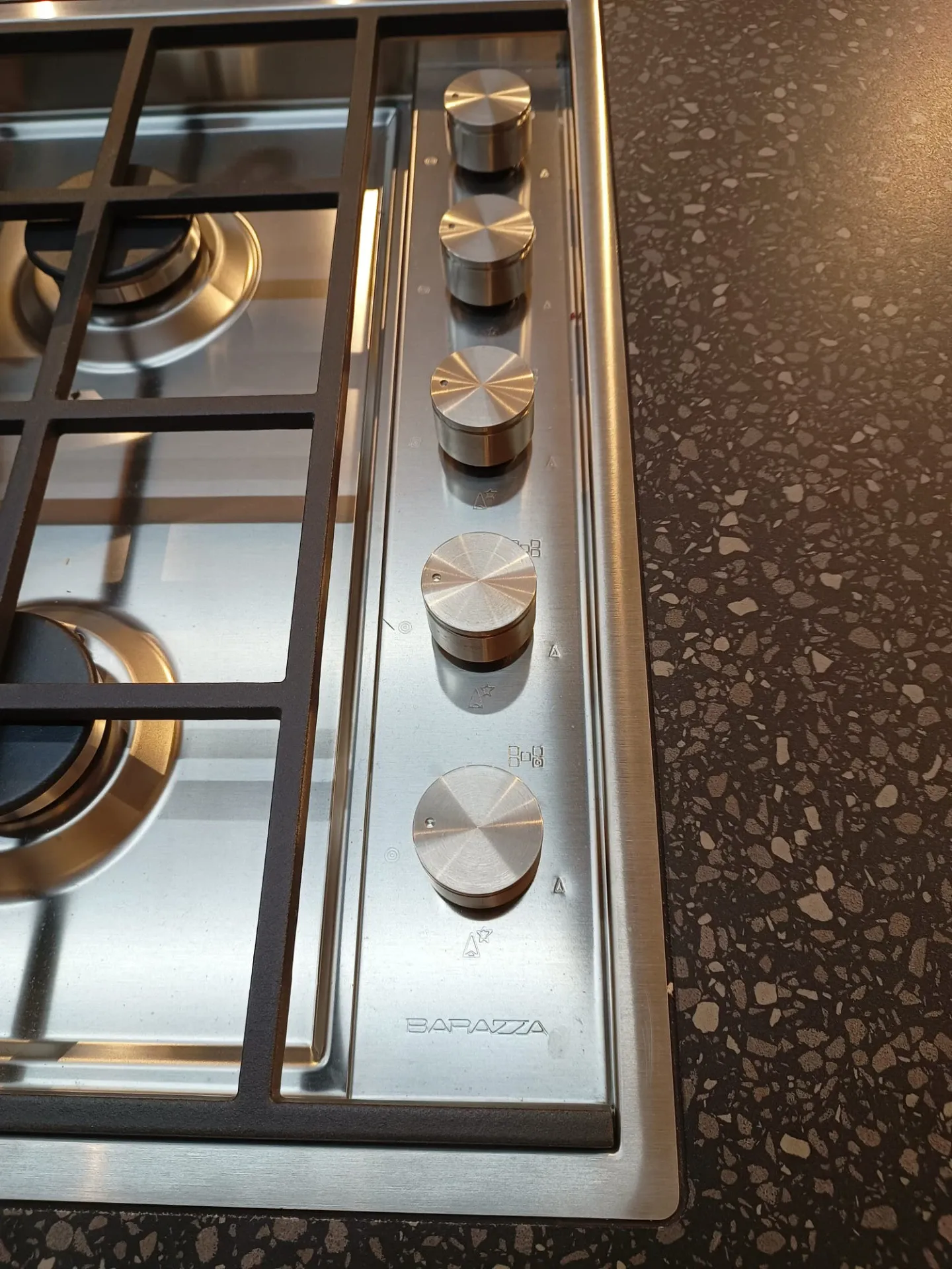 Cucina composta da parete con colonne e basi attrezzate lunga cm 420 p. 70 H 224 , piano e schienale in quarzo finitura Terrazzo nero, con lavello 2 vasche bordo ribassato. Isola da 240 x 120 con cestoni sul lato interno e basi sul lato esterno con comodo piano in legno massello per la colazione , il tutto illuminato da una cappa ad isola con led perimetrali. Il piano cottura è di tipo professionale ribassato con bordo a filo. Manca la lavastoviglie ma c'è lo spazio per integrarla.