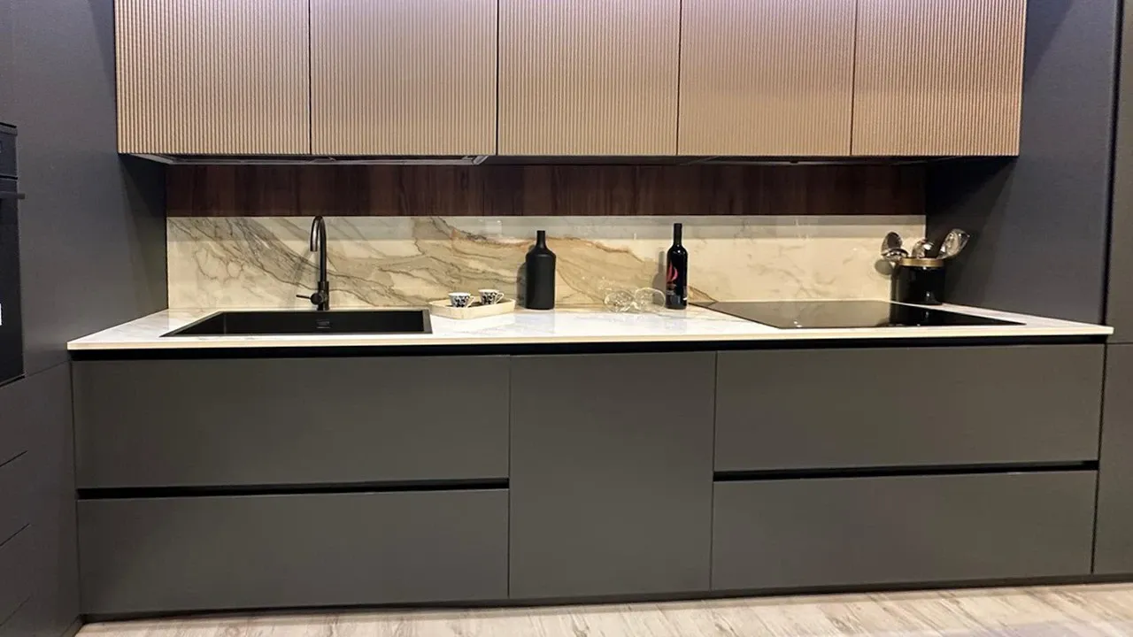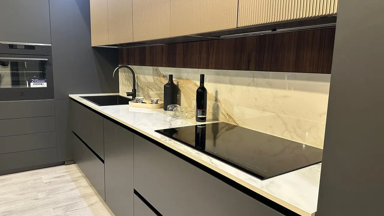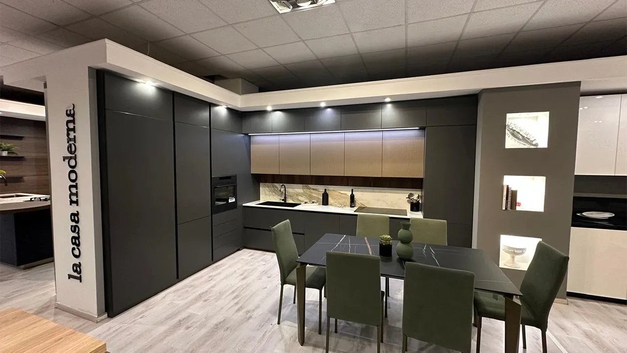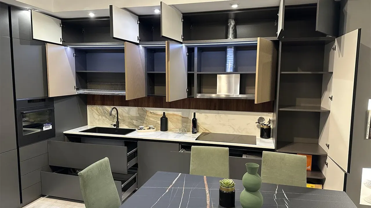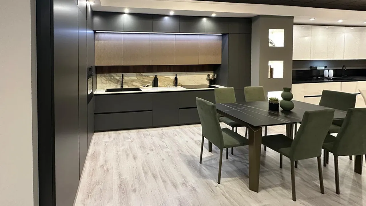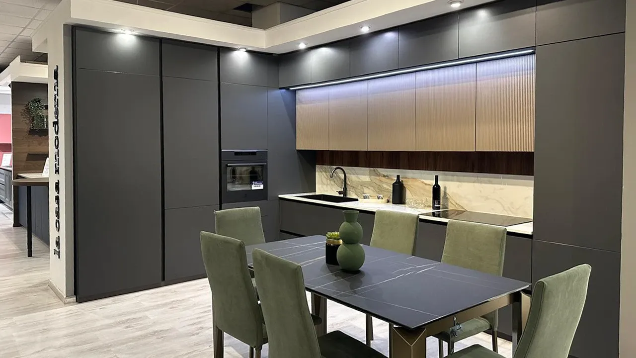 Disponibile all'intenro dello Store di Modugno (Ba), cucina angolare Star nella finitura grafite con pensili centrali onda oro metal dogato.