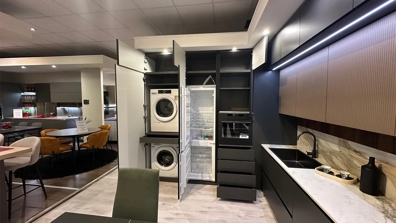 Completa di tutti gli elettrodomestici Electrolux, piano e schienale in gres Infinity Calacatta Hermitage, è dotata di colonna per incasso lavatrice ed asciugatrice.