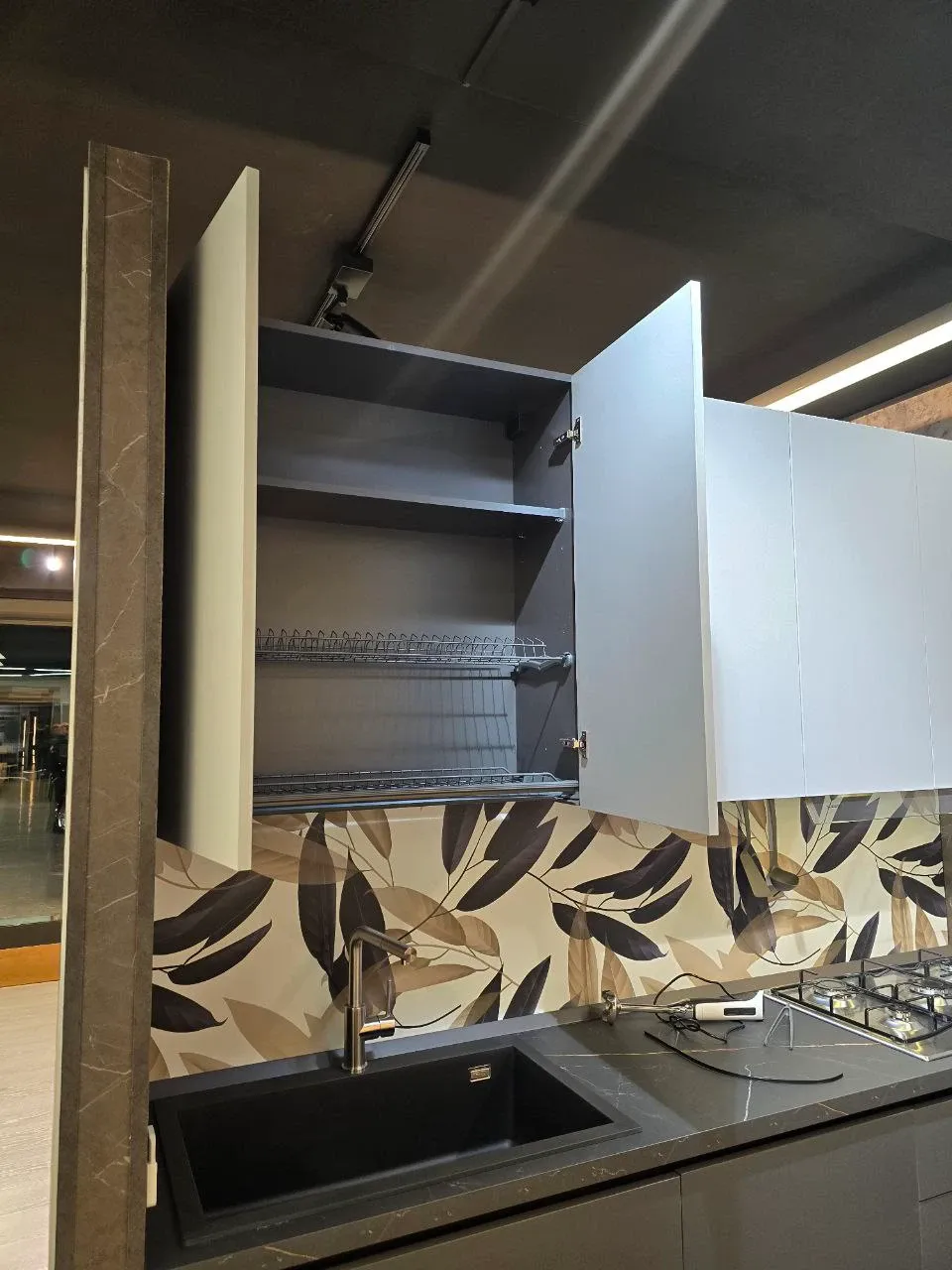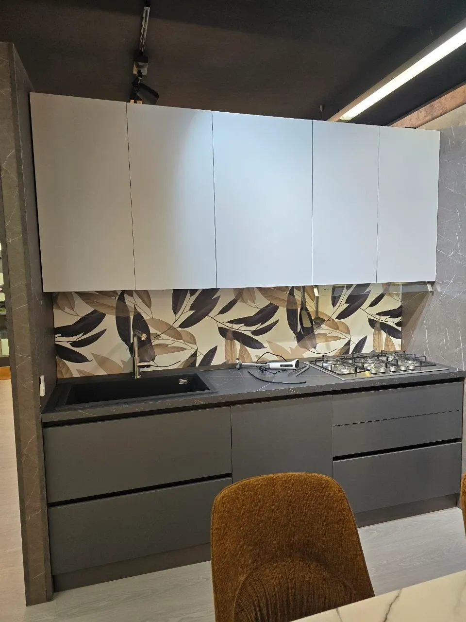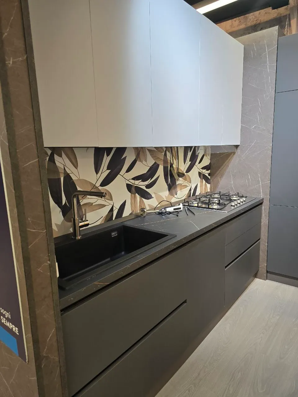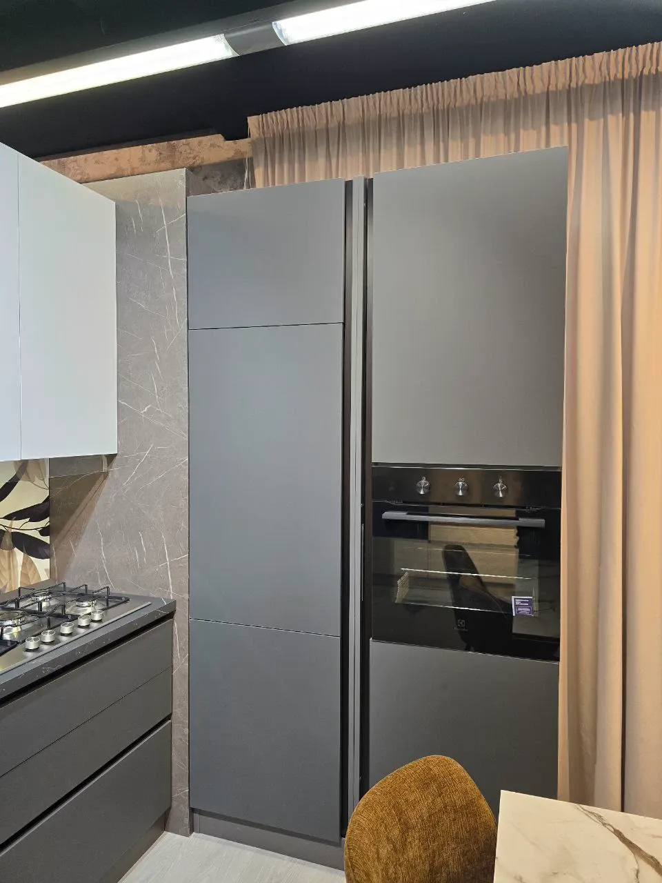 Cucina con gola vera ante PET finitura opaca grigio e piombo, piani top h. cm 4 effetto marmo venato larghezza cm 366 altezza cm 240, pensili h. cm 96.