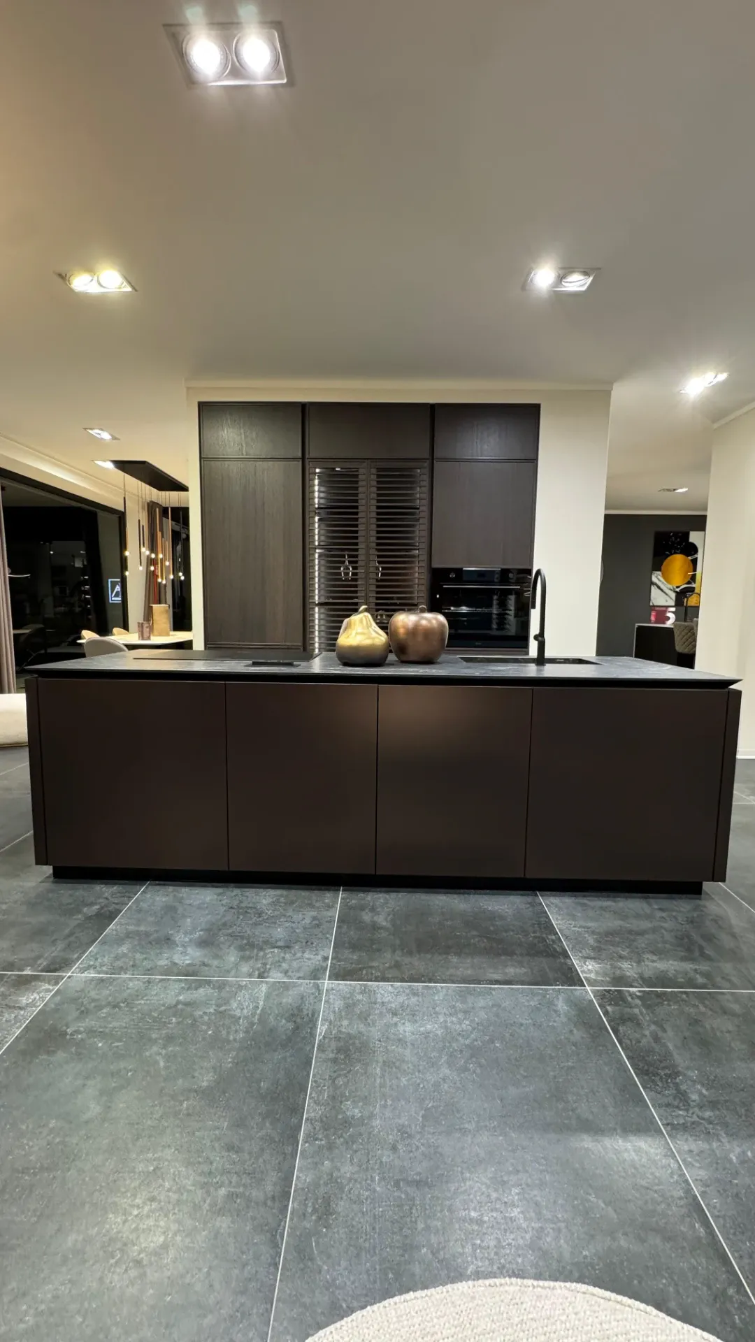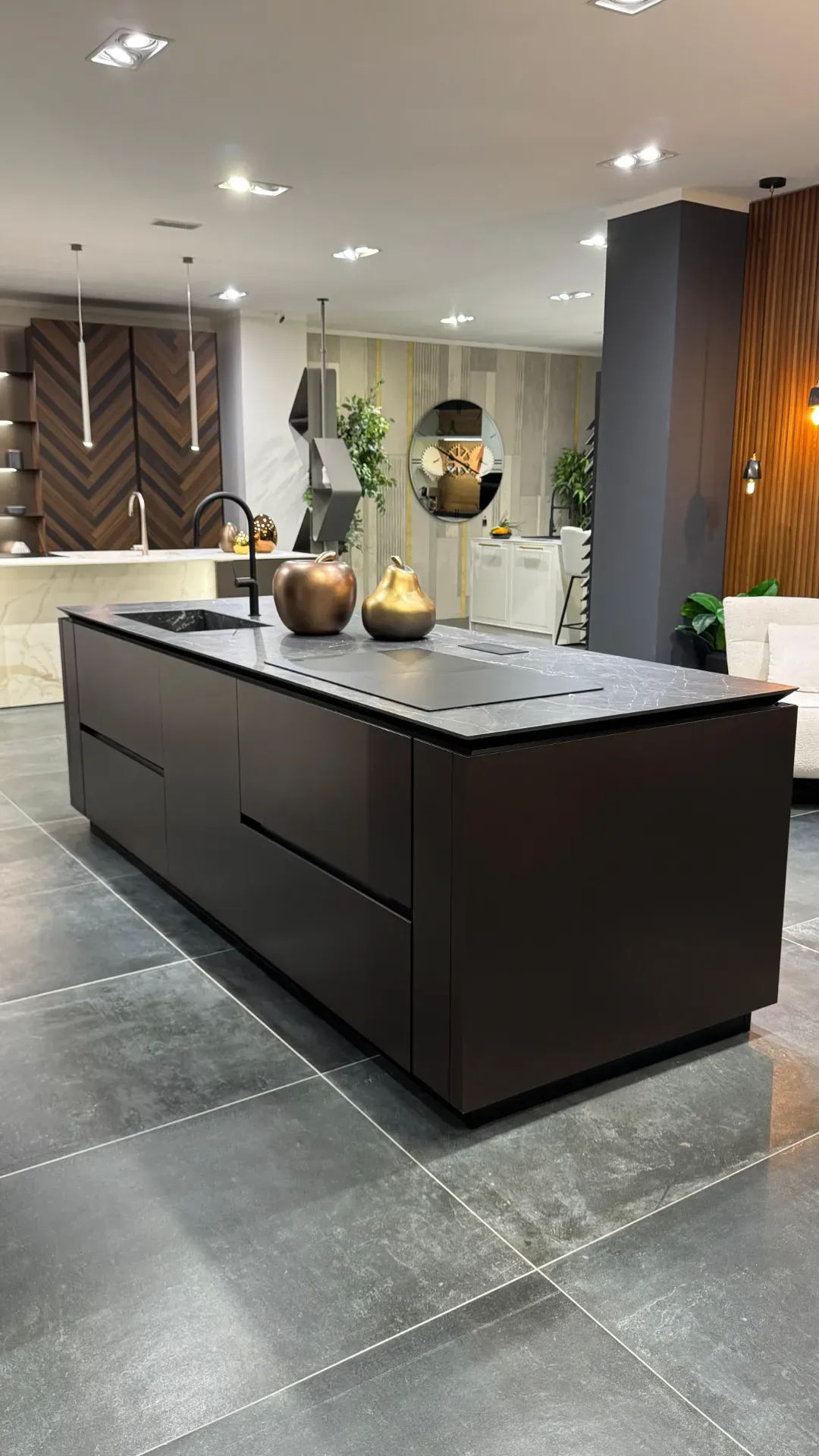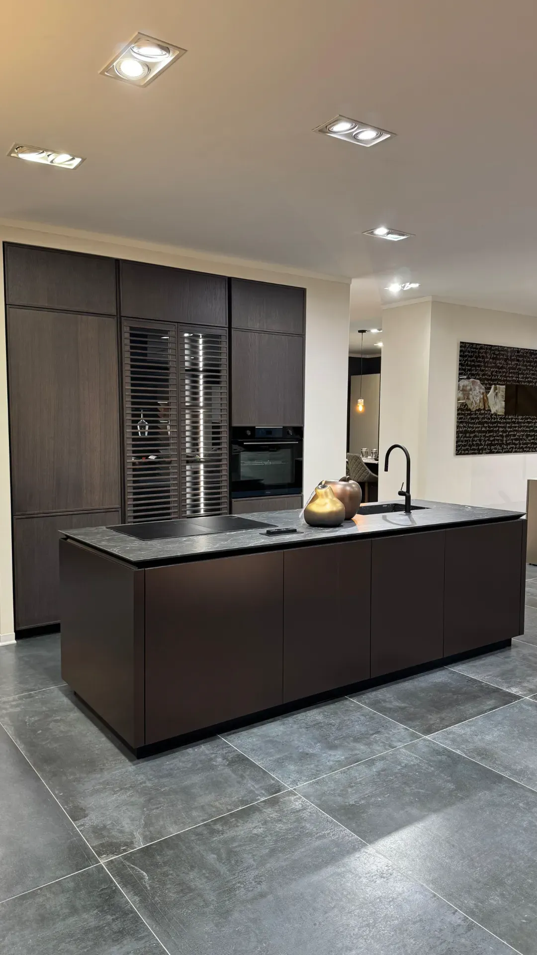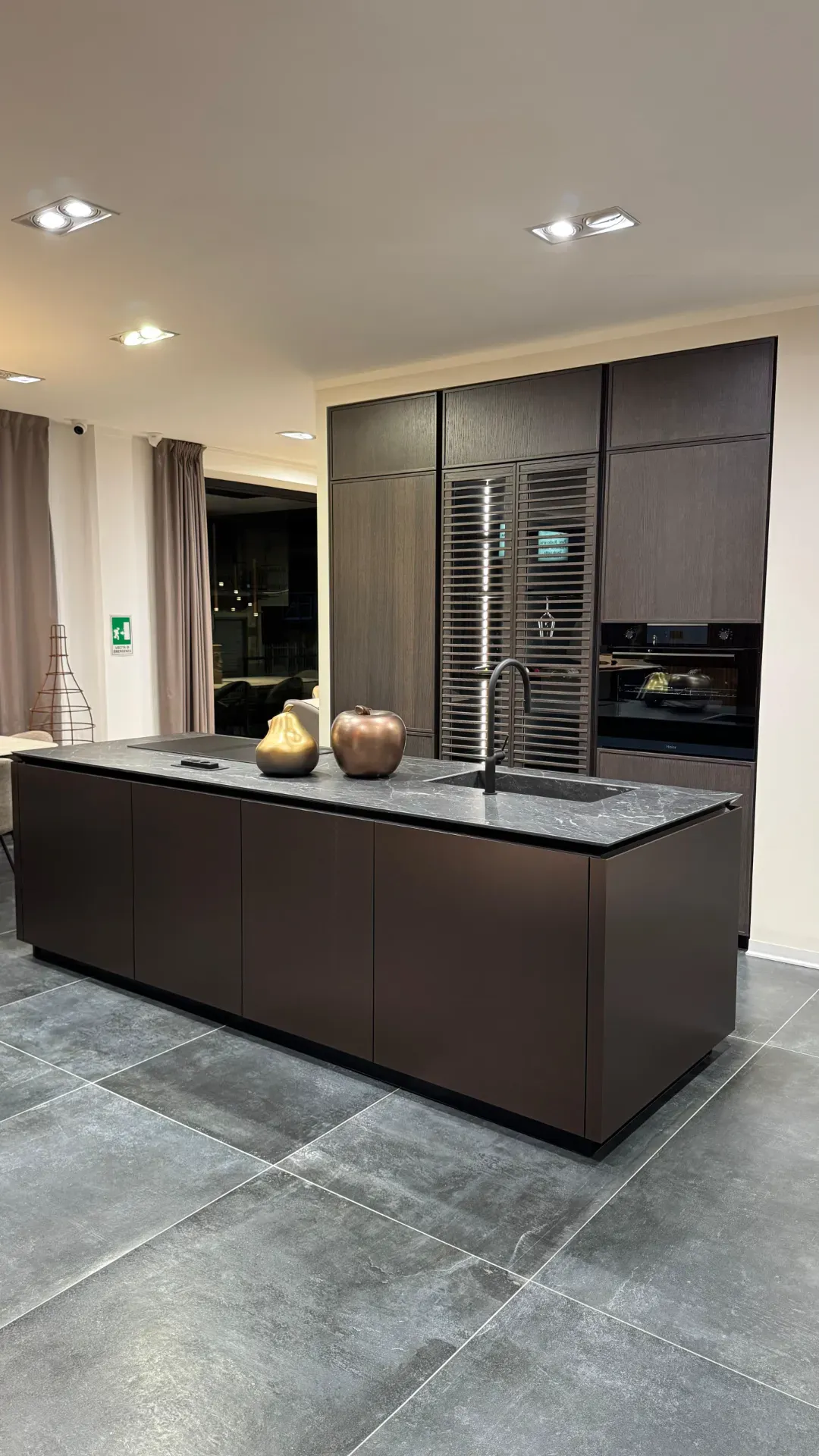 L'isola invece è stata realizzata con ante in finitura tech alluminio brunito, con top e lavabo in gres porcellanato.
