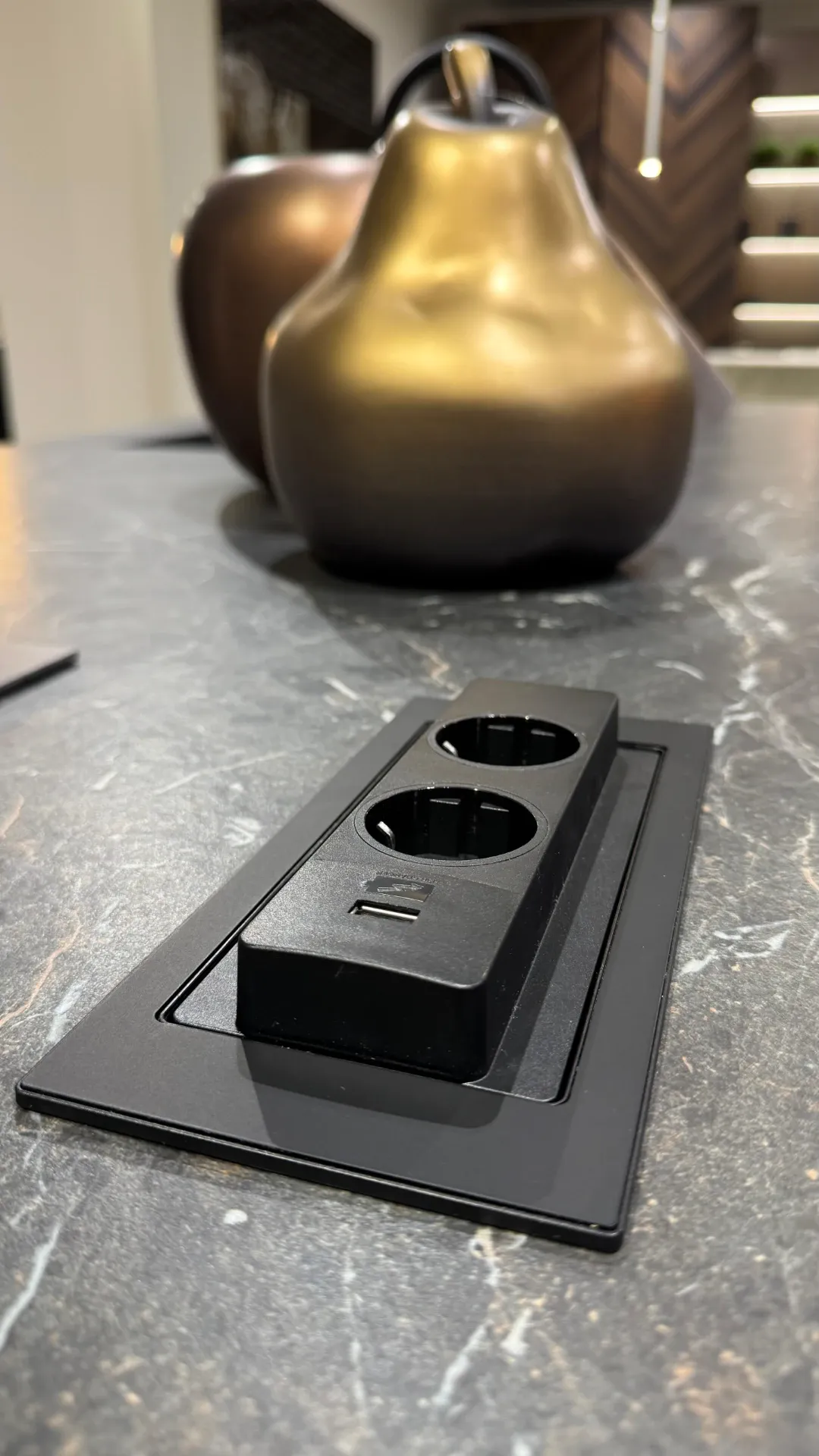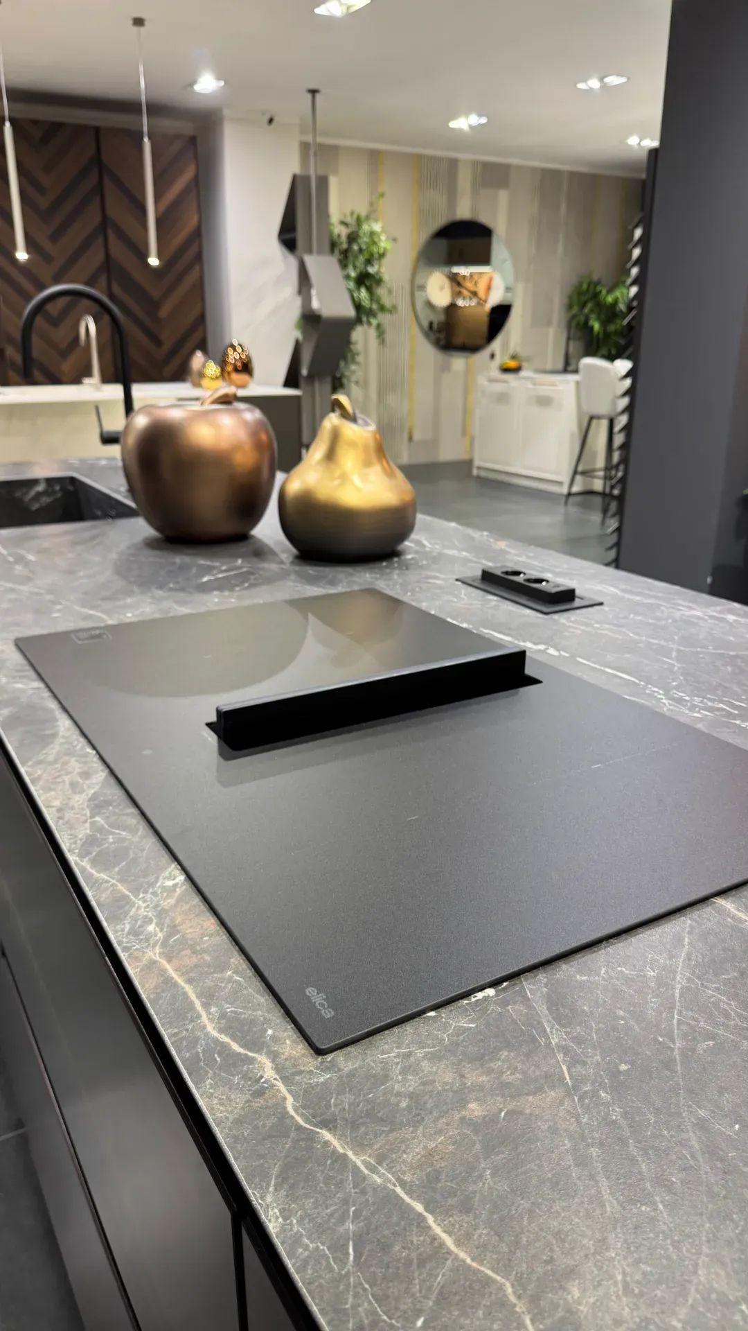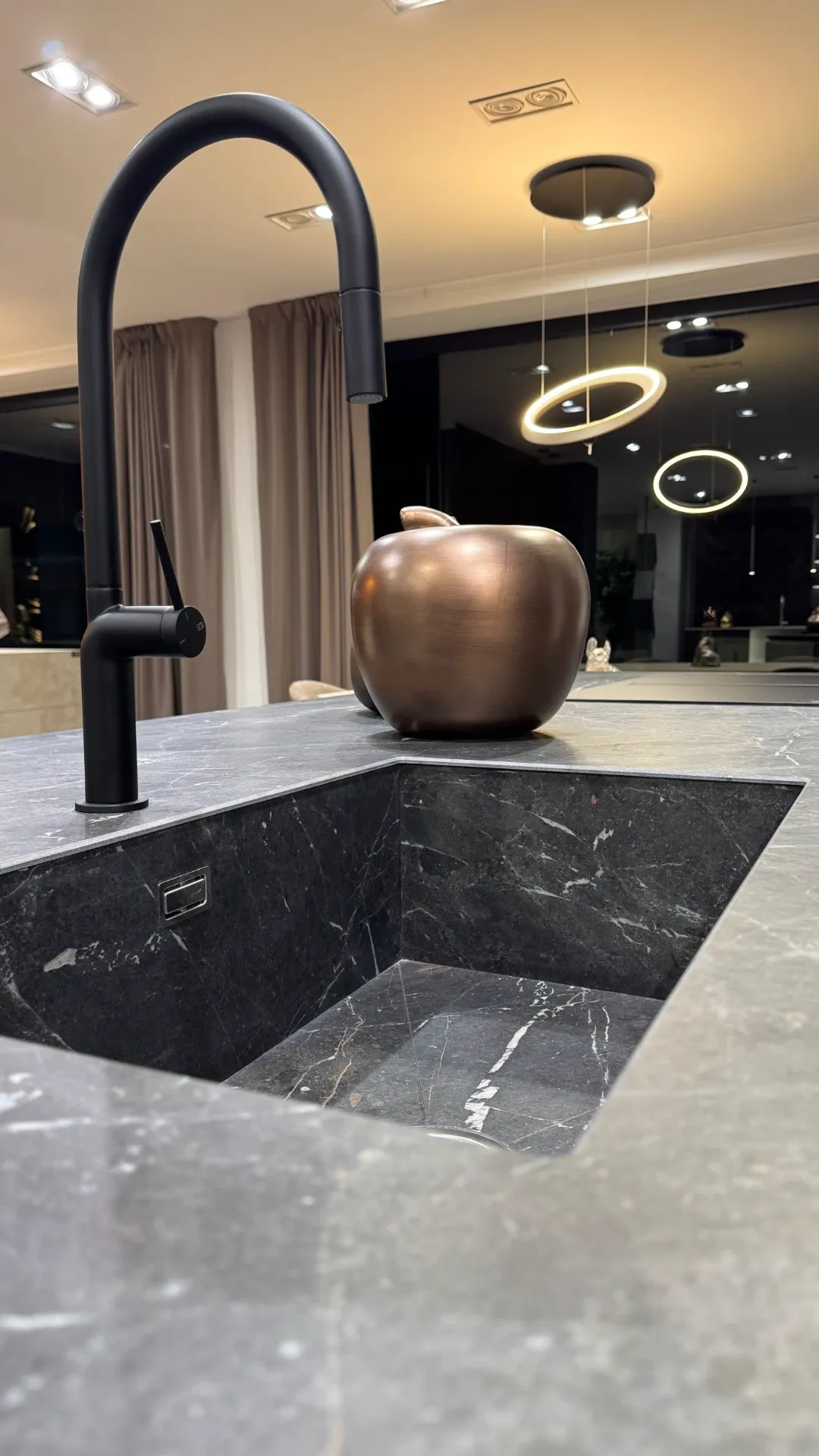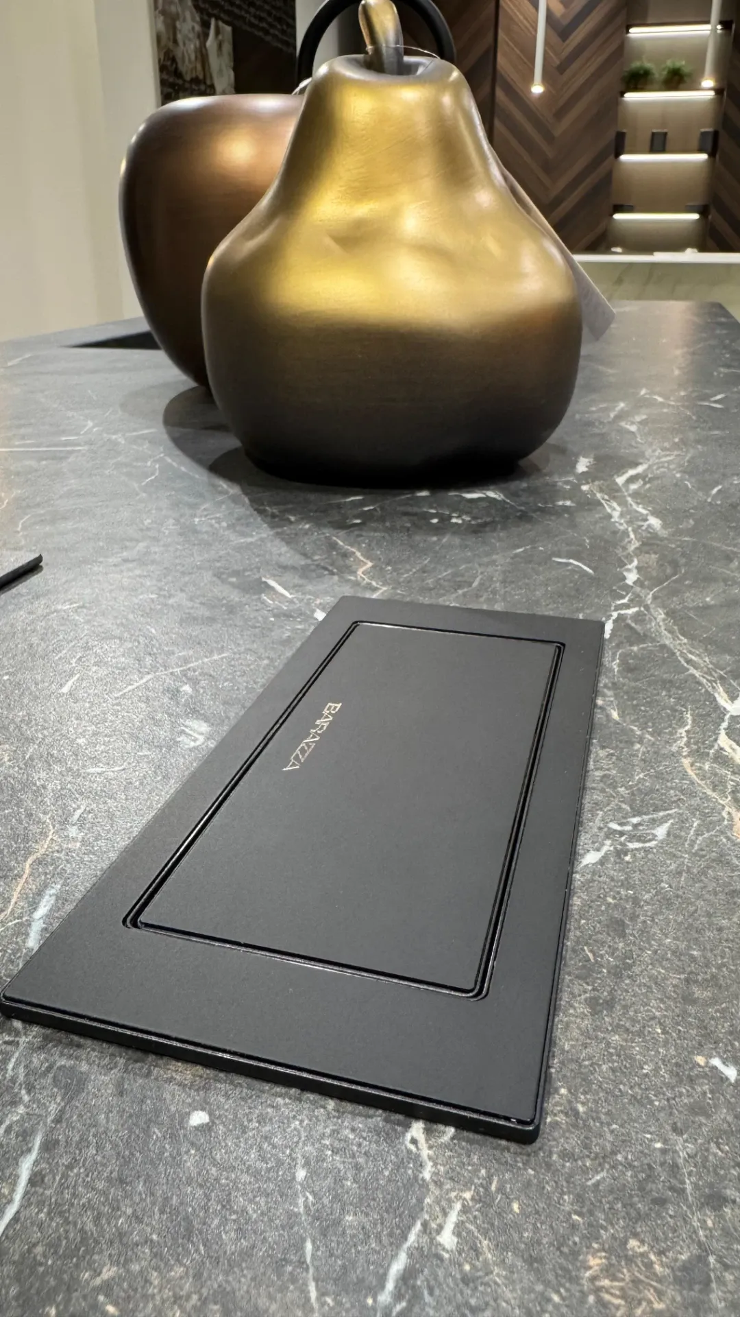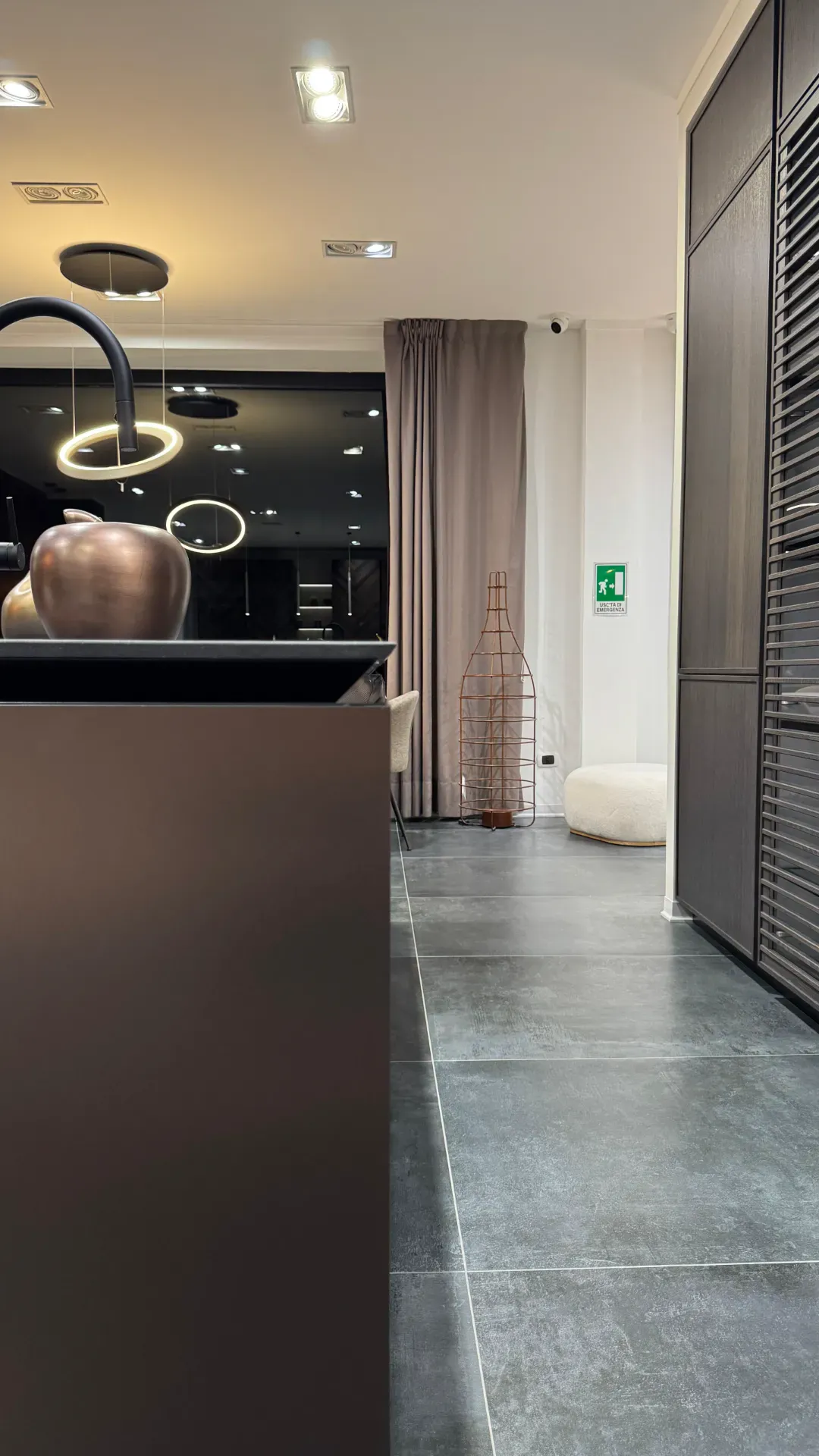 L'isola invece è stata realizzata con ante in finitura tech alluminio brunito, con top e lavabo in gres porcellanato.