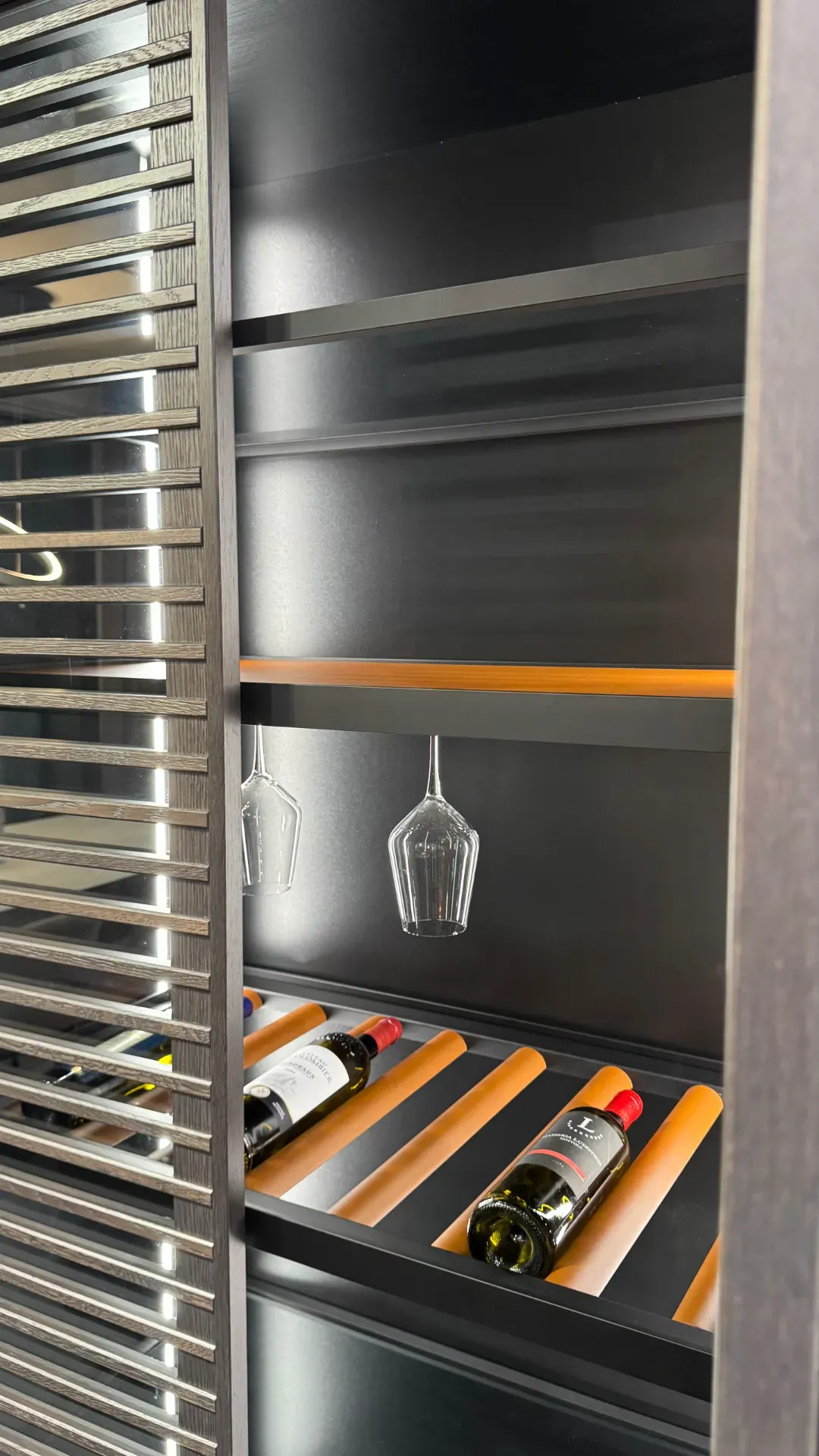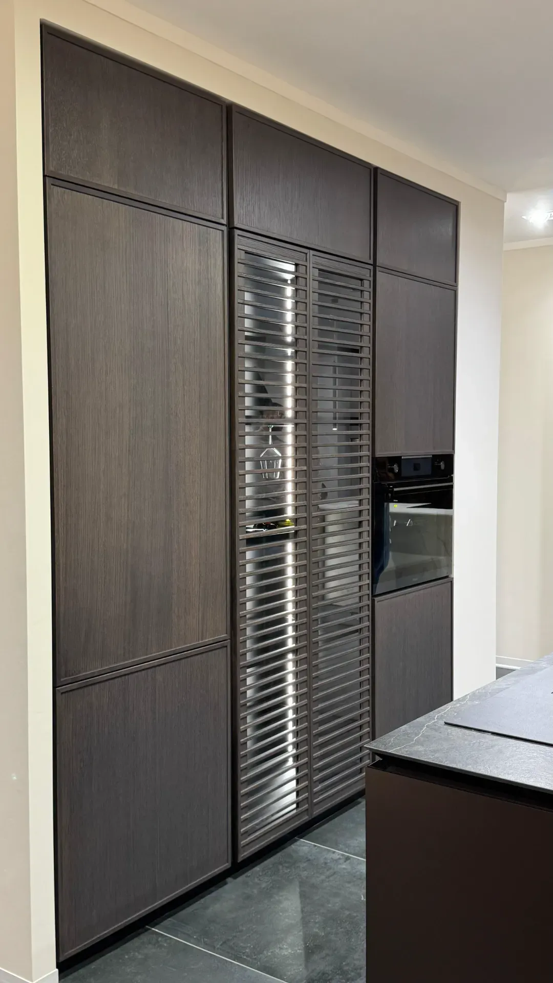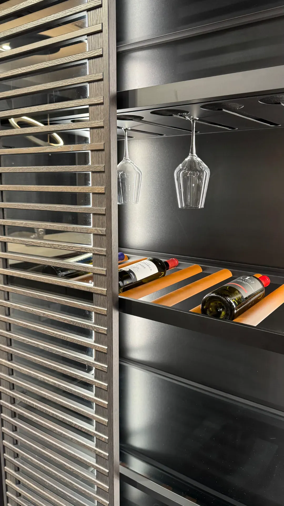 Stupenda cucina dell'azienda Binova cucine, progettata con colonne a tutta altezza in vetro con sistema HILY , nella finitura rovere grigio Londra, con ripiani porta calici e porta bottiglie.