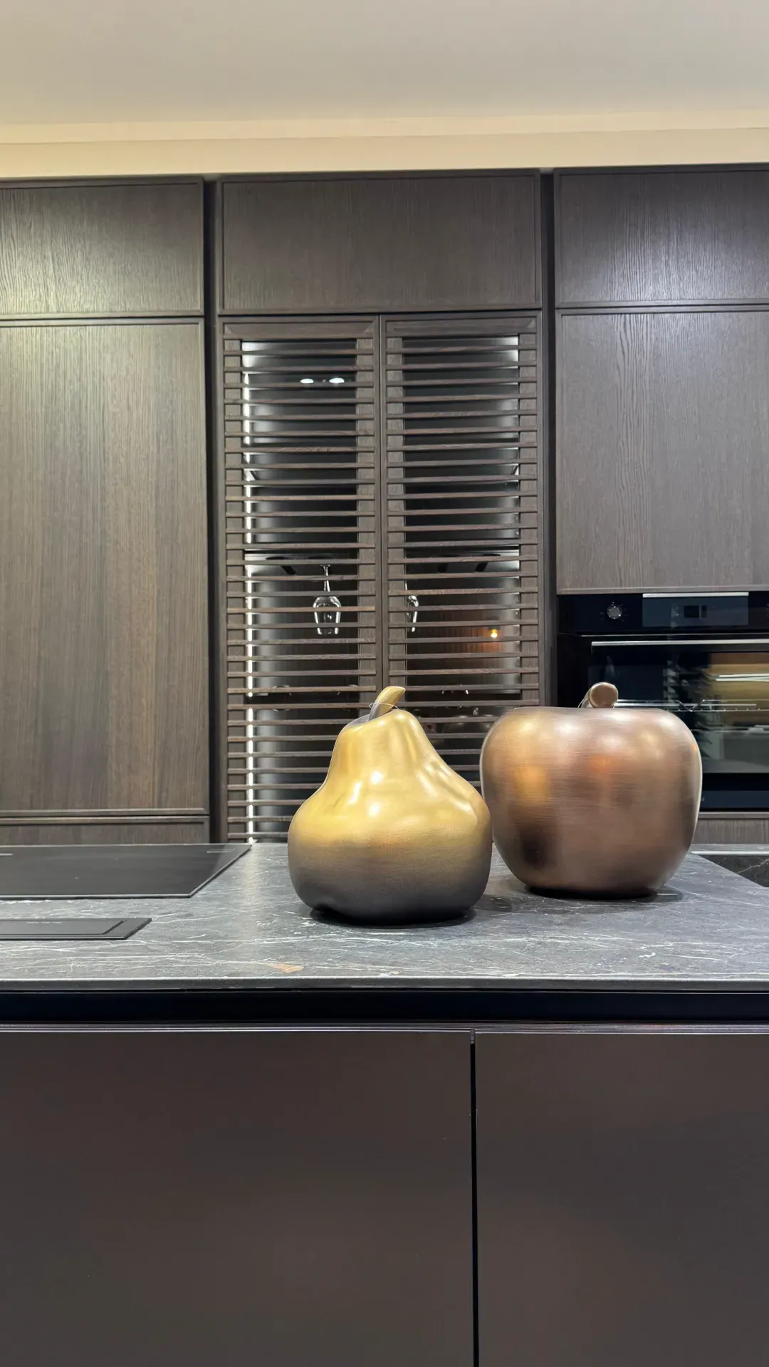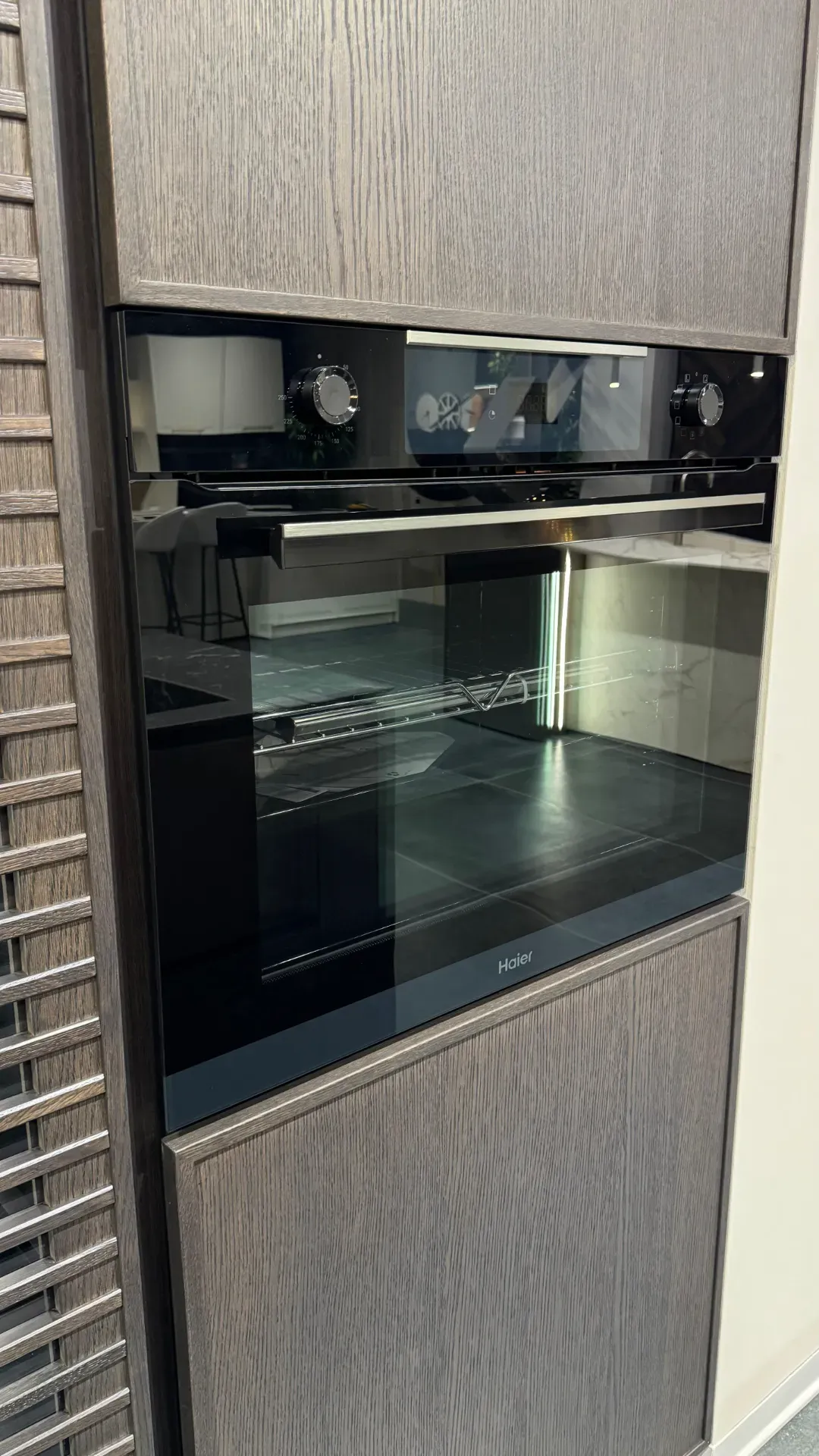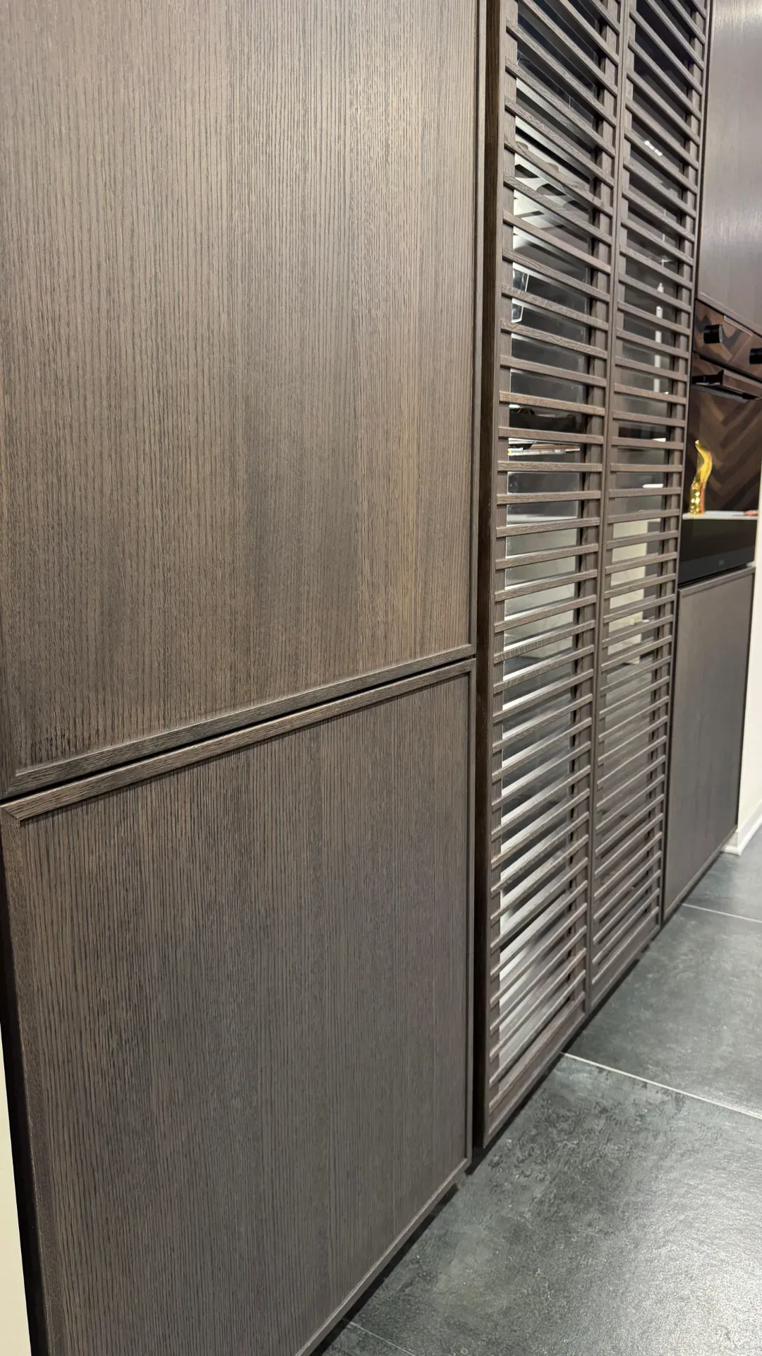 Stupenda cucina dell'azienda Binova cucine, progettata con colonne a tutta altezza in vetro con sistema HILY , nella finitura rovere grigio Londra, con ripiani porta calici e porta bottiglie.