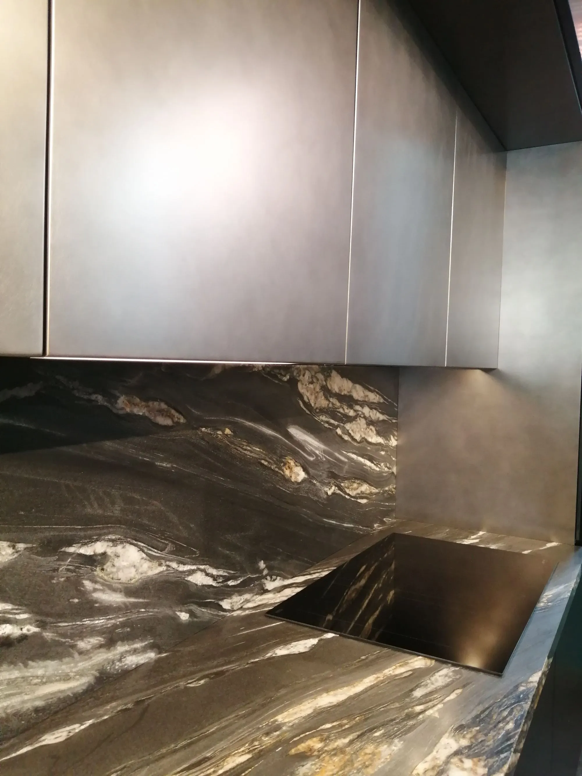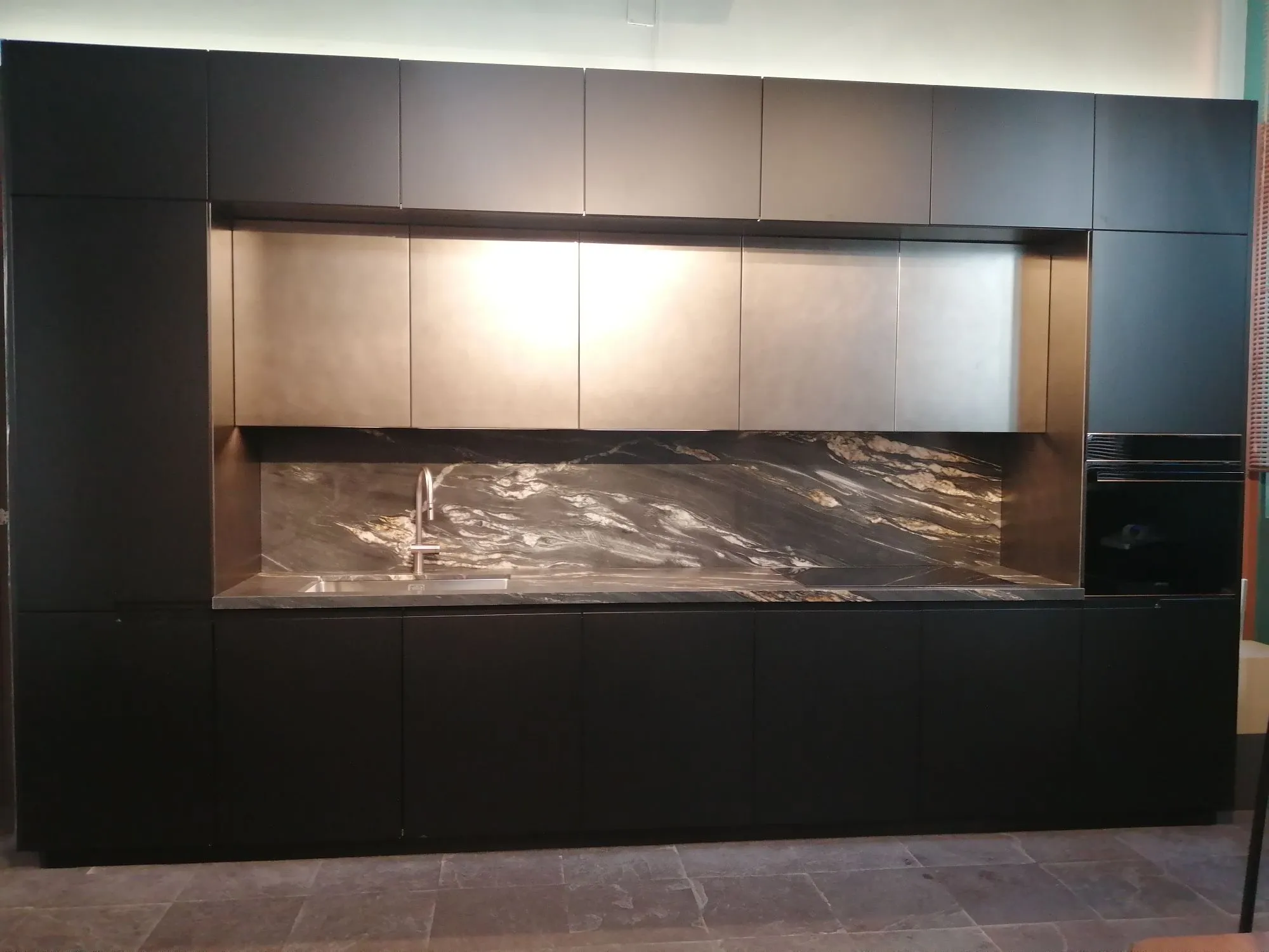 Cucina Antares modello Sistema laccato opaco nero e pensili laccato metallizzato titanio l cm 424,4, h cm 266. Top in marmo Kuroca satin sp cm 4 completa di schienale Elettrodomestici: lavastoviglie Smeg modello STL323BL, piano cottura Smeg modello SIM 6864R, frigo modello Smeg C8194TNE H cm 190, forno Bosch HBA234BAO, lavello sottotop Barazza cm 7, miscelatore Gessi Inedito finox