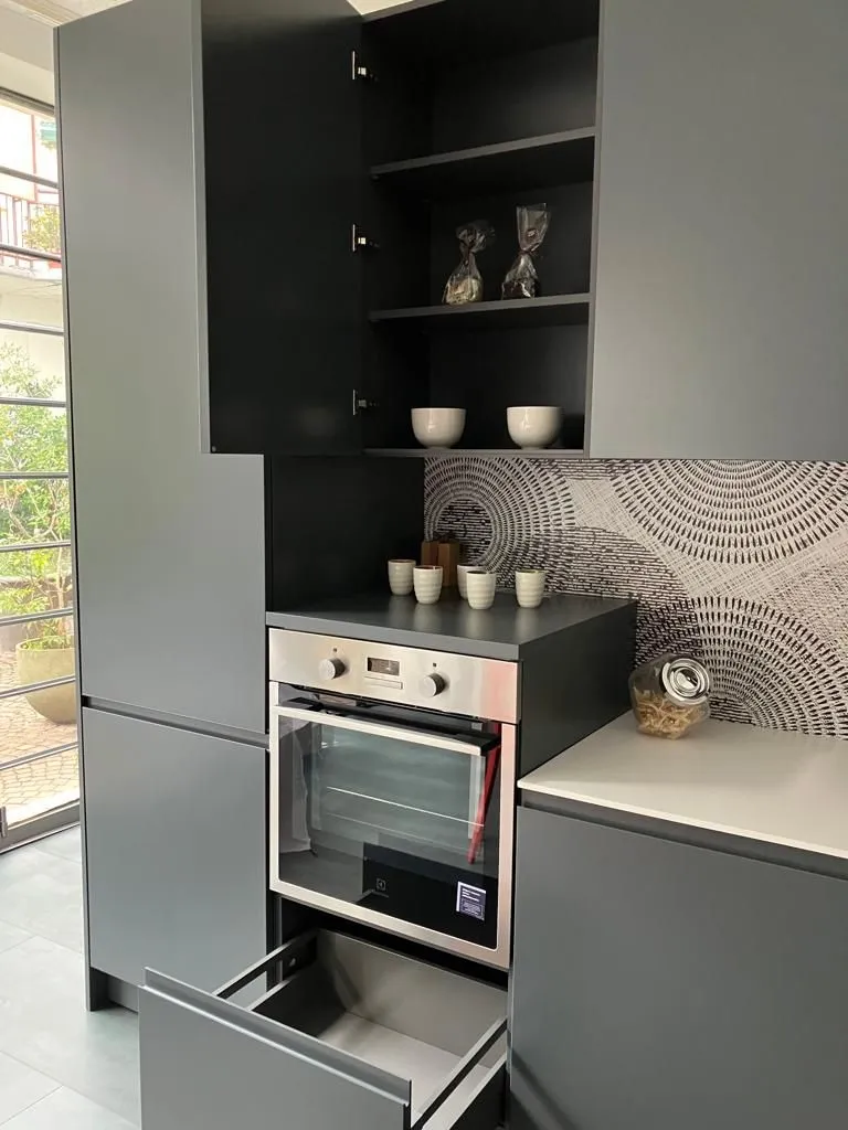 La cucina LINE di Astra è in finitura laccato opaco colore grigio e piano lavoro in Betacrilato opaco Classic White con lavandino e gocciolatoio integrati.