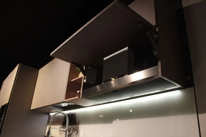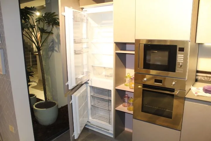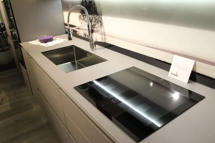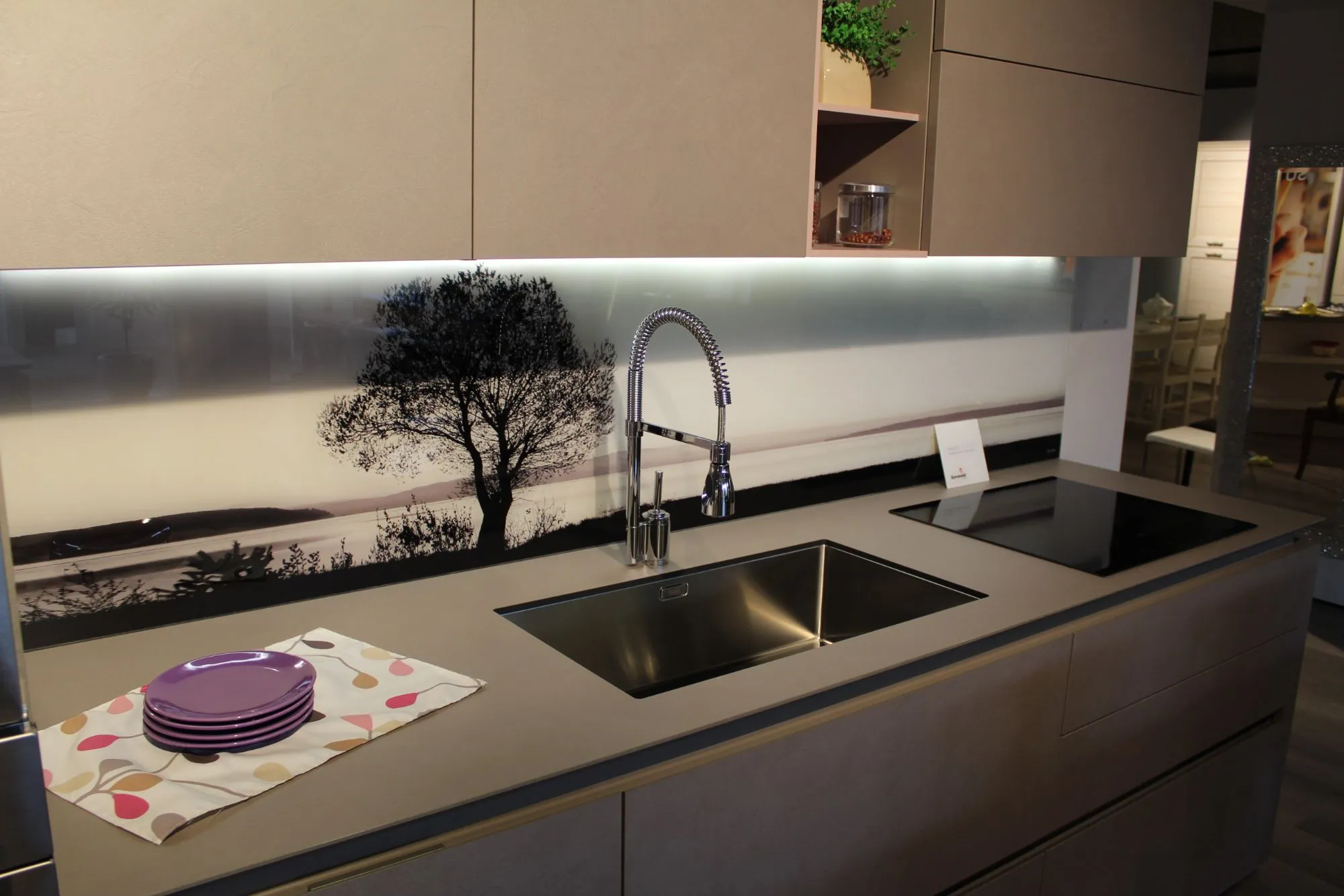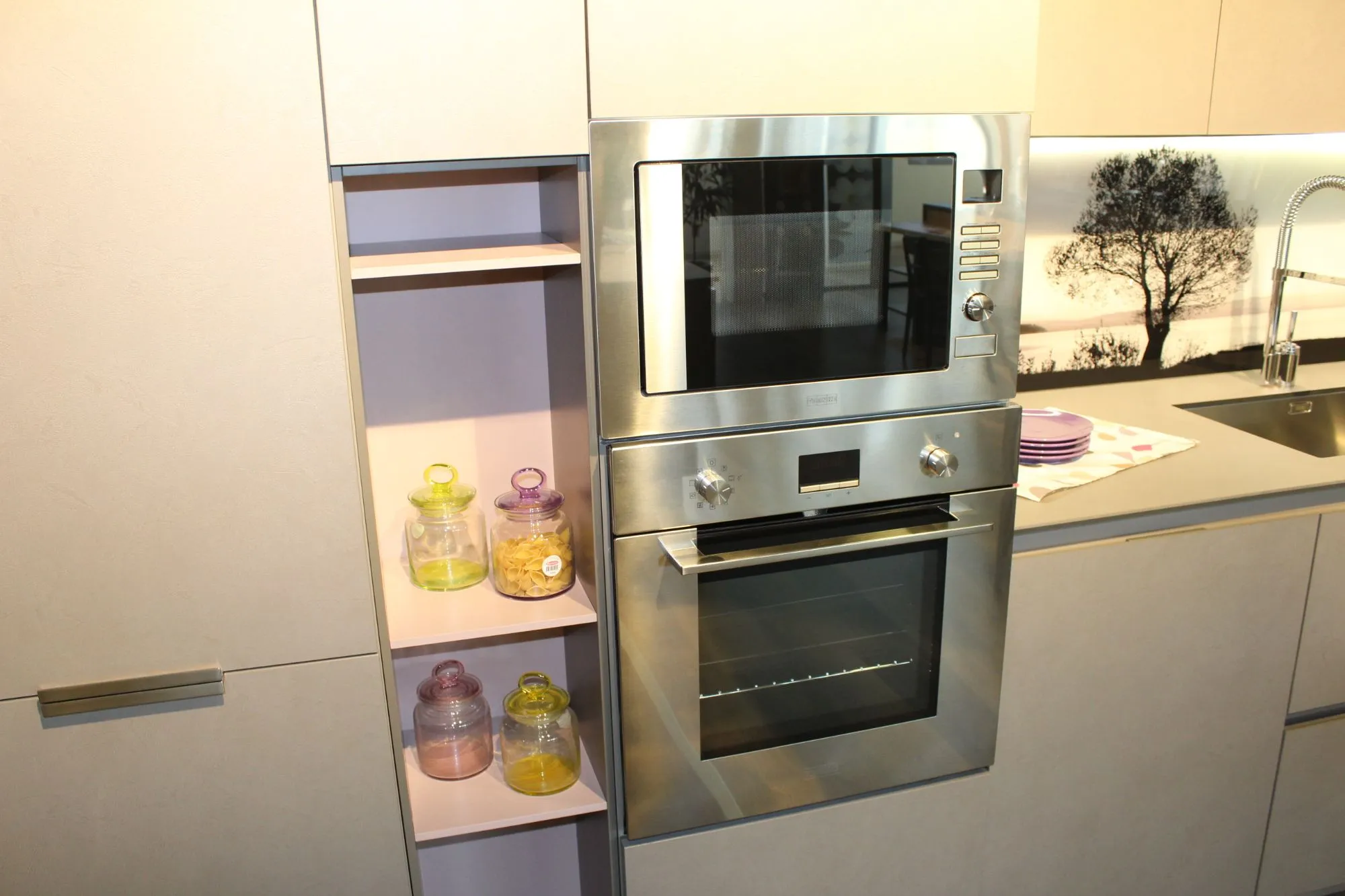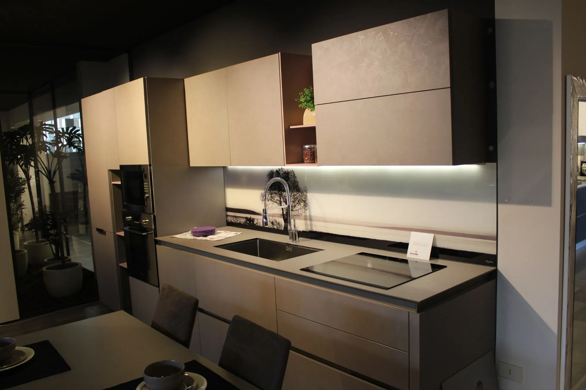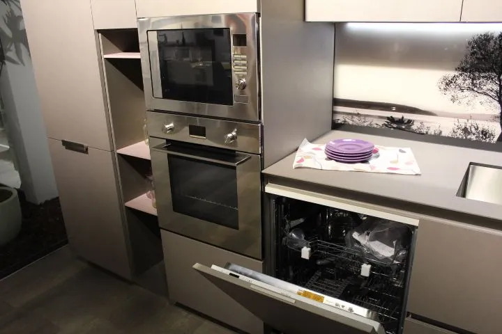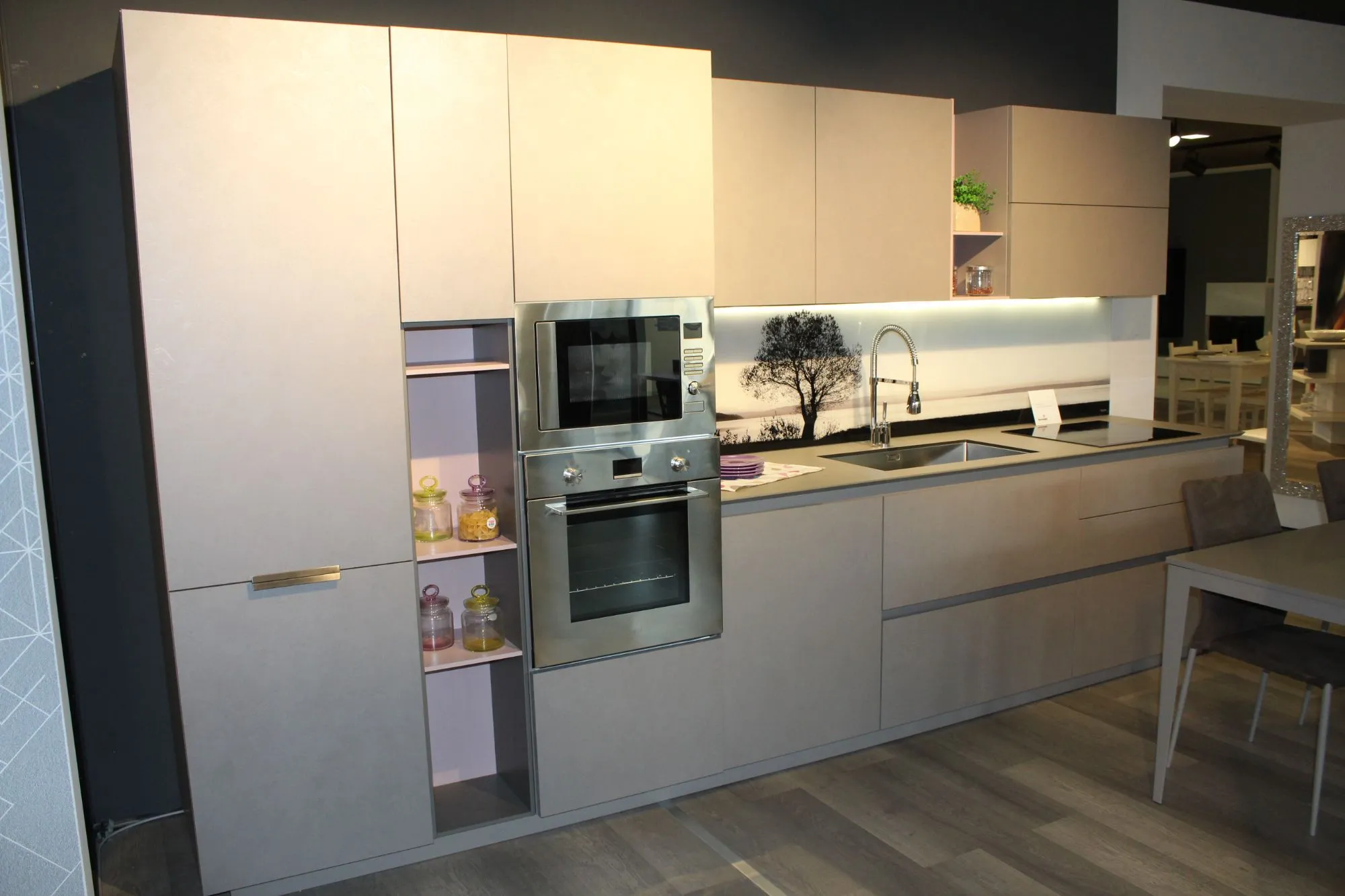 Composizione cucina lineare Euromobil modello LAIN 33 con frontali TSS color Smoke e fianchi a vista personalizzati, elementi a giorno laccati. Completa di elettrodomestici e luce led sotto-pensile. dimensione della composizione: lungh. 390 x prof. 60 cm.