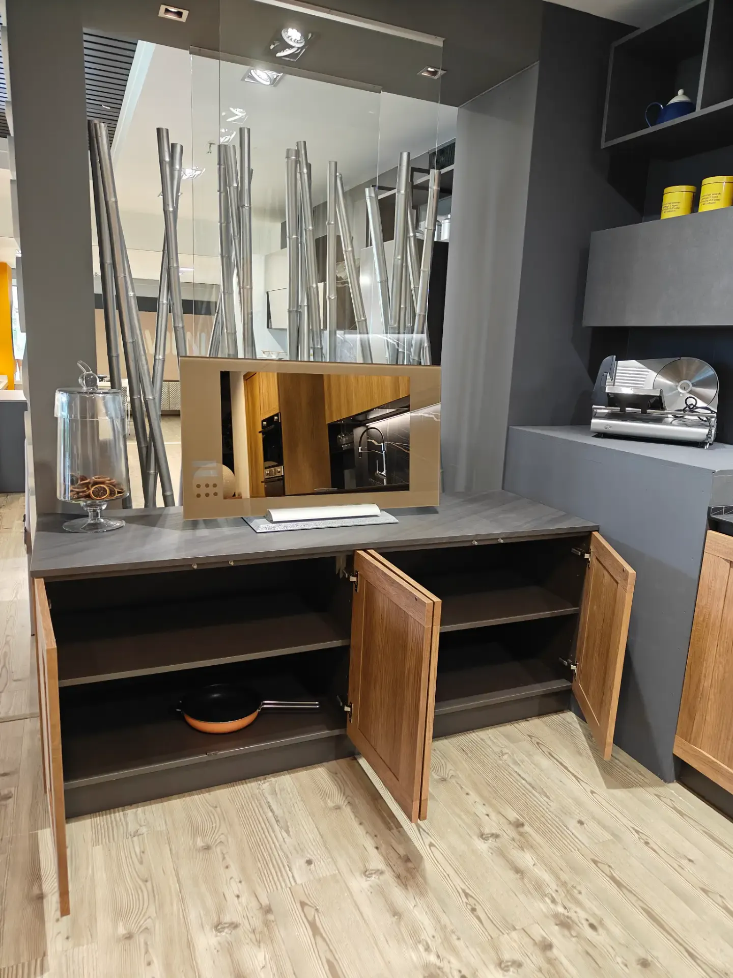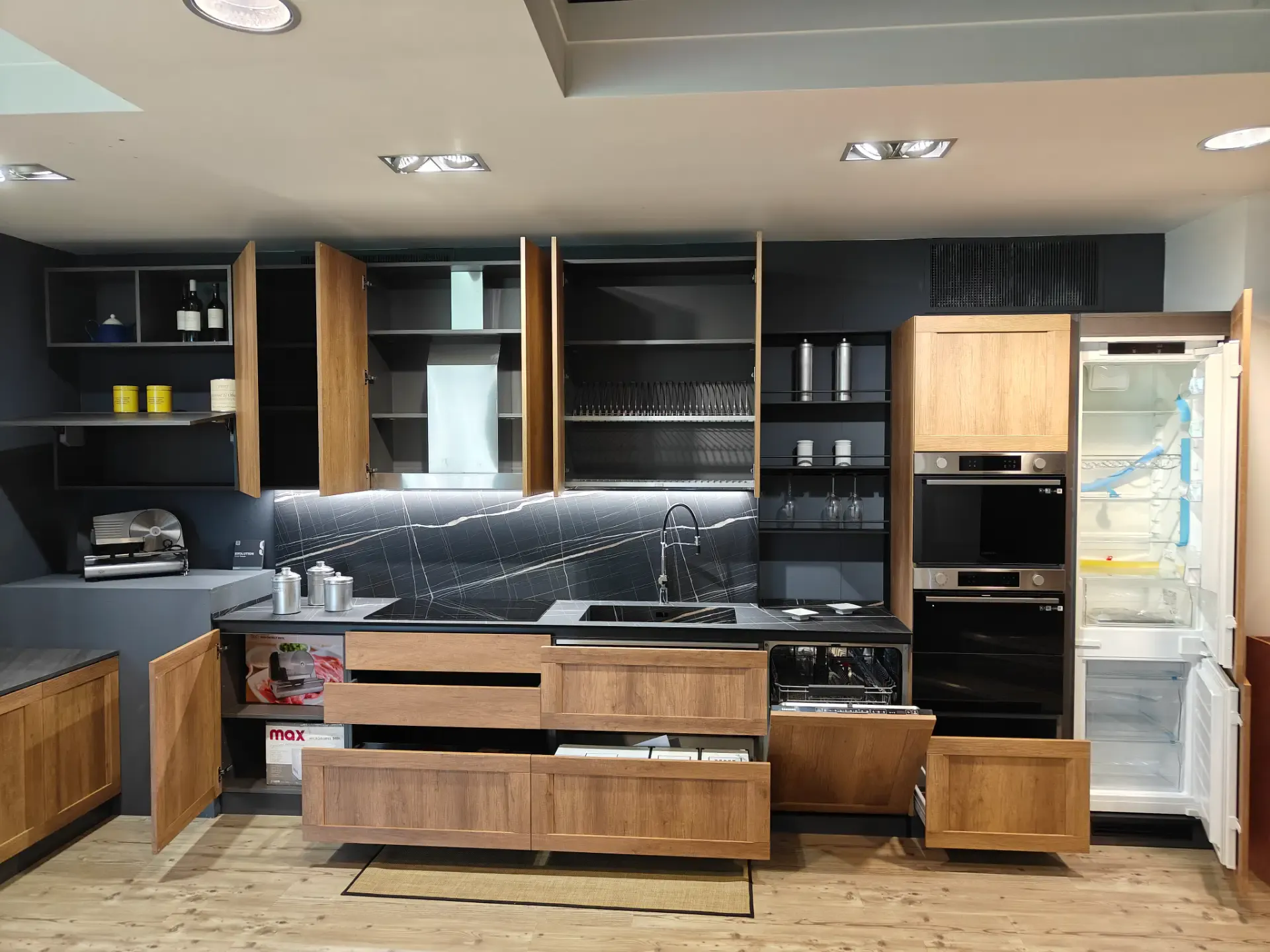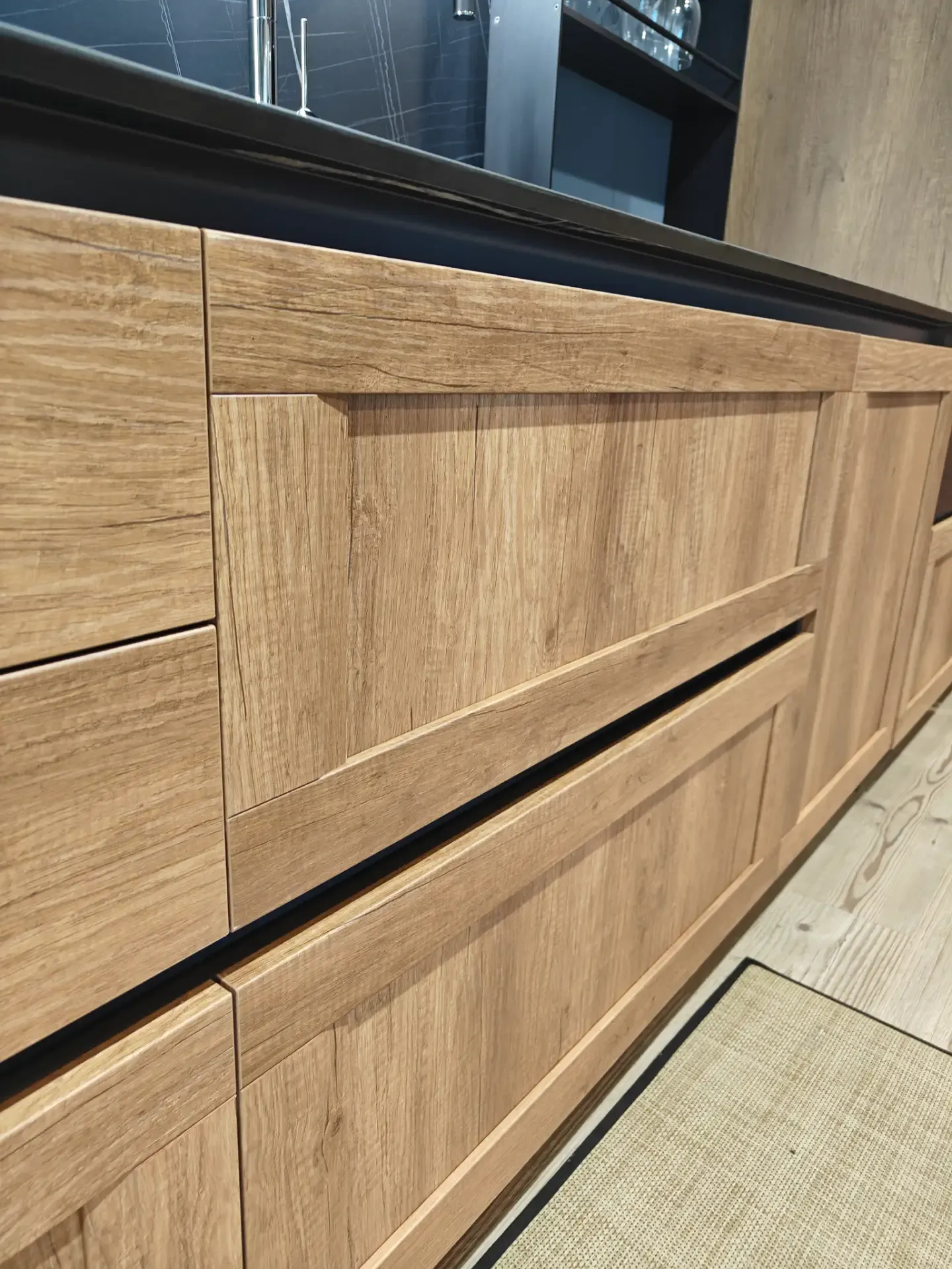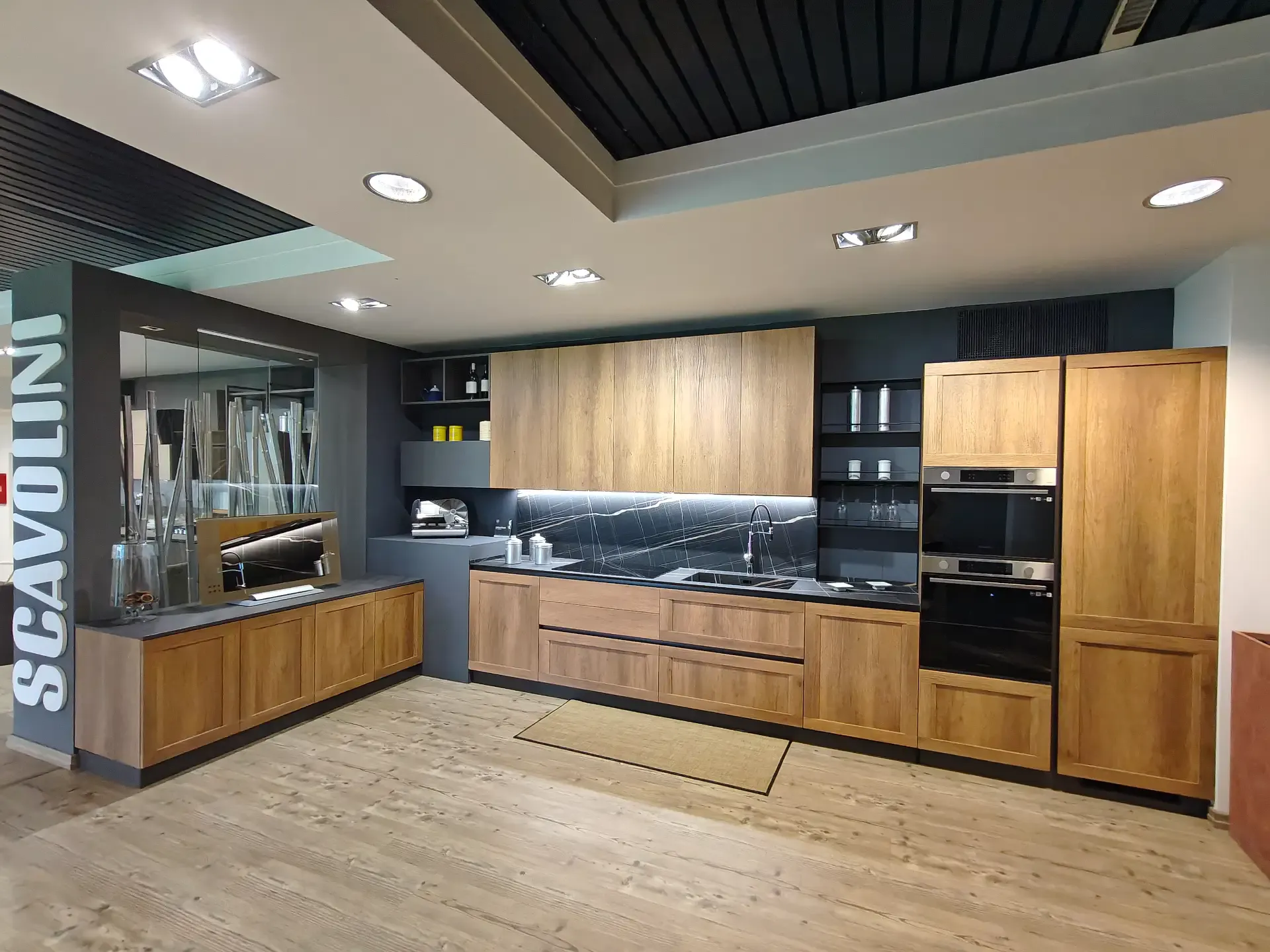 Cucina lineare Regolaby Scavolini, colore Rovere Land con profili grigio ferro, basi con anta telaio e pensili versione liscia.