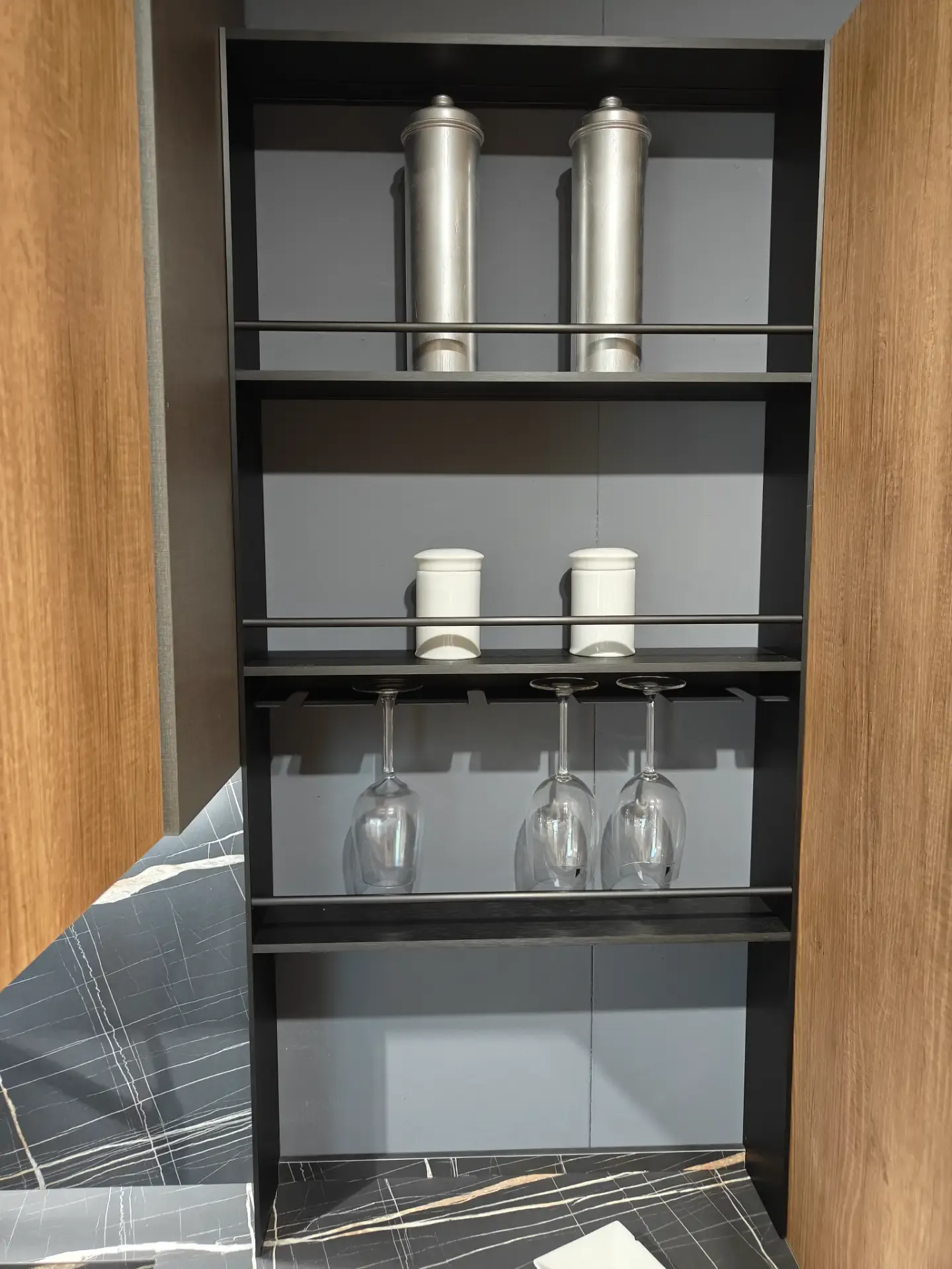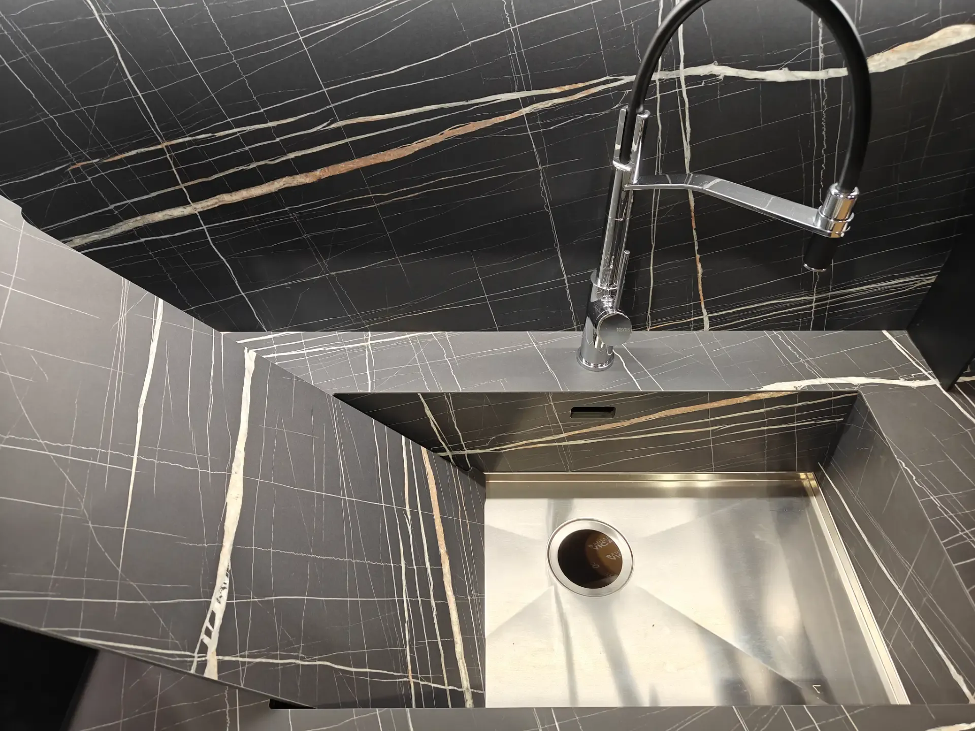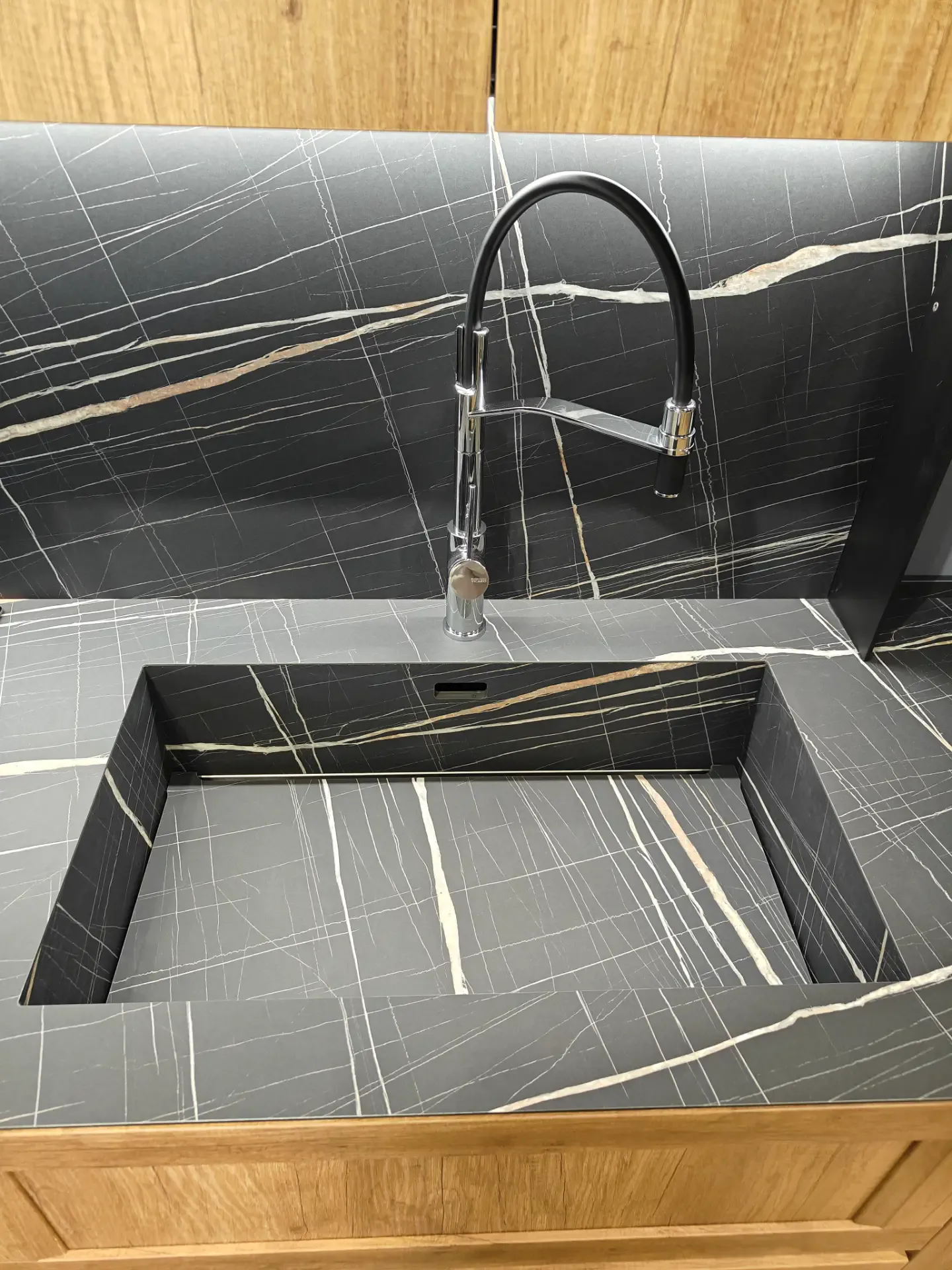 Piano in HPL stratificato finitura Marmo Nero Afghano con vasca integrata in HPL con fonfo acciaio inox e vassoio di copertura e miscelatore Vicario.