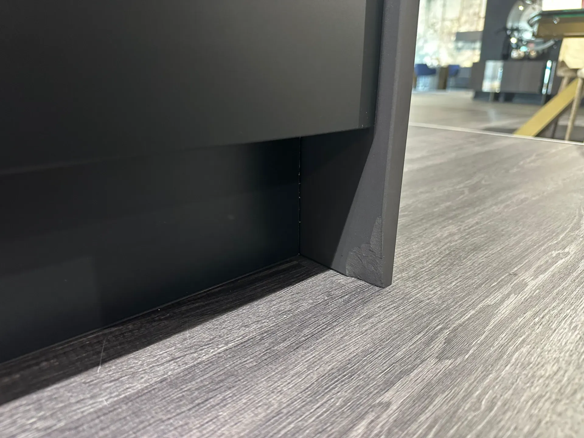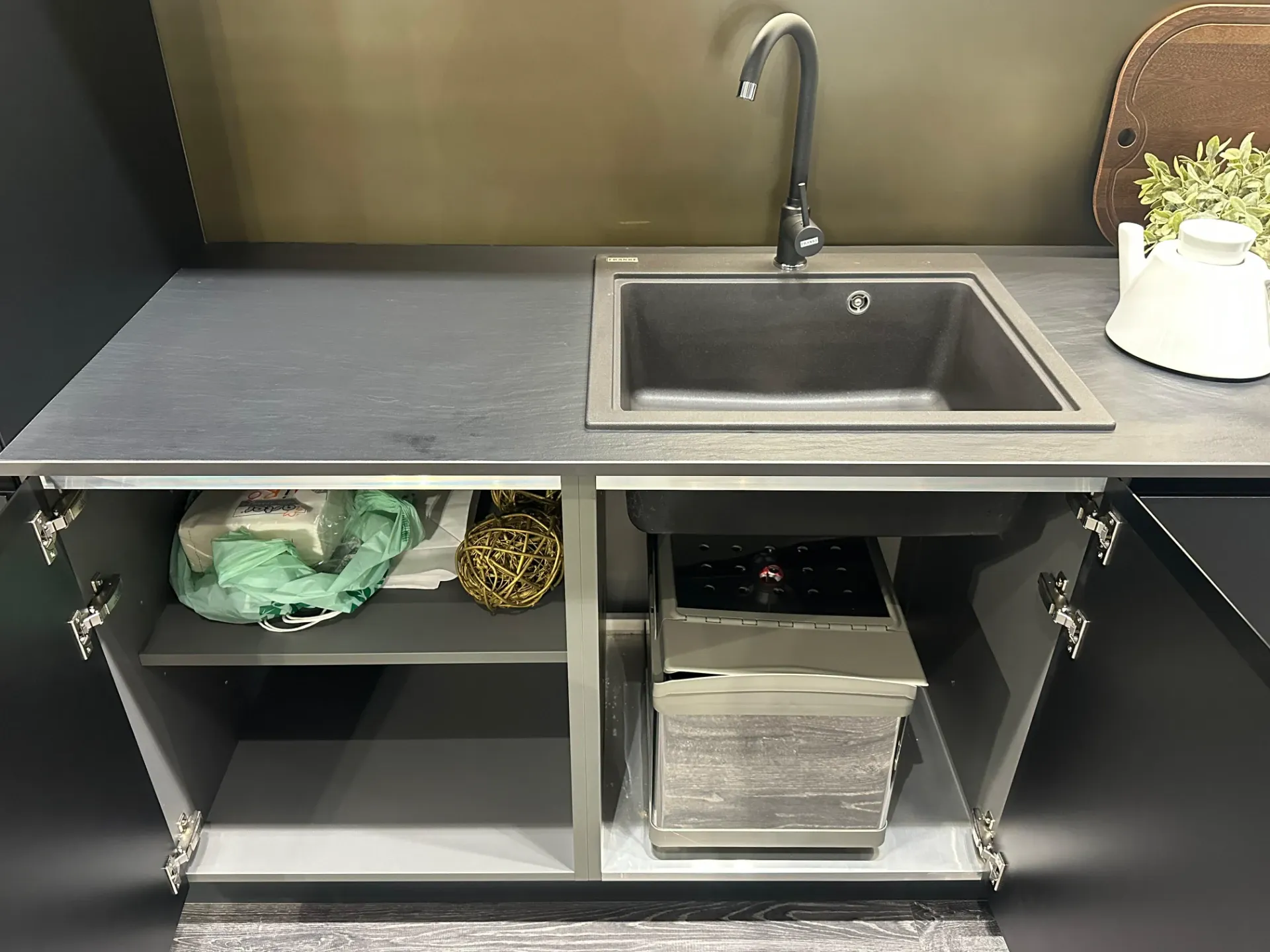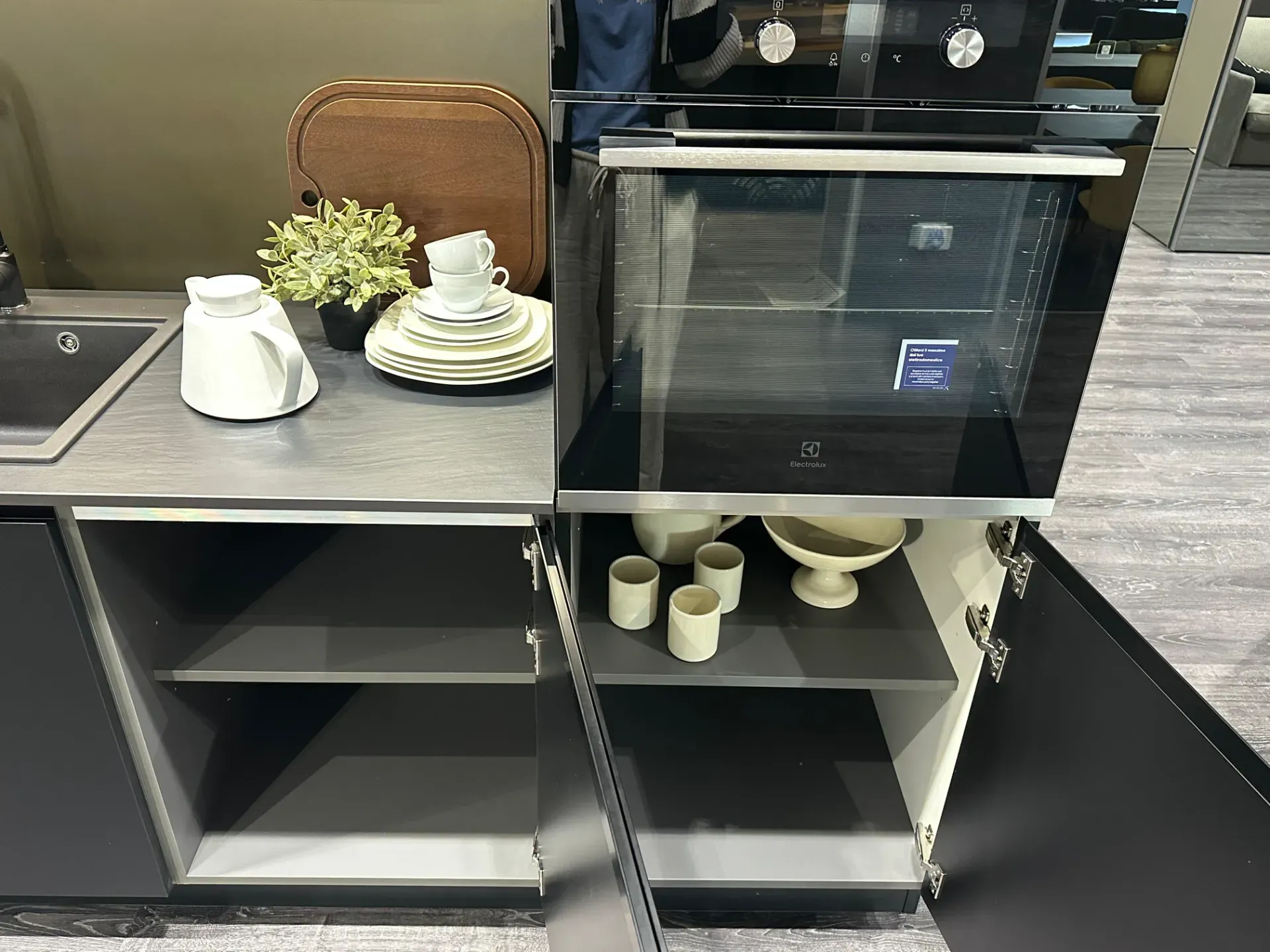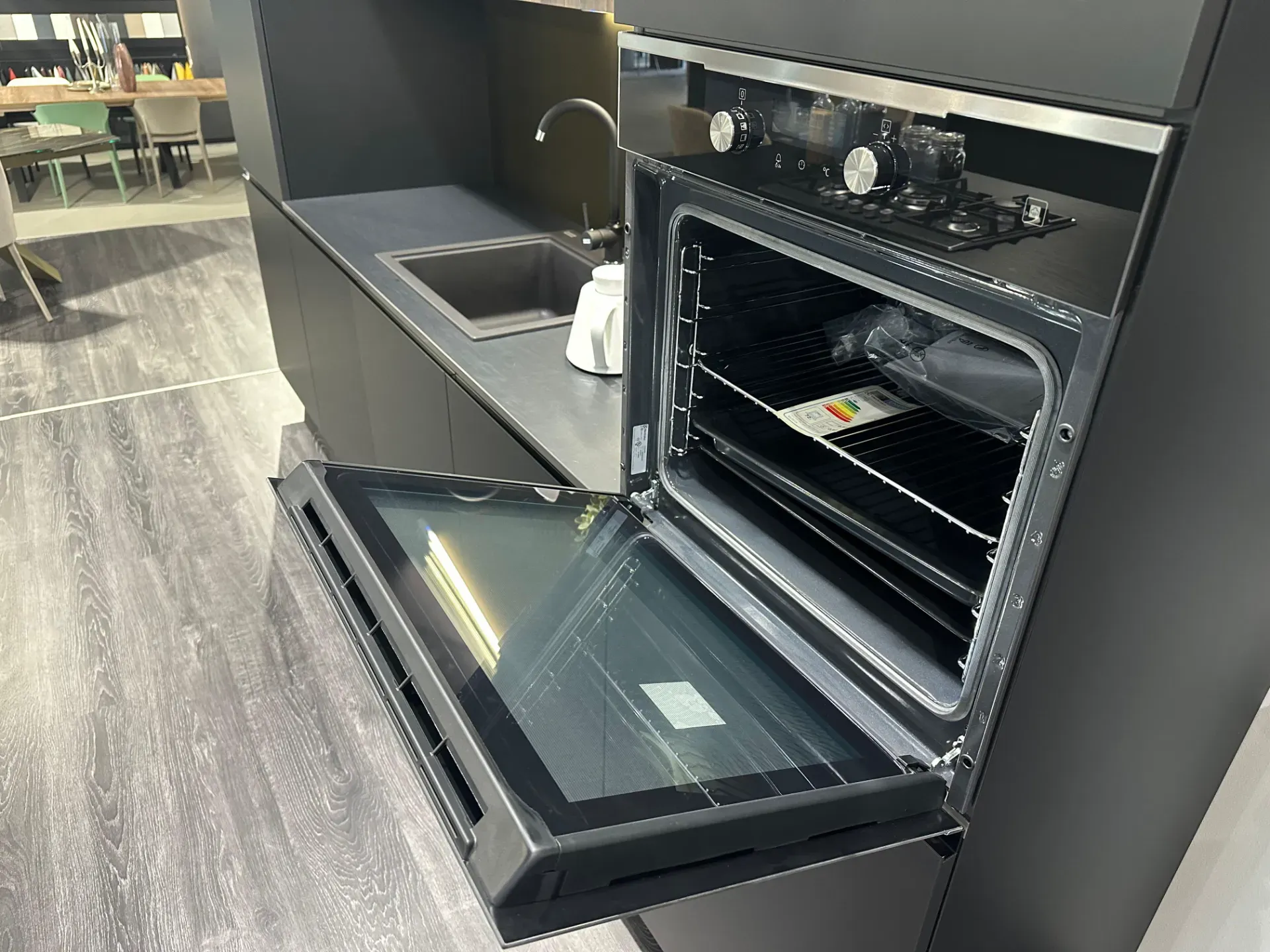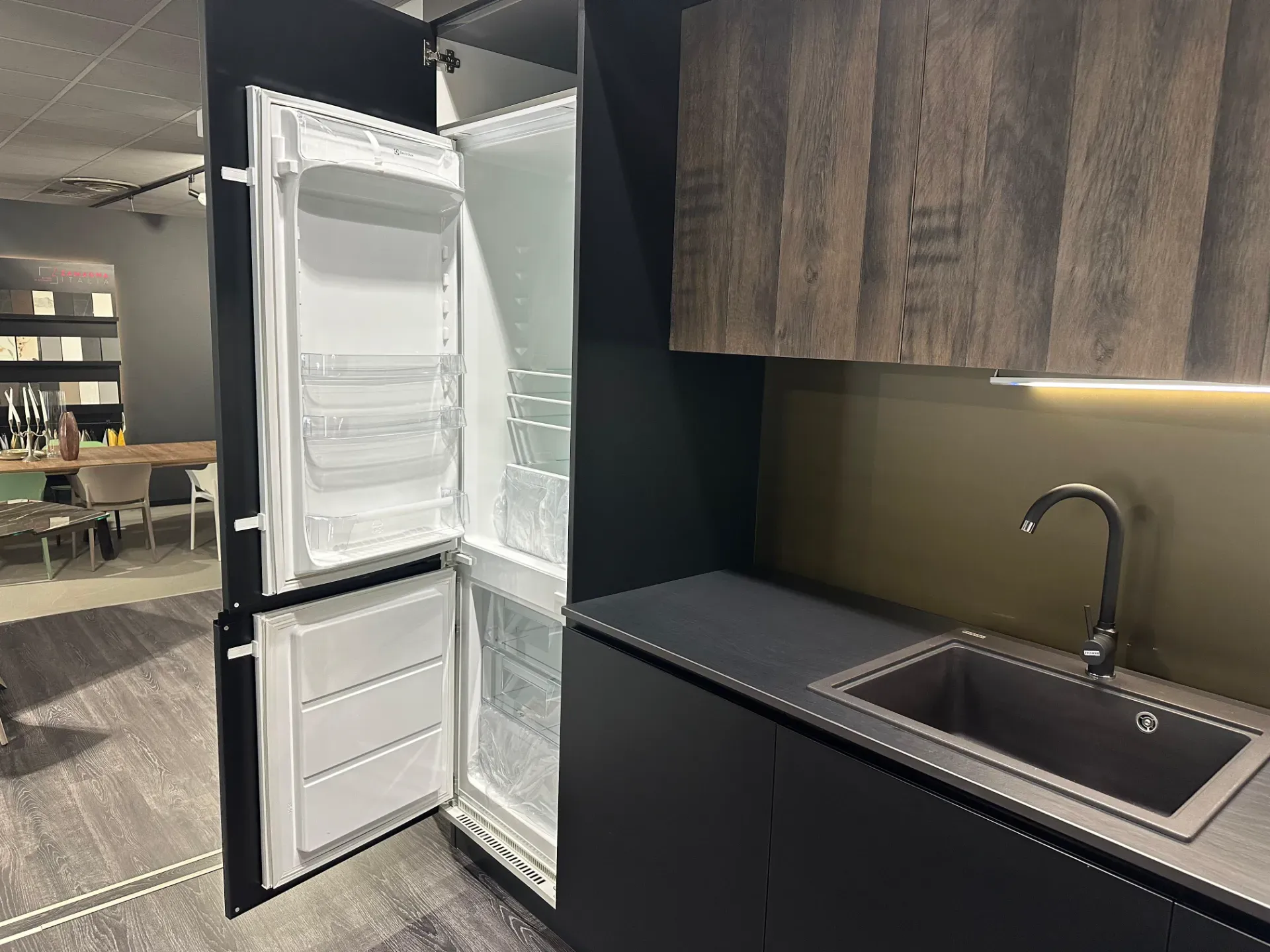 Cucina composta da parete lineare L.300 x H.264 x P.64 in laminato nero con zona lavello forno e frigorifero.