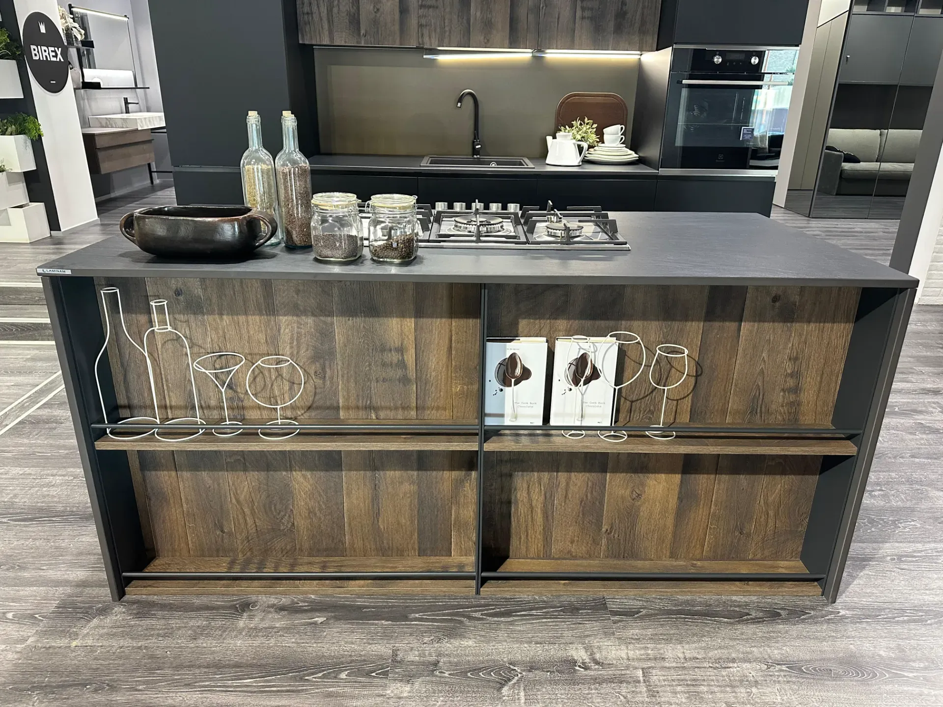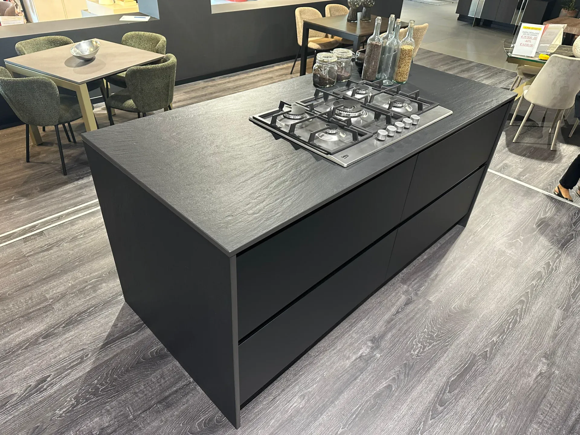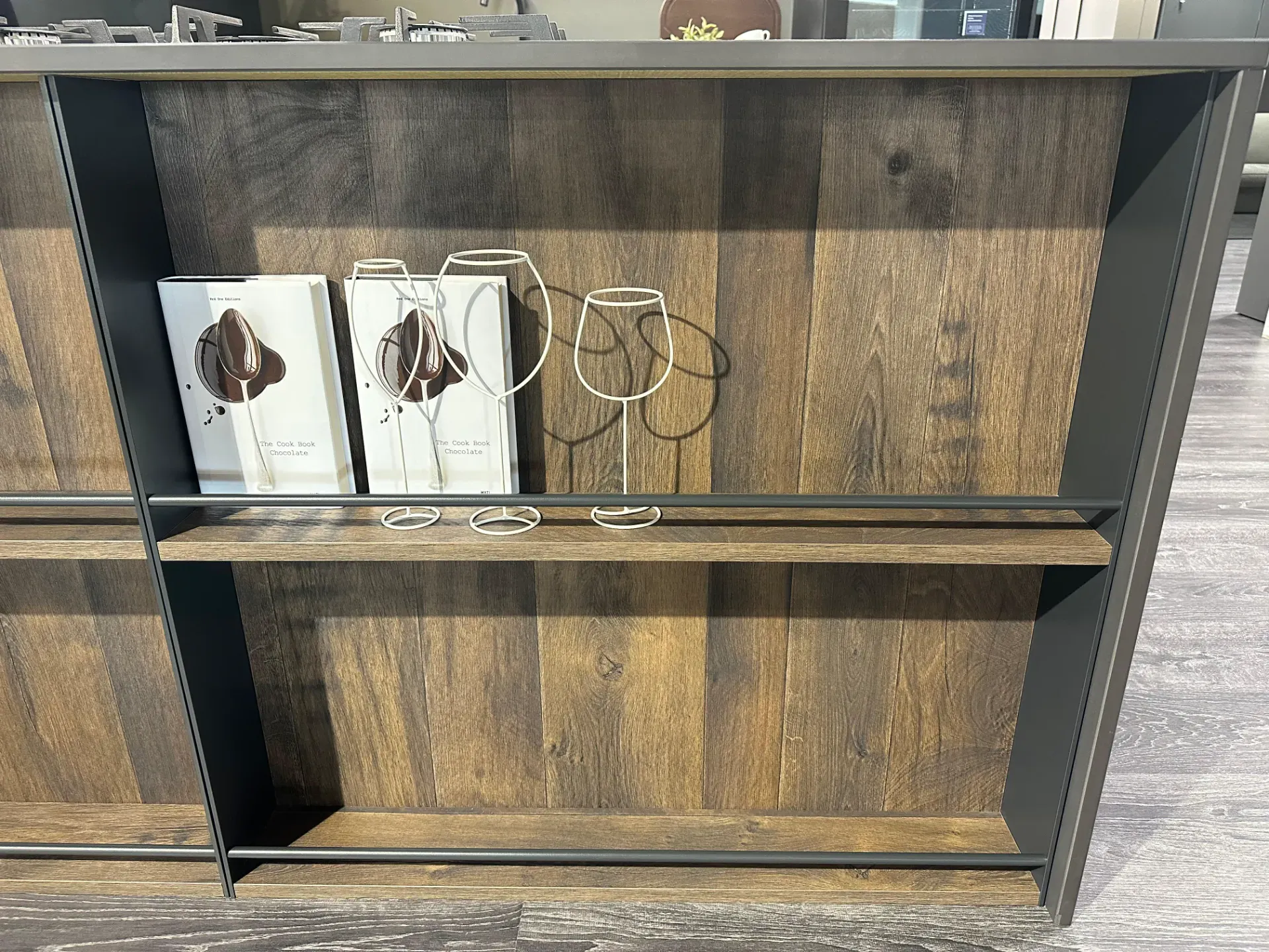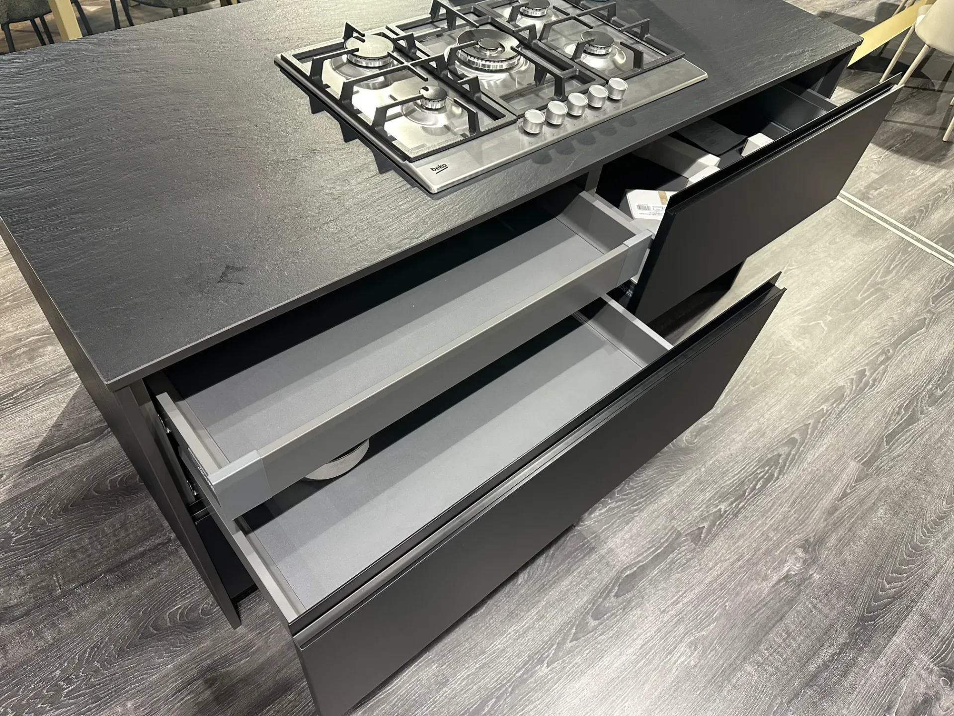 Isola composta da 4 cassettoni, 1 cassetto interno per zona posate ed una zona retro con elementi a giorno effetto legno. Fianconi laterali sempre in laminam come per il top.