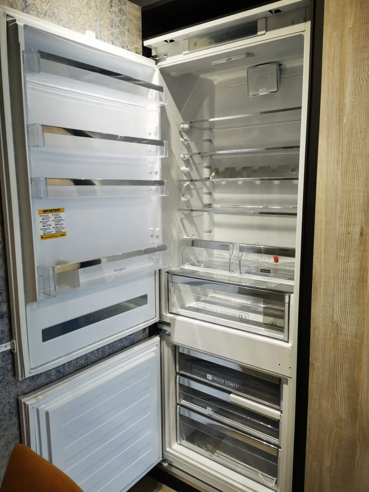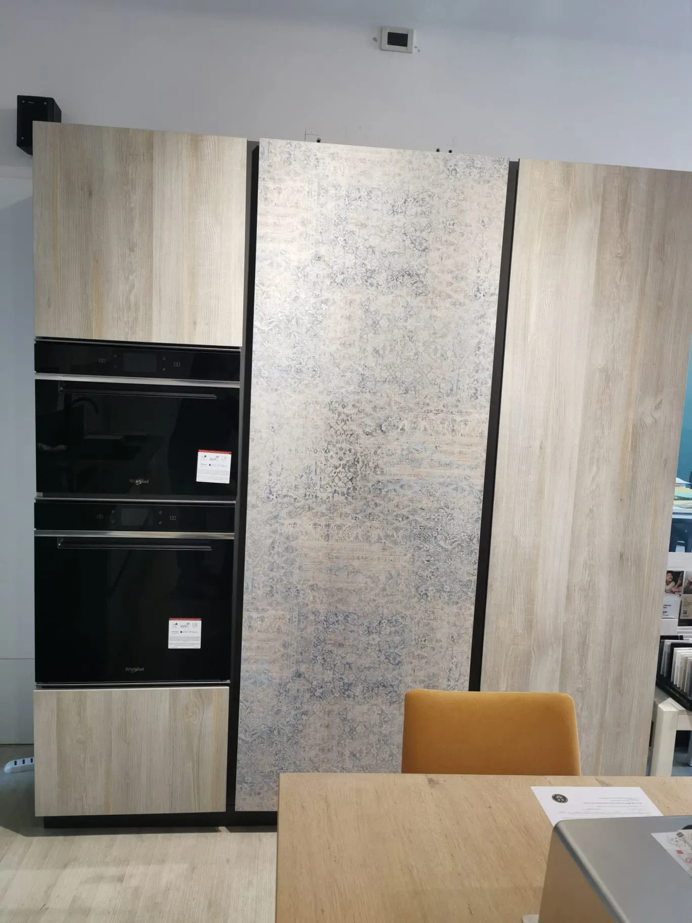 Basi cucina in laminato materico naturale con porta posate da cm. 90 e pattumiera estraibile per la raccolta differenziata. Lavello sottopiano doppia vasca design marca Franke in resina, rubinetto verniciato in tinta col lavello. Piano cottura a d induzione da cm. 77 Whirpool . Apertura con gole verniciate per un maggior design. Pensili con apertura a vasistas in laminato effetto tessuto con cappa integrata e scolapiatti. Mensole a giorno e basi con cestoni ( da usare in cucina o per creare un soggiorno). Colonne con forno , microonde, frigo da incasso da ben cm. 75 , colonna con cesti estraibili.