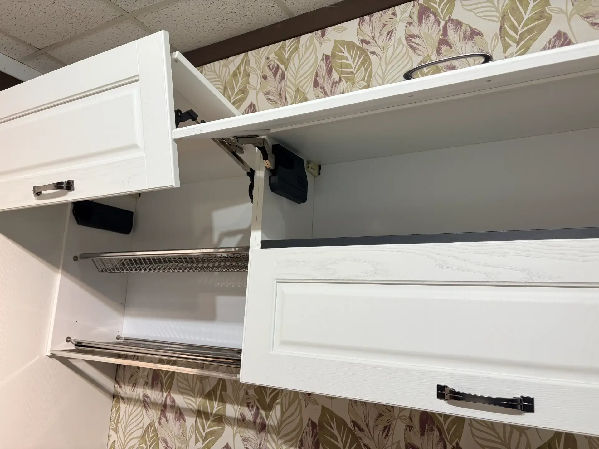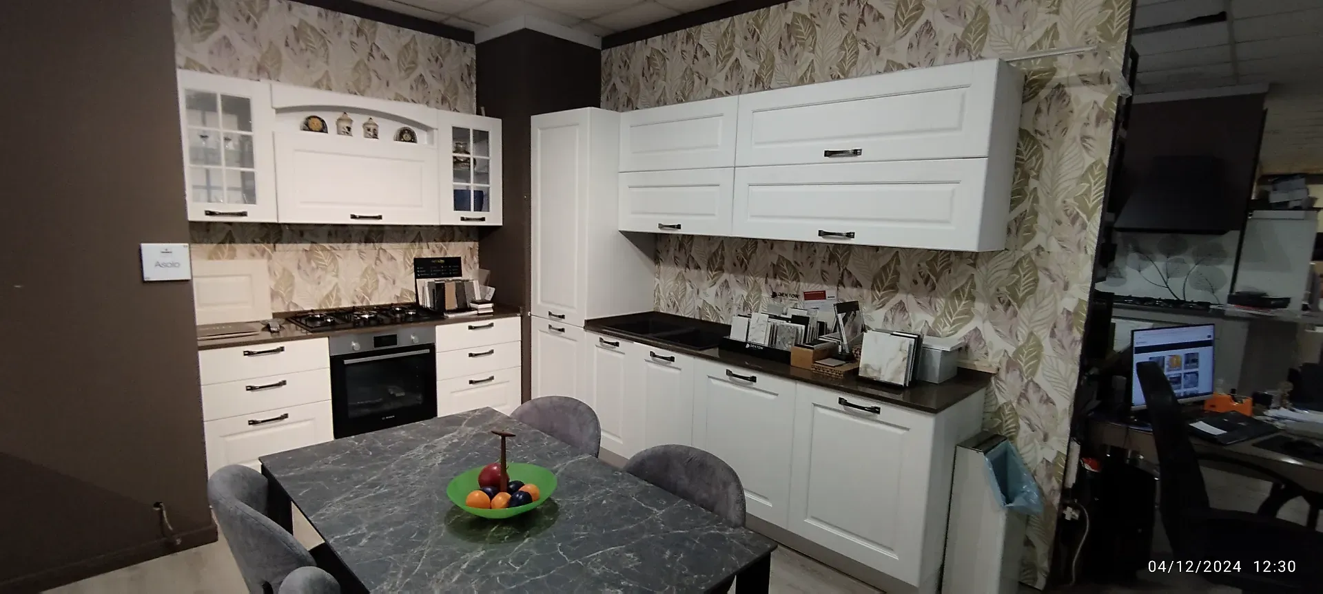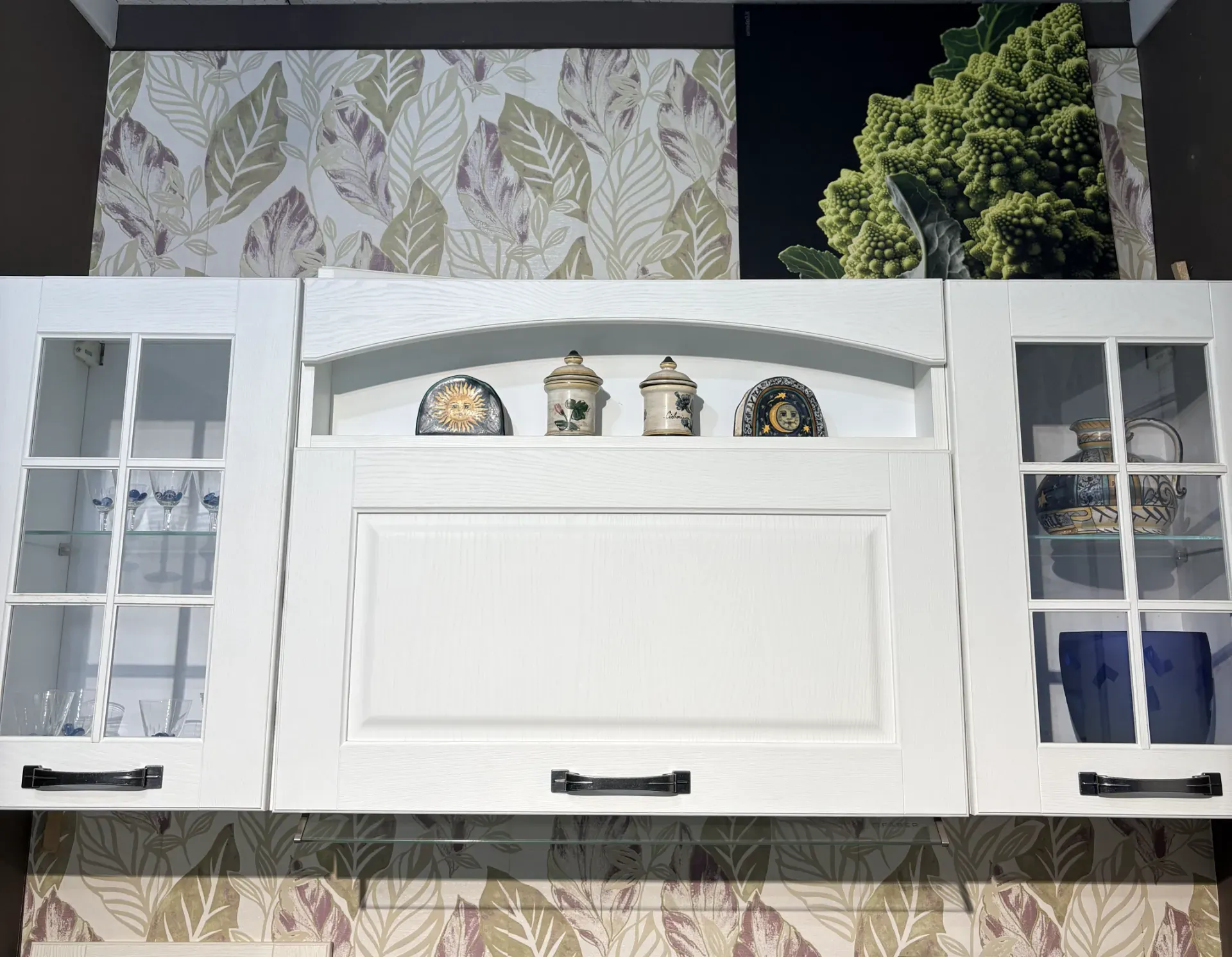 Questa cucina da lo stile classico con elementi provenzali come le vetrine trasparenti stile inglese, la cappa incasso con nicchia superiore che sfruttano lo spazio senza appesantire la composizione , la finitura Bianco siberia la rende più moderna con l'abbinamento al top in quarzo che la rende più pratica all'uso quotidiano , per i pensili abbiamo diversi tipi di aperture lo scolapiatti apertura a soffietto per avere un'apertura completa , pensili vasistas .