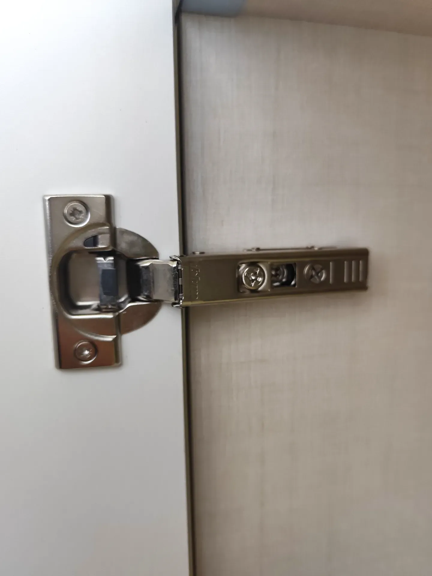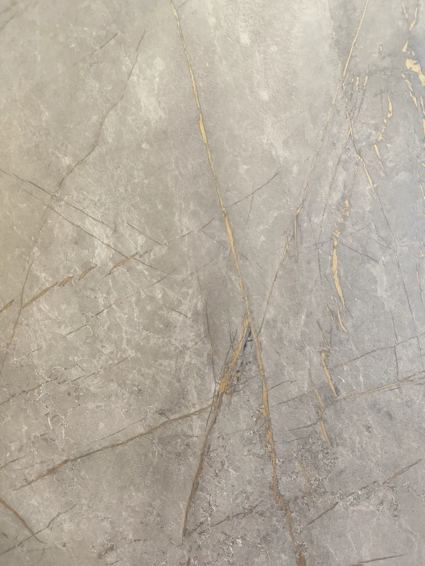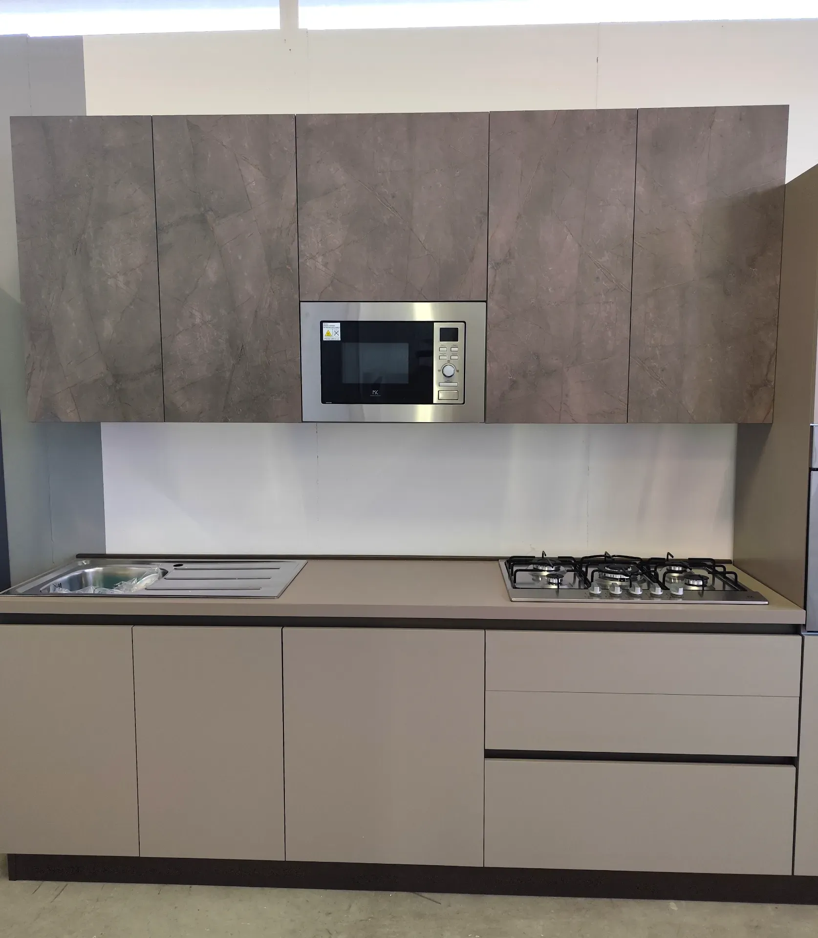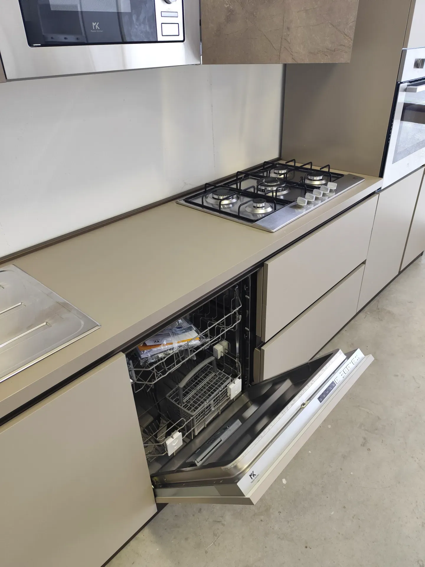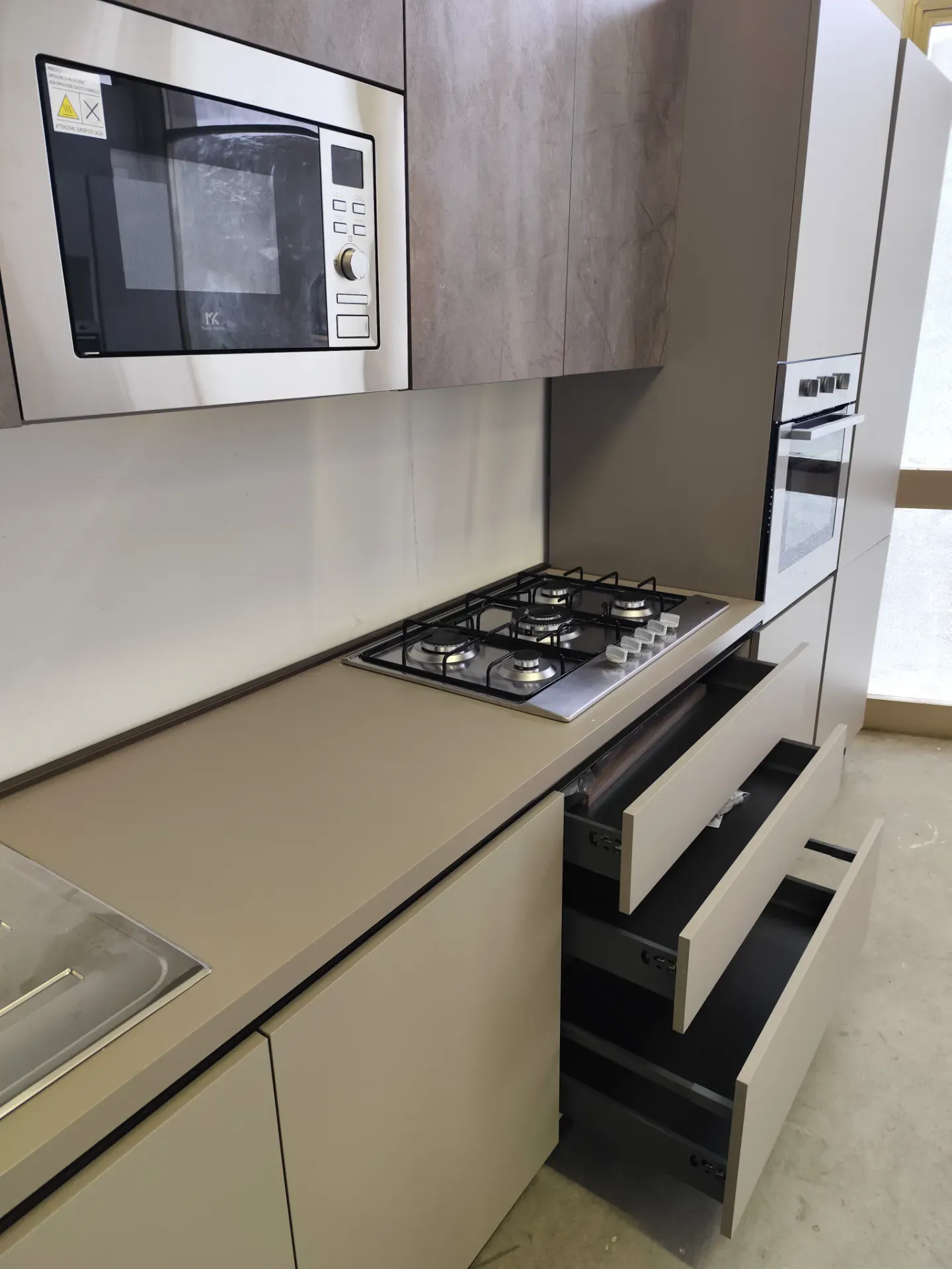 Nelle basi e colonne le ante sono opache color tortora, mentre nei pensili sono color Kaspio effetto cemento con venature oro; hanno tutte la cerniera rallentata della Blum.
