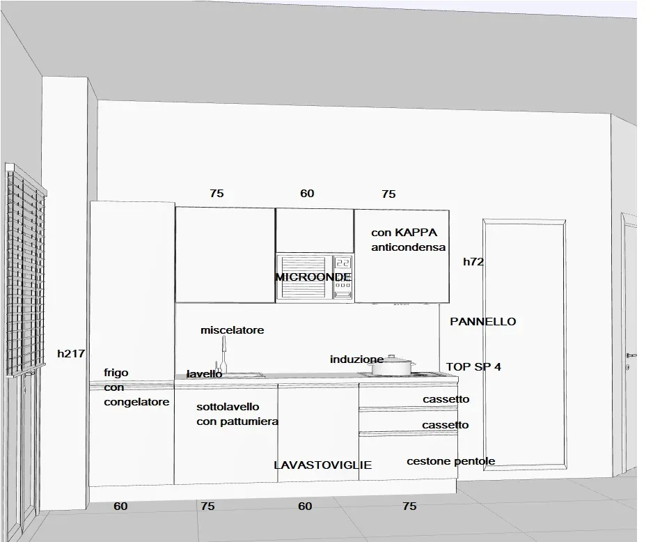 colonna frigorifero, base cesti e cassetto con porta posate, lavastoviglie incasso, sottolavello con pattumiera, lavello , miscelatore, top spessore 4, pannello schienale, 3 pensili di cui uno con cappa