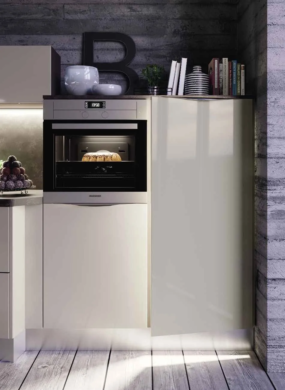 ANCHE UNA SEMPLICE COMPOSIZIONE LINEARE, GRAZIE ALLE BASI POSI-ZIONATE A 10° TIPICHE DI PARAGON, PUÒ TRASFORMARSI IN UNA CUCINA MOLTO PERSONALE E ALTAMENTE ERGONOMICA. LA MANIGLIA PETALO IMPREZIOSISCE L'ANTA SEGUENDO LA LINEA MORBI-DA DELLE SUE SAGOMATURE. IL COLORE ALLUMINIO DONA UN TOCCO DI LUMINOSITÀ