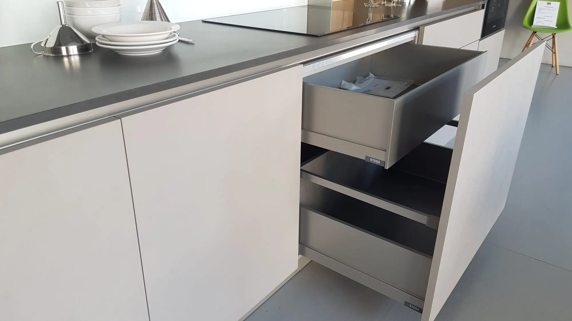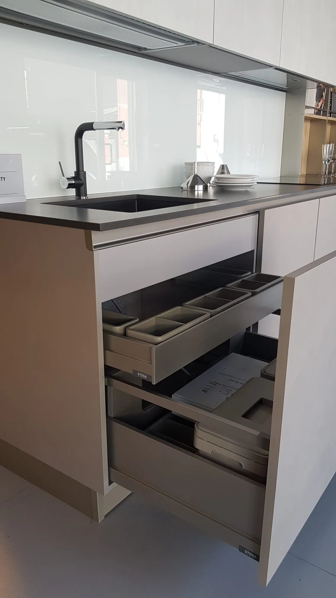 Cucina Stosa mod. Infinity con ante laminato cemento color visone per basi e colonne. Pensili in laminato cemento bianco. Apertura tramite gola color titanio, zoccolo H 12 color titanio. Schienale in vetro bianco temperato retroilluminato dotato di telecomando per regolazione di intensità. top in quarzo opaco, grigio basaltico. Due elementi a giorno con struttura in alluminio e titanio con schienali e mensole in rovere natura. ATTREZZATURE: BASE SOTTOLAVELLO da 90 cm attrezzato con pattumiere e cassetto interno porta-detersivi. BASE PER PIANO COTTURA da 90 cm con cestone estraibile con cassetto interno. PORTAPOSATE da 90 cm PENSILE CON CAPPA integrata a ribalta cm 90 dotato di cappa ultima generazione anti-condensa particolarmente adatto ai piano ad induzione Cucina dotata di doppi pensili a ribalta, sotto H. 72 , sopra H. 48 ELETTRODOMESTICI: - Cappa: a incasso Galvamet anticondensa - Forno: multifunzione Samsung DUAL COOK FLEX - Forno microonde: Samsung - Frigorifero: nessun frigorifero - Lavastoviglie: comandi a scomparsa Samsung - Lavello: sottotop Plados ultraquarz nero 50 x 40 cm, 1 vasca - Piano Cottura: induzione Samsung con piastra flex - Rubinetteria: miscelatore Plados nero cromo - Top cucina: quarzo Grigio scuro opaco
