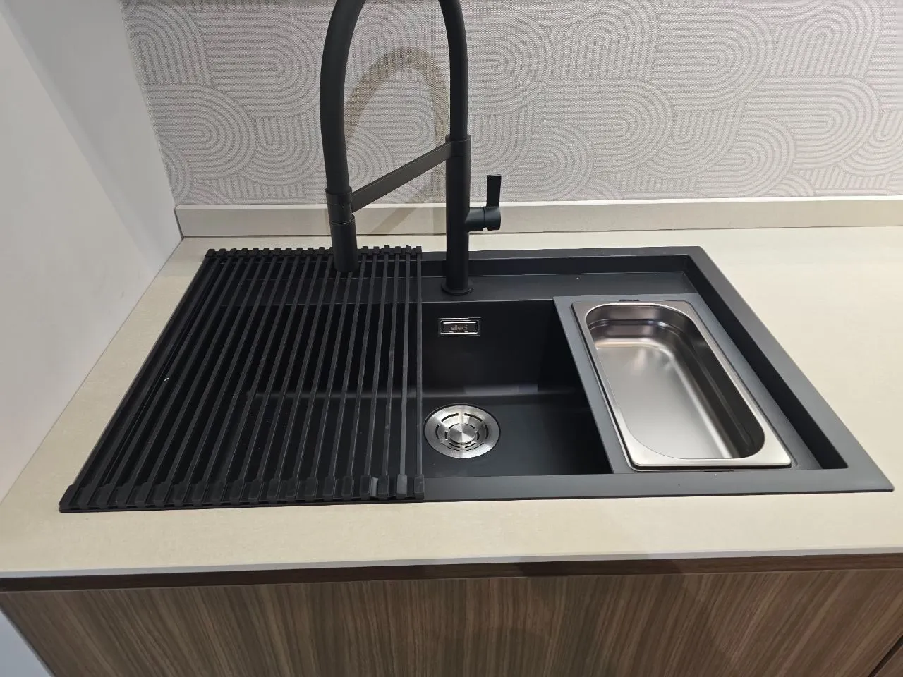Questa cucina Mobilturi è ultimata con un rubinetto con miscelatore costruito in materiali di qualità, ideale per mantenersi negli anni e garantirti un flusso d'acqua sempre regolare.