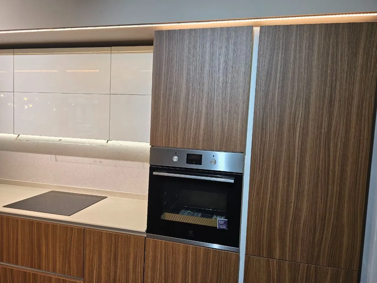 Cucina componib. CON GOLA bianca EXPO del 22 ottobre 2025-- PENSILI VASISTAS laccato lucido bianco. Frontali basi e colonne noce new. Colonna Frigo da cm 60 h. 216 frigo incas congelatore ELETTROLUX. Colonna Forno da 60 h. 216 con forno incasso electrolux. Base da cm 45 con pensile vasistas h. 72. Base con 2 CESTONI e cassetto interno estraibile portaposate da cm 90 con piano cottura ad induzione ELECTROLUX. Pensile vasistas 2 ante con cappa per induzione blutout l 90 h. 72 Lavastoviglie ad incasso da 60 ELECTROLUX Pensile h. 72 VASISTAS 2 ante da cm 60 x h 72. Base da cm 90 2 cestonib estraibili con lavello ad incasso ELLECI nero + MISCELATORE elleci nero PIANO IN GRES LAMINAN chiaro.