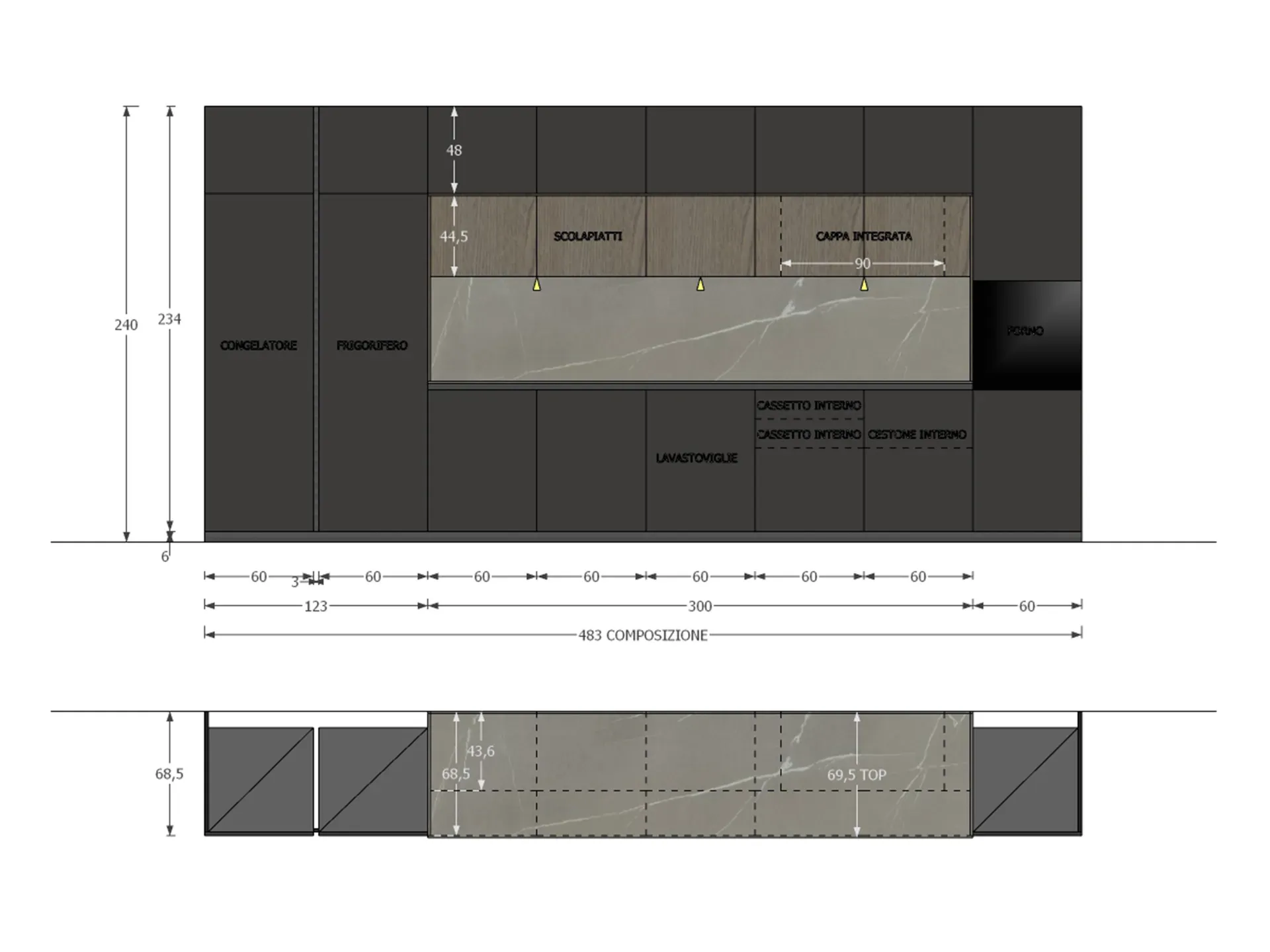 La cucina lineare moderna Plan 03 outlet si distingue per il suo design elegante e funzionale, perfetto per chi desidera un ambiente cucina raffinato e contemporaneo. Caratterizzata da doppi pensili e doppia finitura, combina il vetro acidato nero Pece con il legno Fashion Wood Rovere Ghiro, creando un contrasto visivo affascinante. Le ante sono realizzate con un telaio in alluminio spesso 1,6 cm, su cui è montato un pannello in vetro acidato di 0,4 cm. Questo conferisce alle ante uno spessore totale di 2 cm, garantendo robustezza e leggerezza.