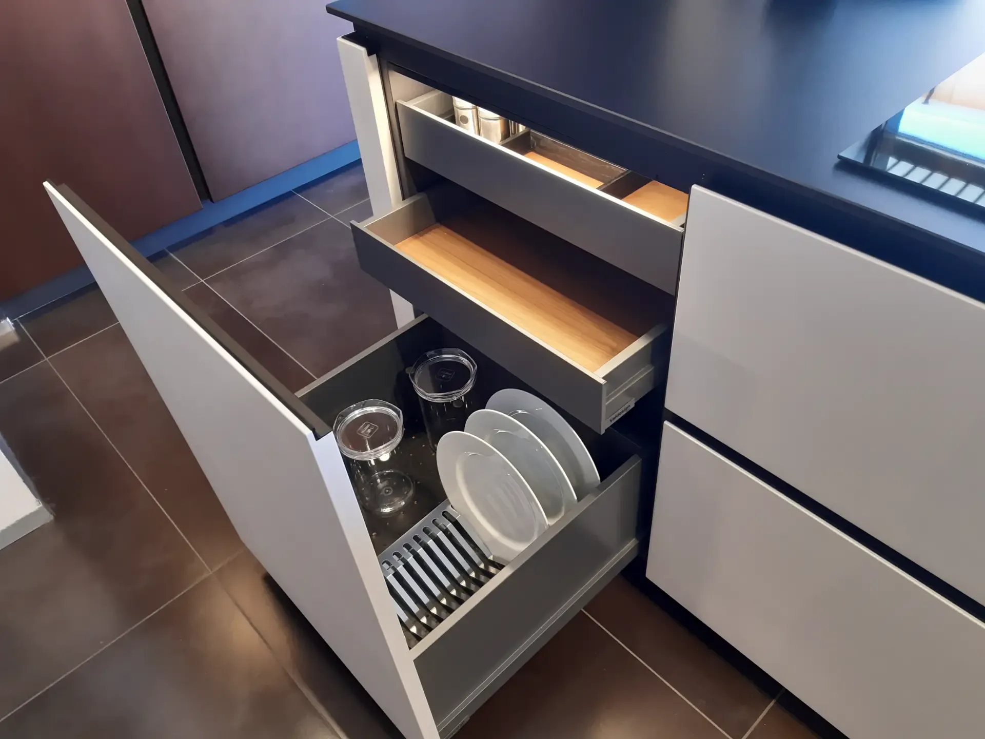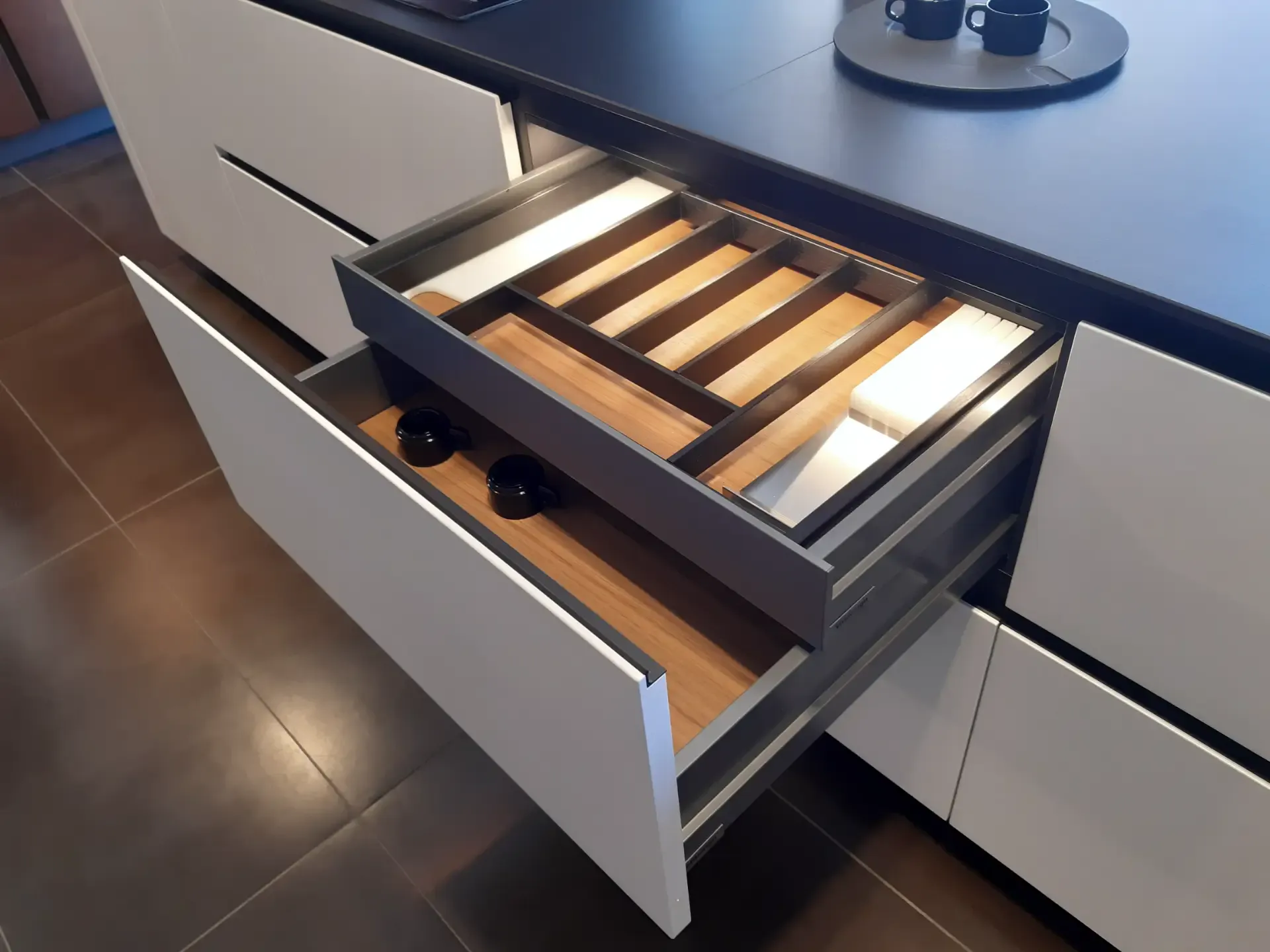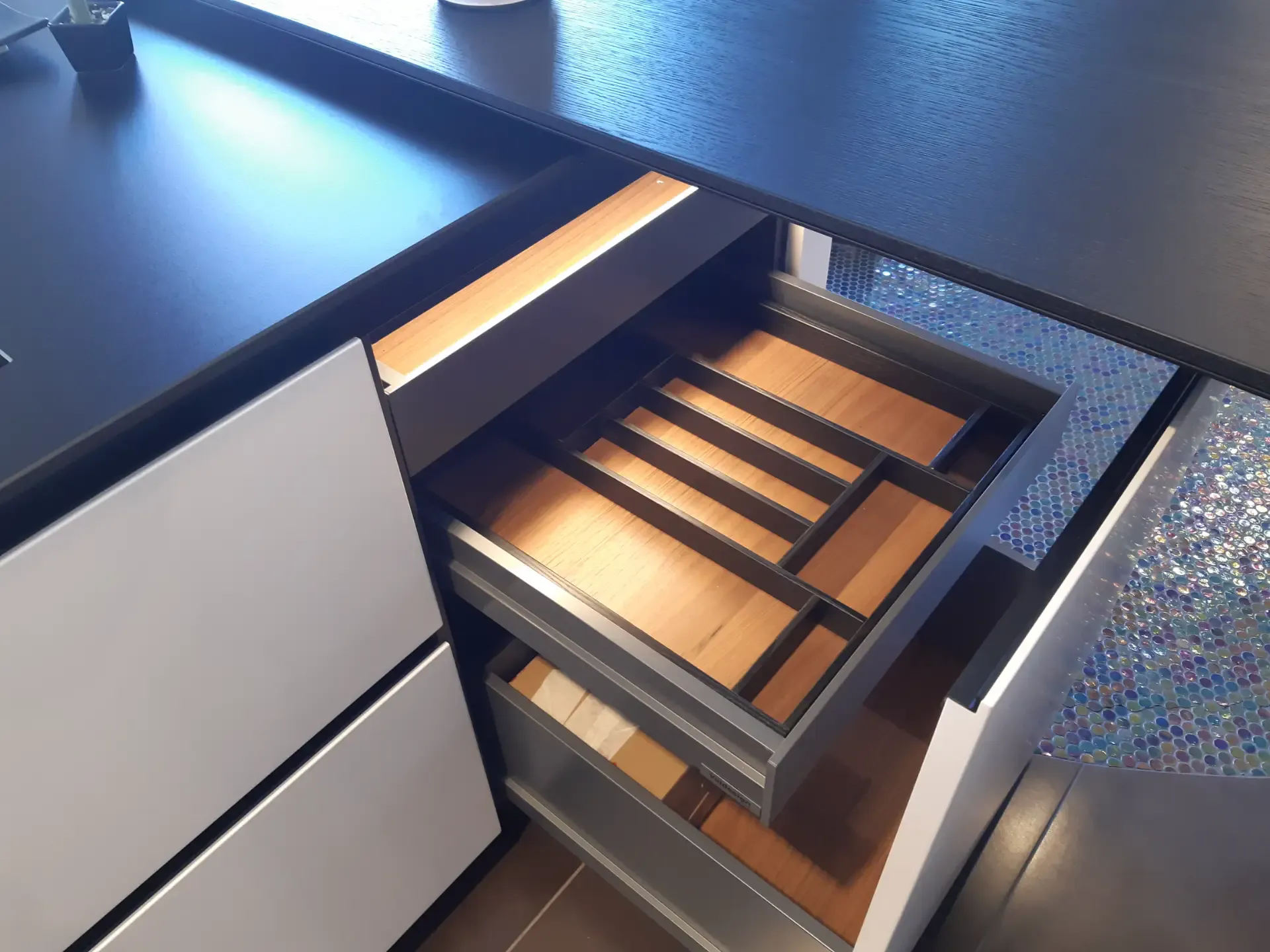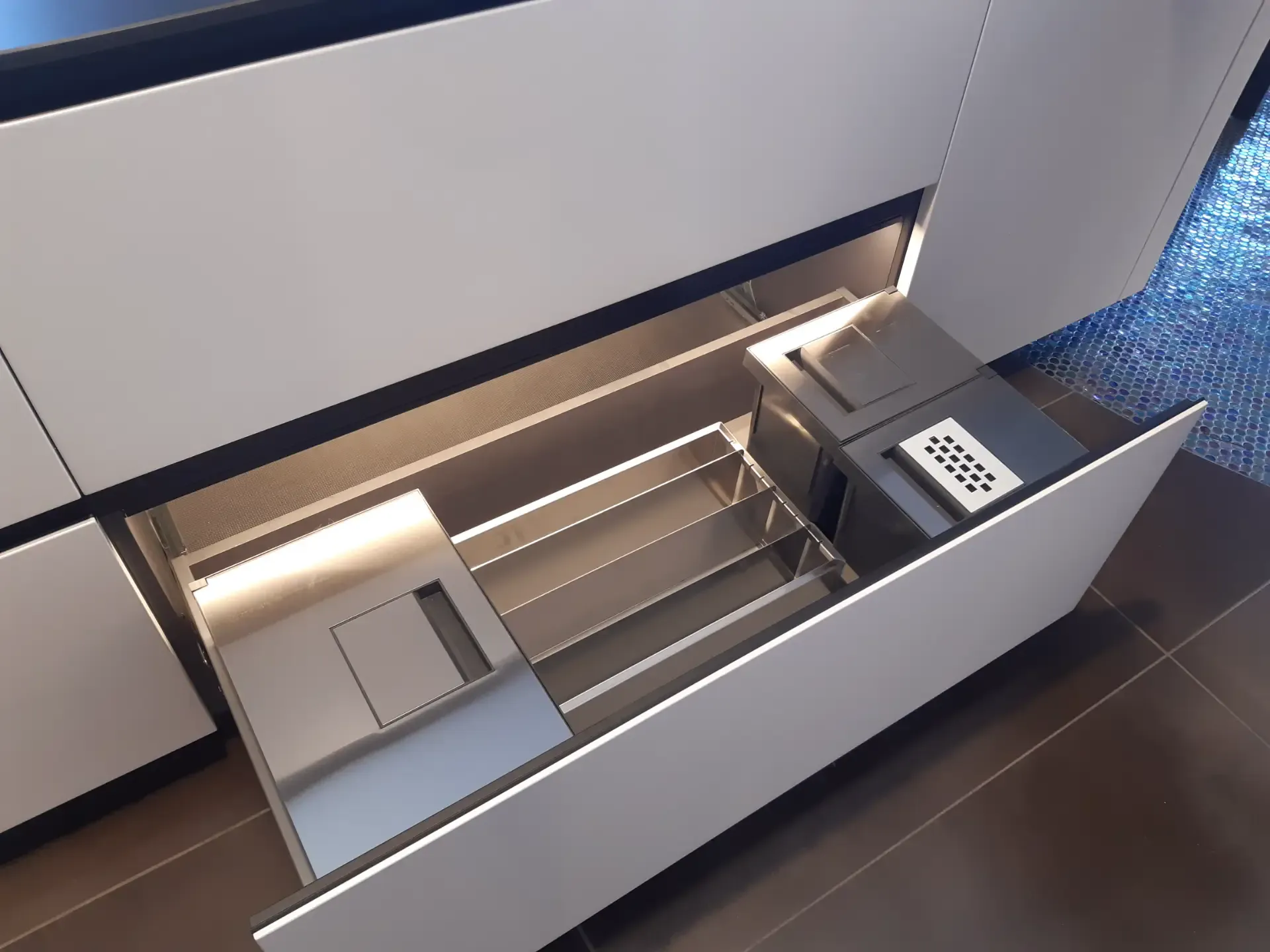 L'isola è progettata per ottimizzare lo spazio con basi dotate di ante e cestoni estraibili, perfetti per organizzare posate, piatti e rifiuti in modo efficiente. L'illuminazione interna a LED, attivata da sensori, garantisce una visibilità eccellente, facilitando l'accesso a tutto ciò di cui hai bisogno. Sul retro, troverai contenitori con profondità ridotta e un pratico vano a giorno centrale che aggiunge un tocco di originalità.