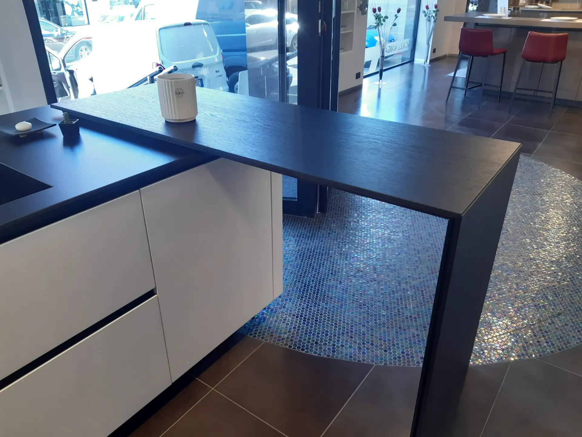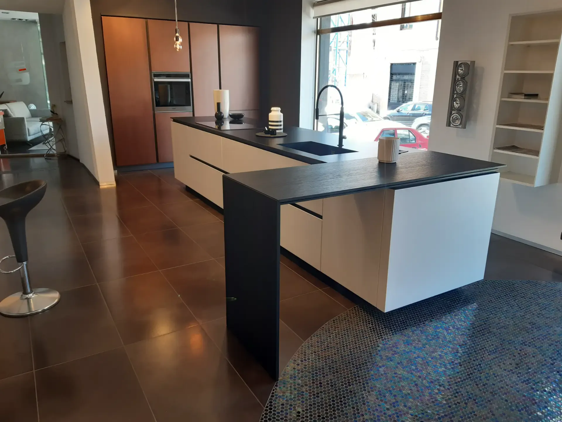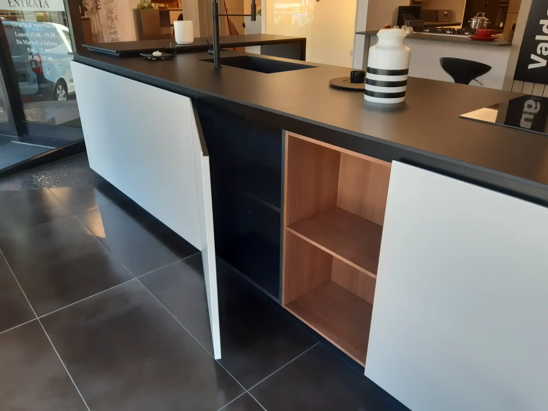 Il top in Laminam Nero Assoluto, con vasca integrata e miscelatore professionale nero Barazza, si combina perfettamente con il piano cottura in vetroceramica nero di Miele. Questi elementi non solo completano l'estetica raffinata dell'isola ma offrono anche prestazioni eccezionali per le tue esigenze culinarie.