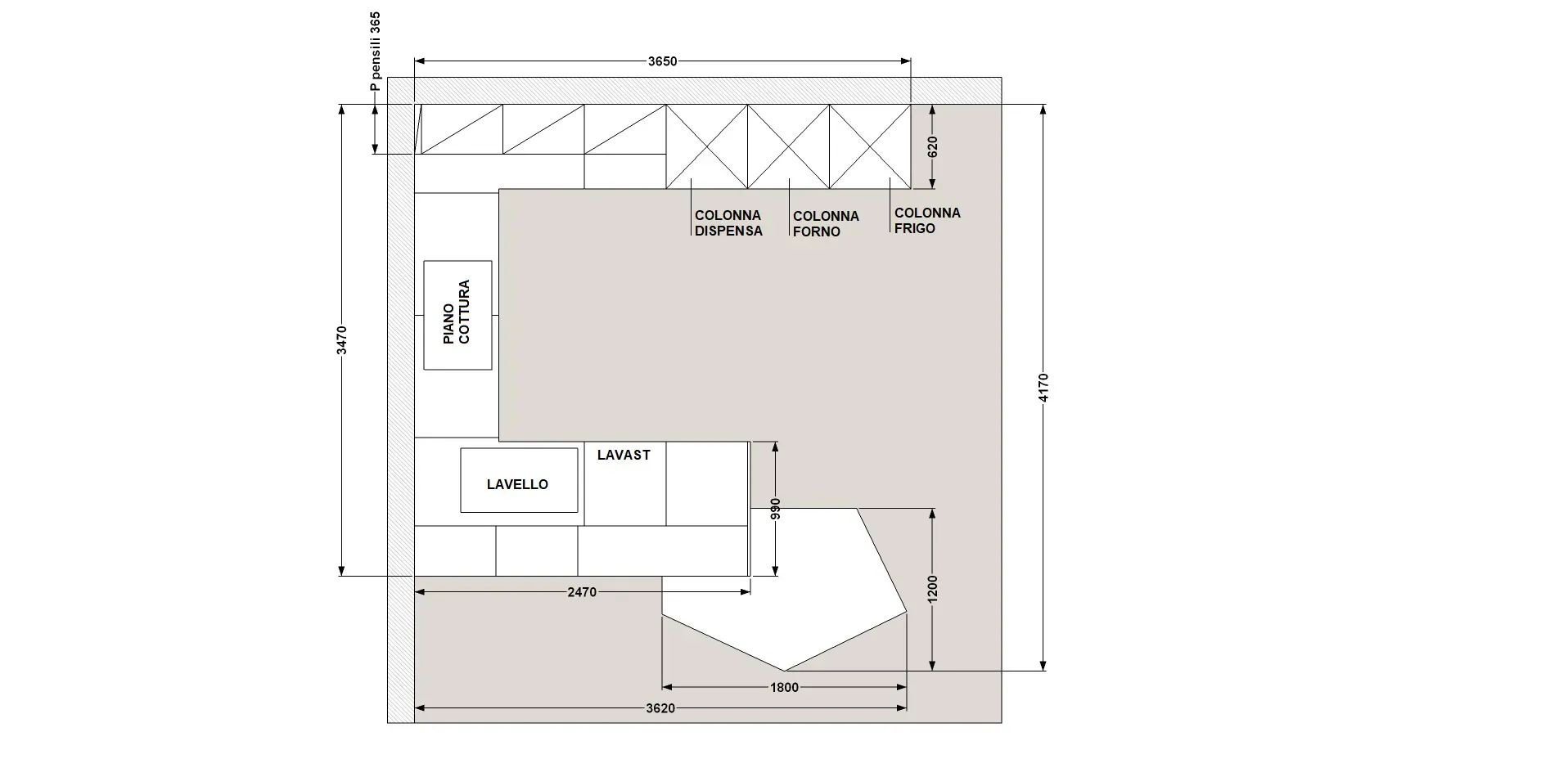 Dimensioni cucina angolare: L 346,5x365 cm H 218/254 cm P 59 cm. Dimensione penisola piano Fenix colore Piombo Doha: L 250 cm P 124 cm