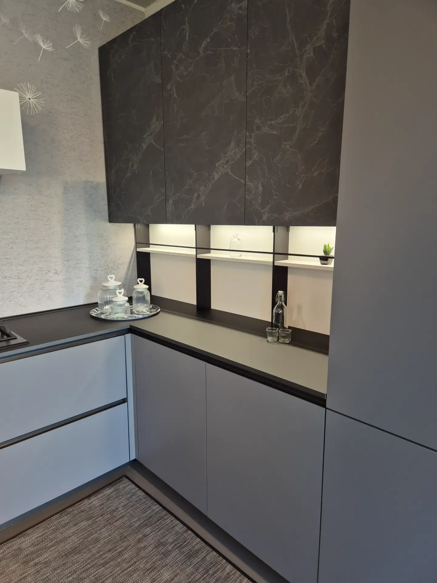 La cucina è caratterizzata dall'apertura con gola scavata finitura nero spazzolato. Le ante delle basi e delle colonne sono in finitura Pet colore Grau Opaco, mentre le ante dei pensili sono in finitura Laminato colore Marquinia.