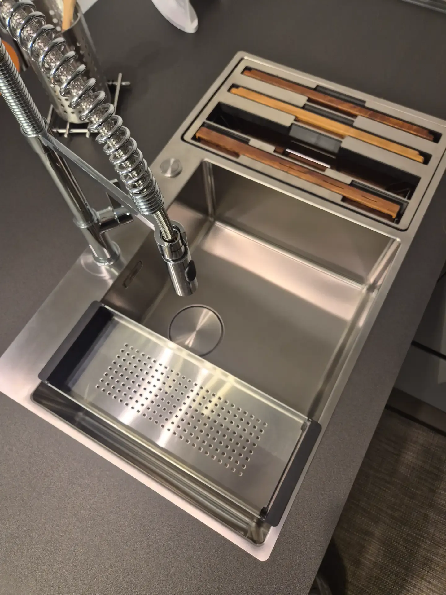 La penisola è dotata del nuovissimo lavello Franke con tantissimi accessori inclusi.
