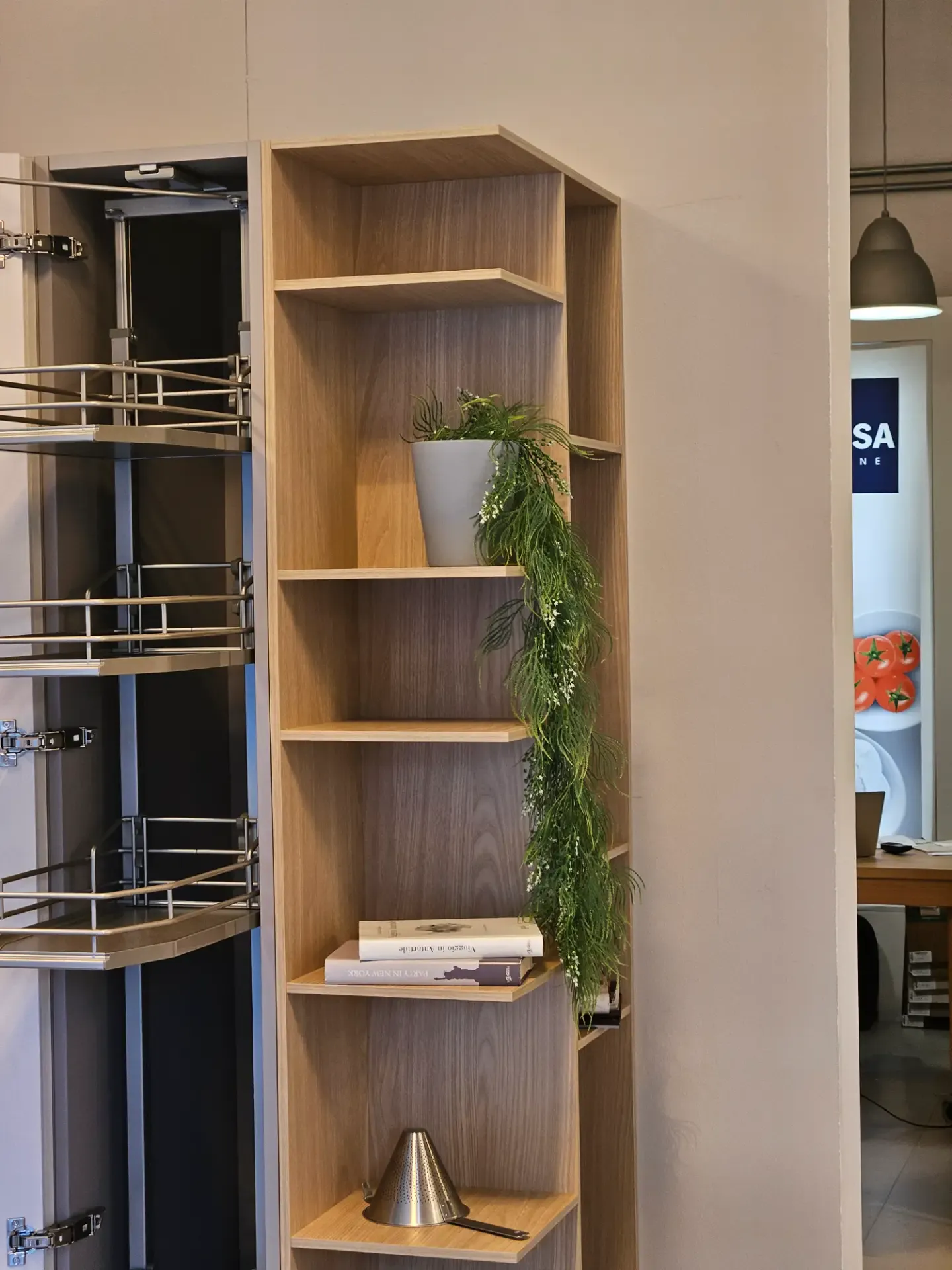 Cucina in laminato bianco pet , laminato calce e particolari in laminato rovere sole, gole e zoccoli colore titanio ,top in quarzo bianco ,lavello sottotop in fragranite bianco ,tavolo a penisola in laminato rovere sole con sostegno in vetro, attrezzatura interna: cestoni pentole ,cassetto con portaposate cm 90 ,colonna terminale a giorno con colonna estraibile ,cappa anticondensa adatta per piano cottura a induzione, schienali in laminato rovere sole attrezzati con luce sotto pensile scolapiatti, portascottex, portabicchieri,ganci. Misure lato basi 270 h 216 prof. 62 ( escluso tavolo) lato colonne cm 246 h 216 prof. 61 .Possibilità di effettuare modifiche per adattarla alle vs dimensioni.