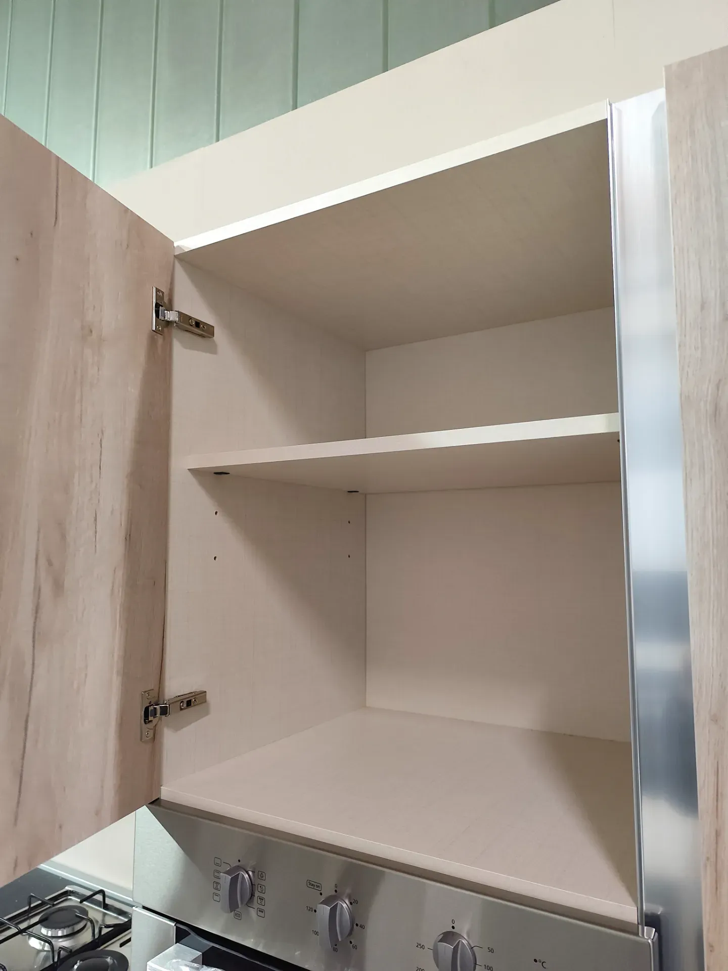 Le ante delle basi e colonne sono color rovere vintage, mentre quelle dei pensili sempre effetto rovere ma chiaro. Hanno tutte le cerniere rallentate.