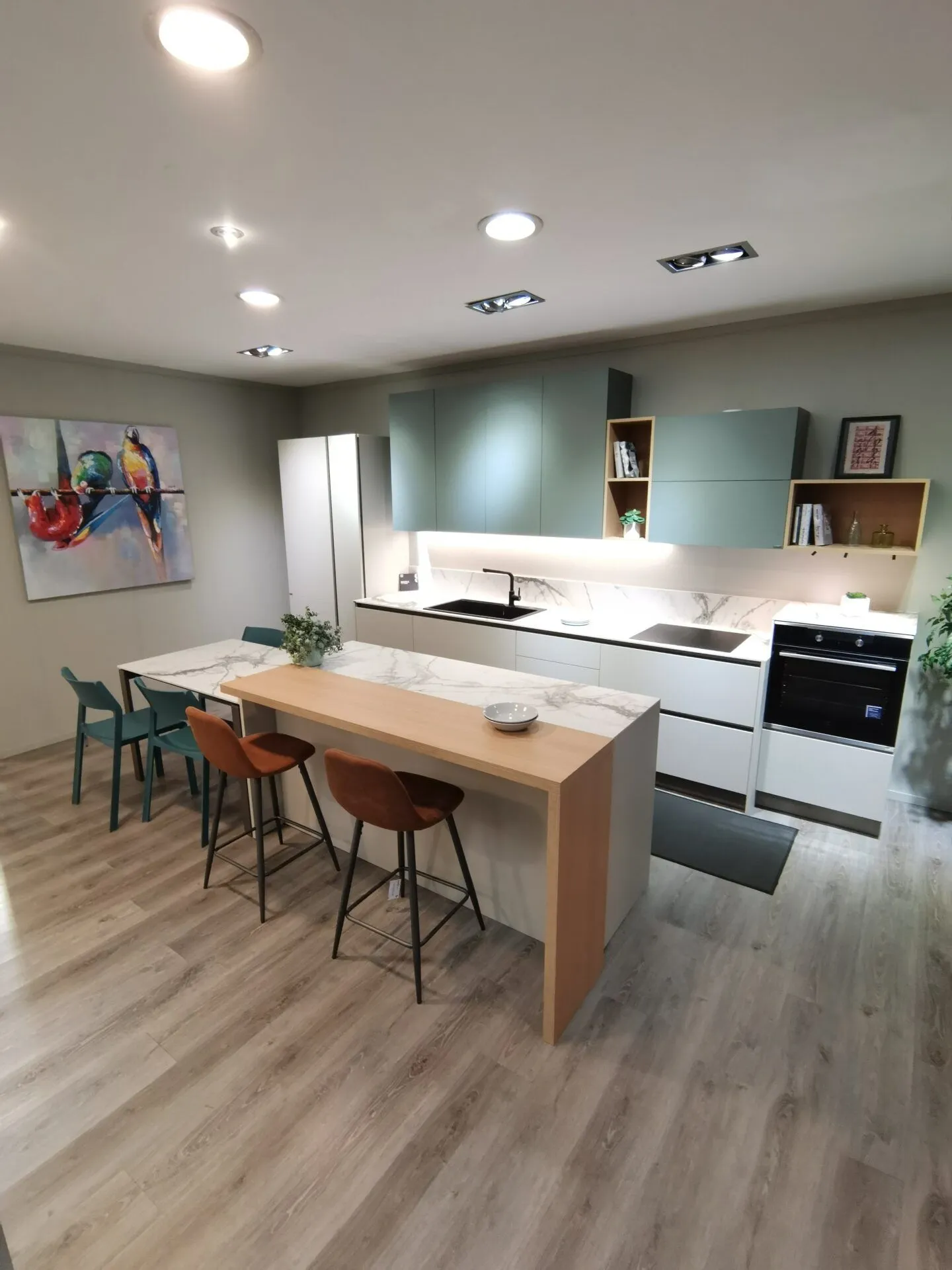 Dettagli dell’offerta. Parete lineare con piano lavoro profondità 69 cm, colonna frigo, colonna dispensa estraibile, base alta forno; isola con piano snack e tavolo allungabile. Frontali sp 22 mm decorativo Canapa e Selva, elementi a giorno decorativo Rovere Gold. Gole colore Titanio, zoccolo H 12 cm colore Titanio. Piano lavoro e schienali in Gres Calacatta Emerald sp 1,2 cm, piano snack decorativo Rovere Gold.