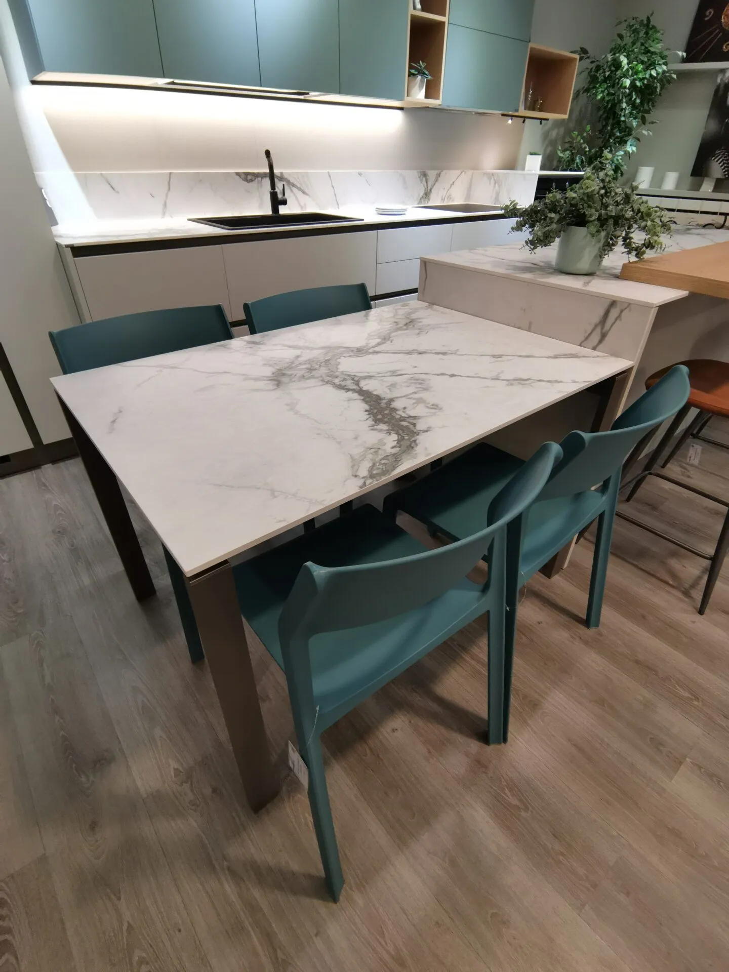 Complementi inclusi: tavolo Dimension 80 x 120/160/200 cm con struttura Titanio e piano gres Calacatta Emerald.