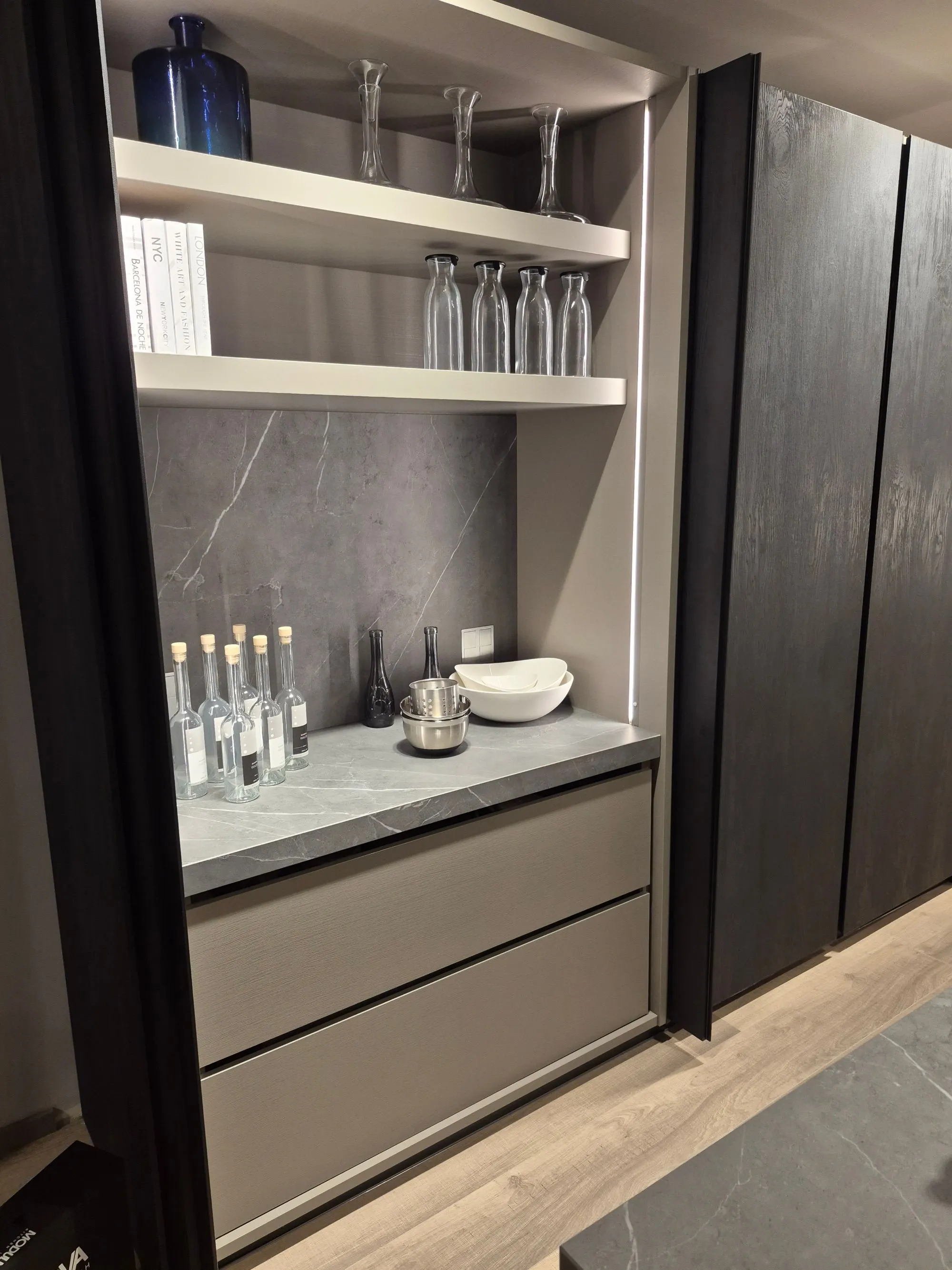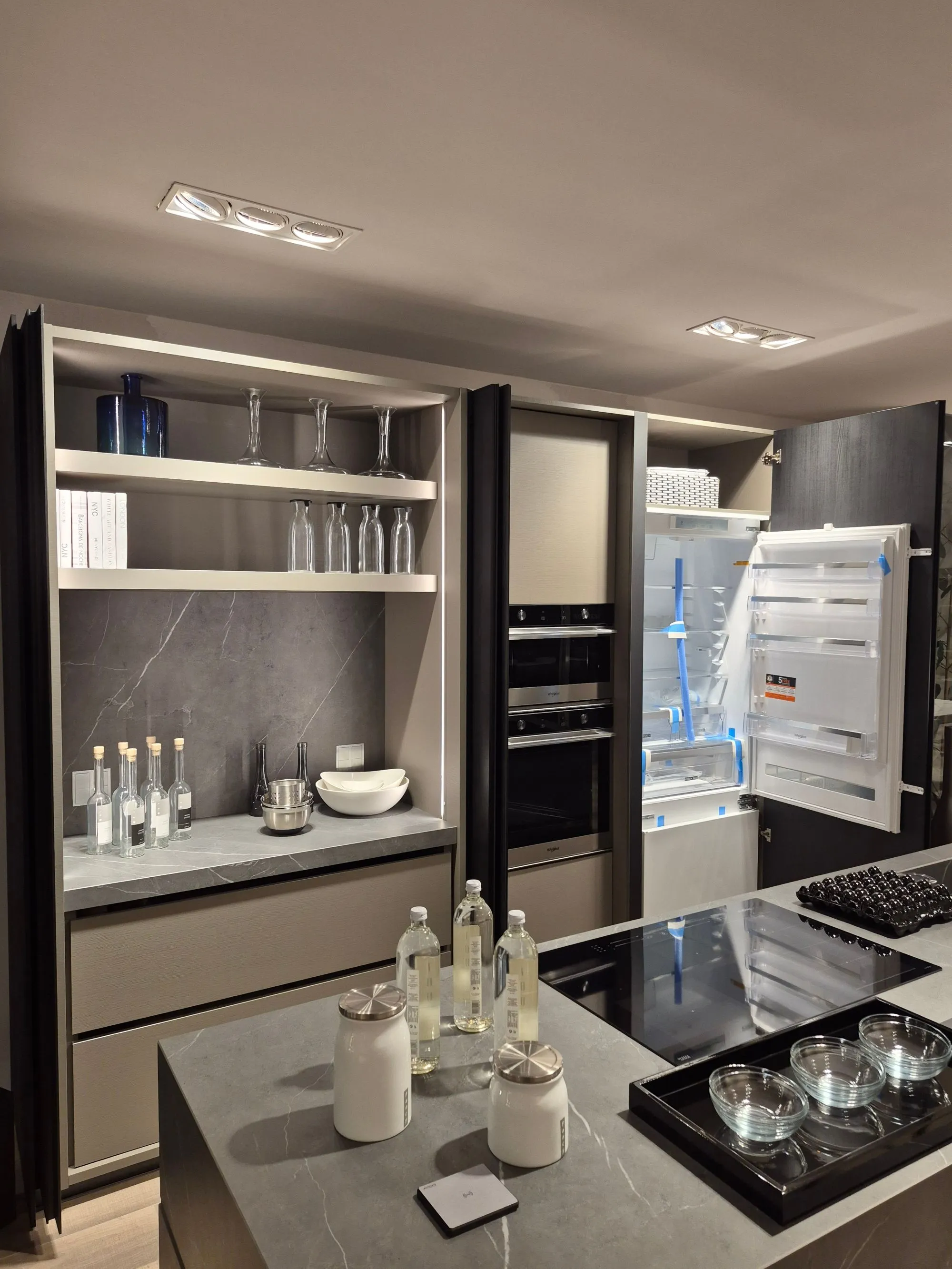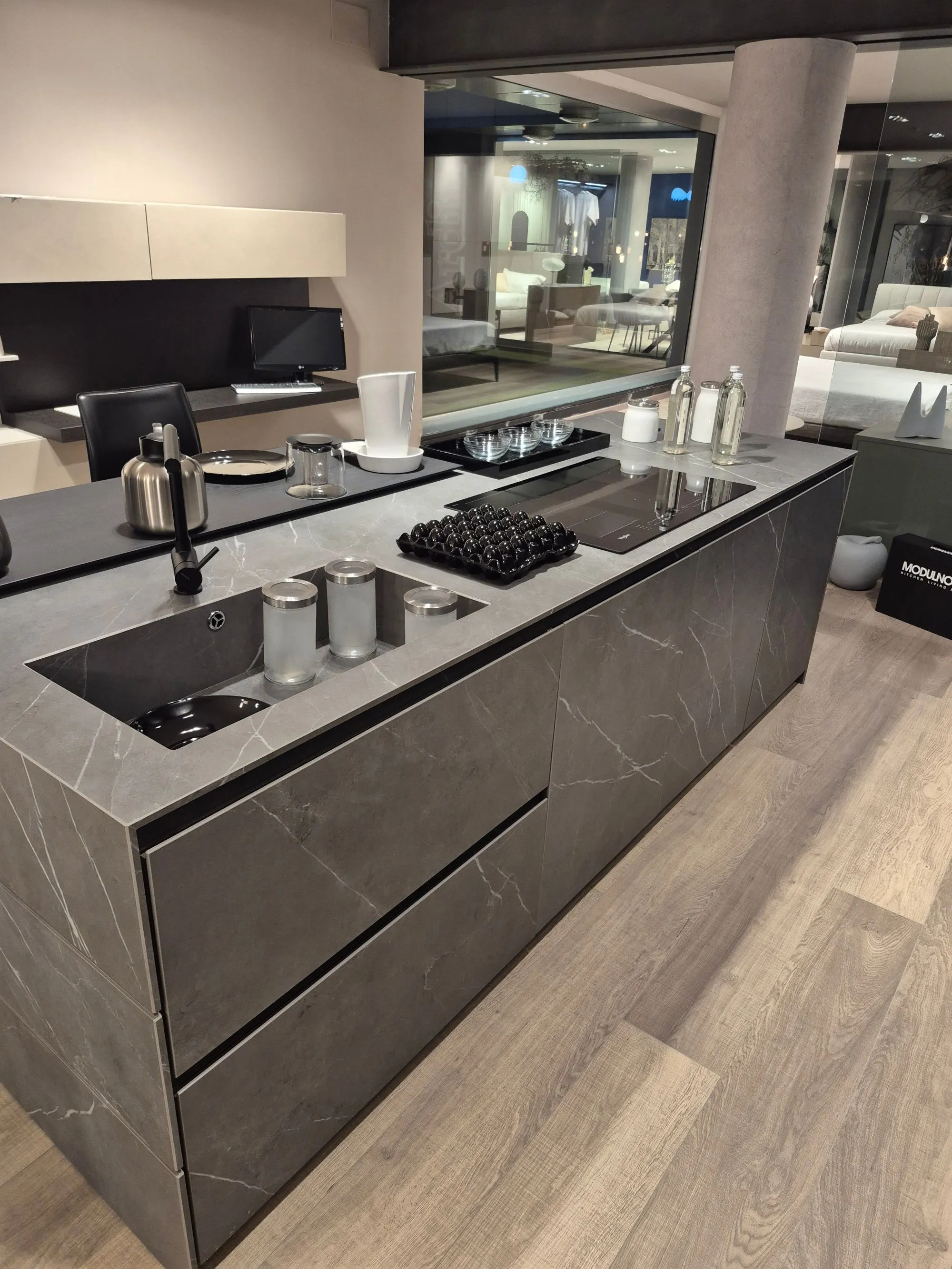 Cucina modulnova modello skill ,colonne finitura mill tech rovere fumo raw . isola scatolata gres graphite raw. colonna ante rientranti con illuminazione led interna a sensore ,due cestoni e schienale in gres con prezse schuko su pannello schienale in gres integrate. colonna forno micro whirlpool frigo da 75 whirlpool isola in gres vasca lavello integrata , caricatore smartphone su isola piano cottura induzione e lavastoviglie whirlpool . base da 60 con cassetti e cestoni interni con fondo in gres e portacoltelli
