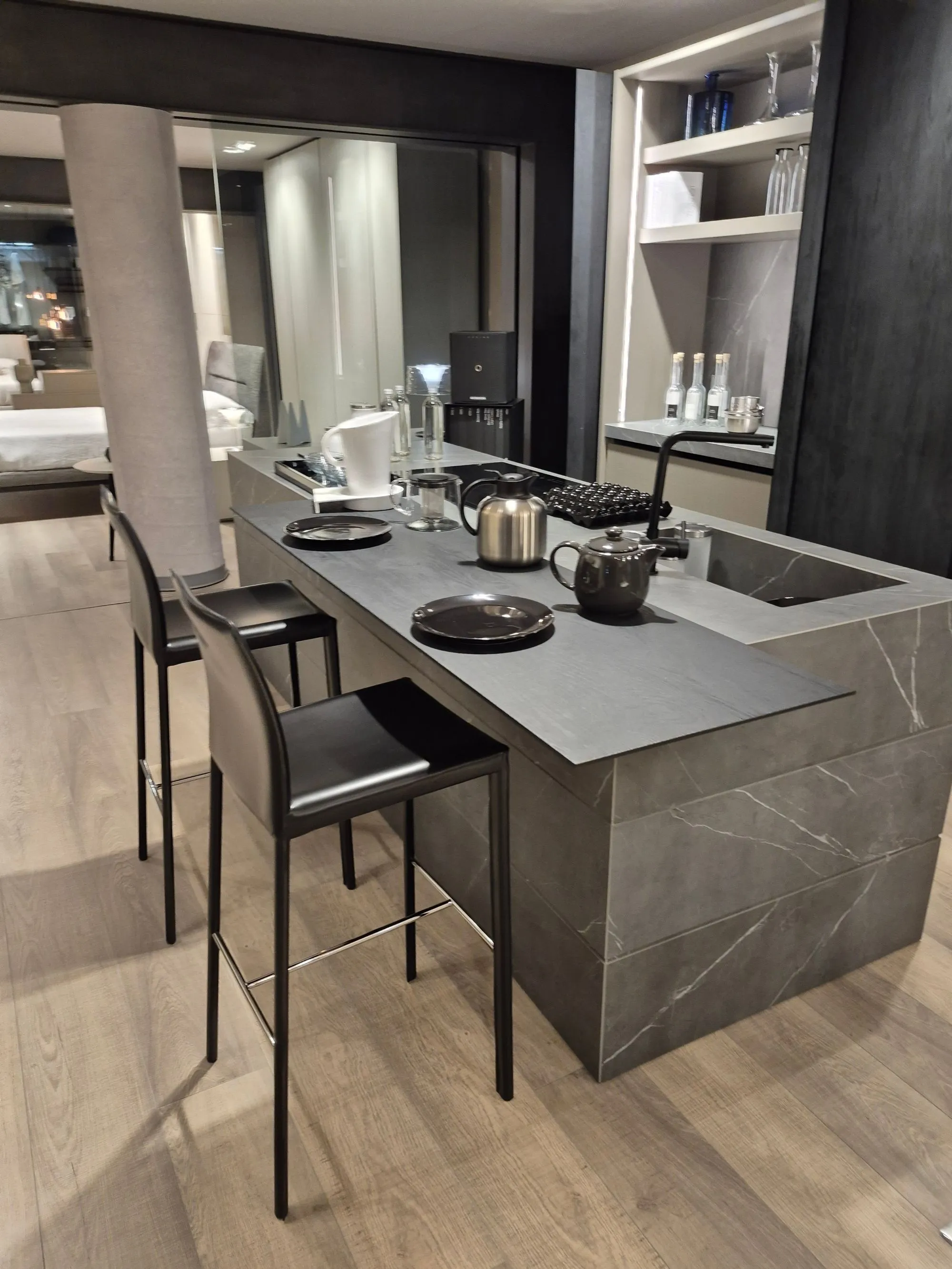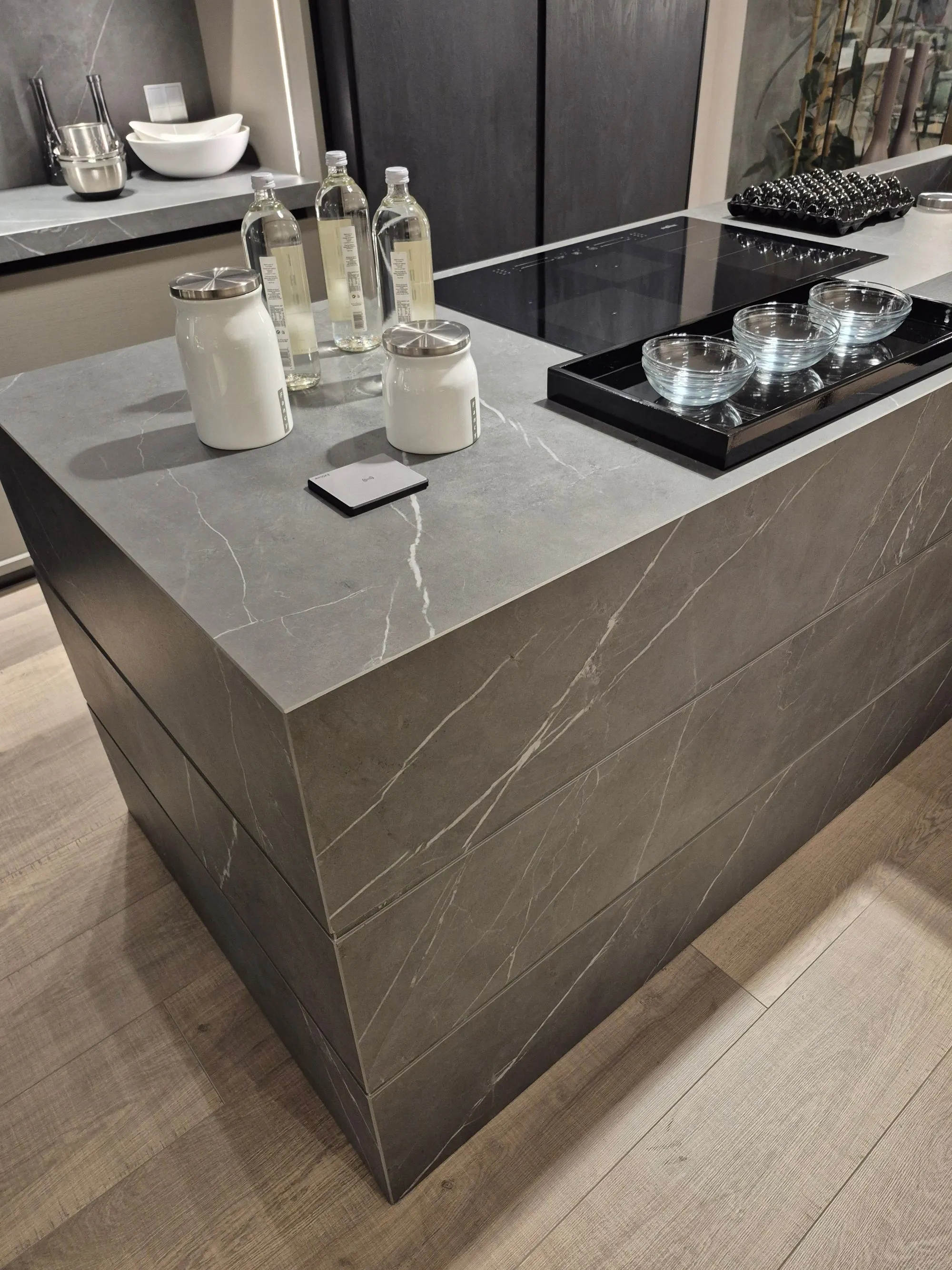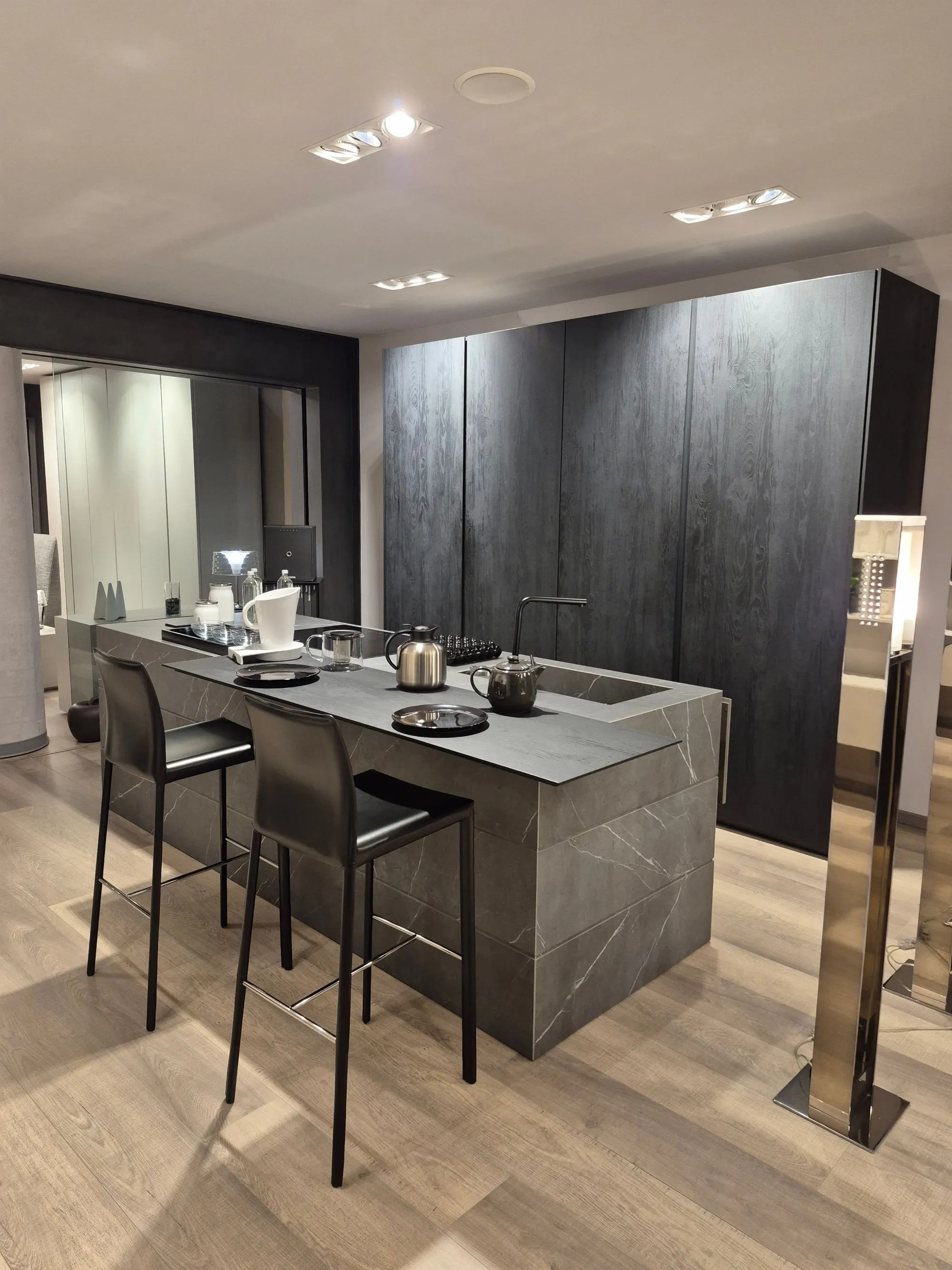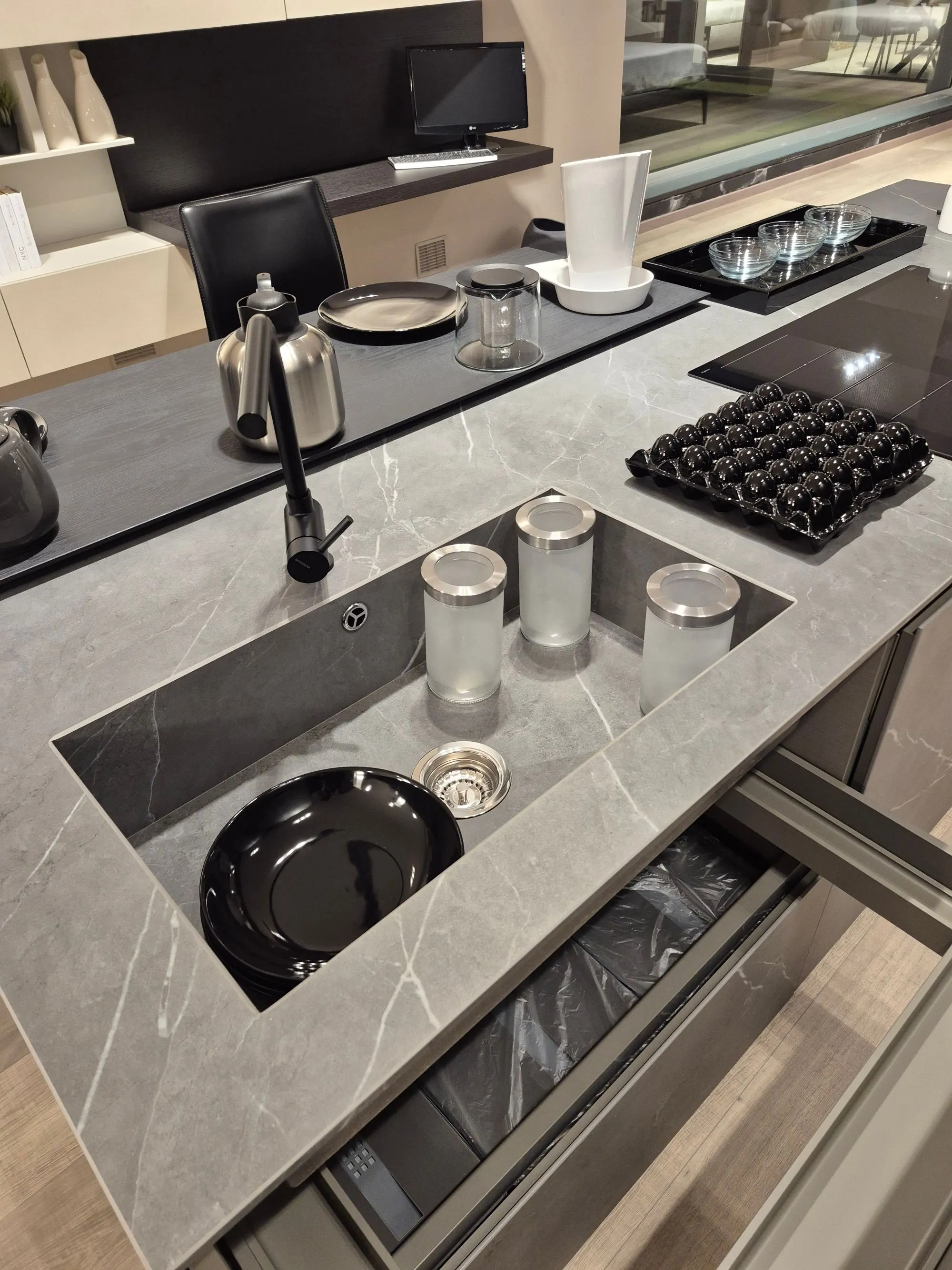 Cucina modulnova modello skill ,colonne finitura mill tech rovere fumo raw . isola scatolata gres graphite raw. colonna ante rientranti con illuminazione led interna a sensore ,due cestoni e schienale in gres con prezse schuko su pannello schienale in gres integrate. colonna forno micro whirlpool frigo da 75 whirlpool isola in gres vasca lavello integrata , caricatore smartphone su isola piano cottura induzione e lavastoviglie whirlpool . base da 60 con cassetti e cestoni interni con fondo in gres e portacoltelli