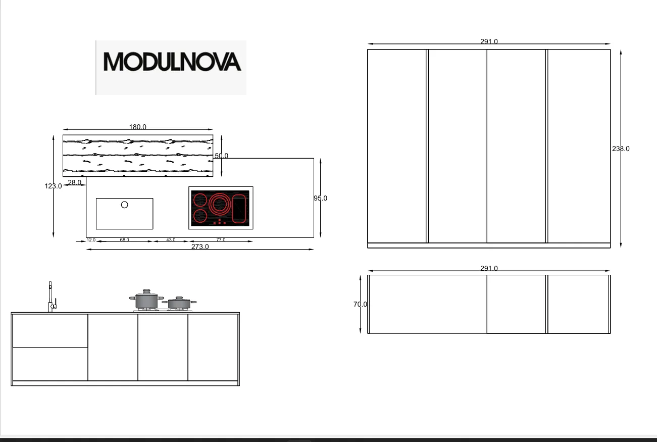 Questa proposta Modulnova è completa di piano cottura induzione incluso nell'offerta che, oltre al fatto di assicurarti durata e brillantezza nel tempo, ti permetterà anche di cuocere i piatti migliori con estrema facilità ottenendo i risultati migliori.