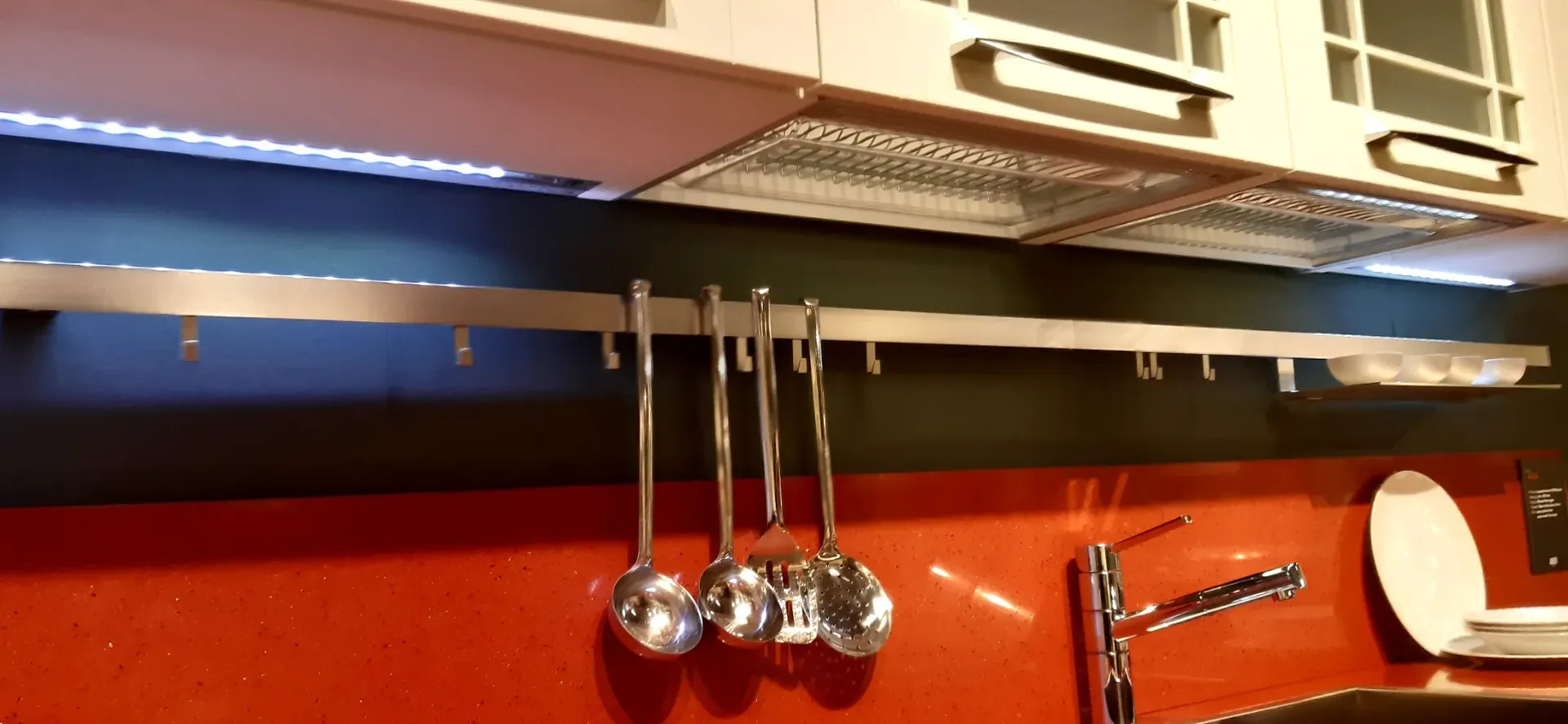 I piani di lavoro sono in Tecniplan rosso Ferrari con il suo schienale nella zona lavello ed in inox nella penisola.