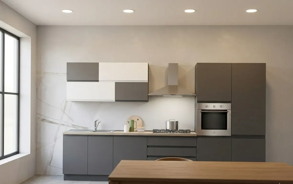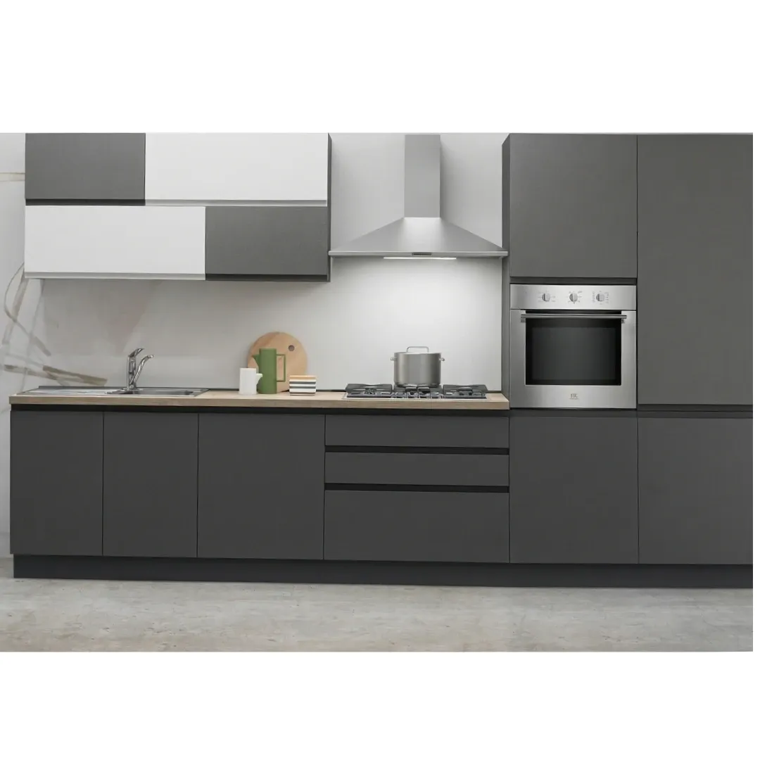 La Clio è una cucina lineare dal carattere deciso: ante bicolore antracite dust e bianco dust con profilo J a maniglia integrata, senza elementi sporgenti e con un aspetto pulito che funziona sia in ambienti moderni che in contesti più neutri.
