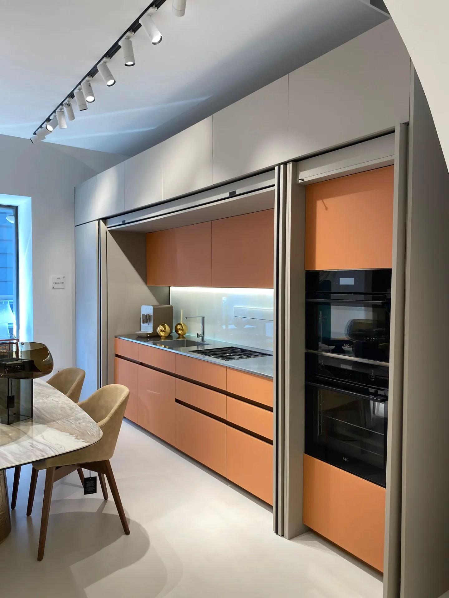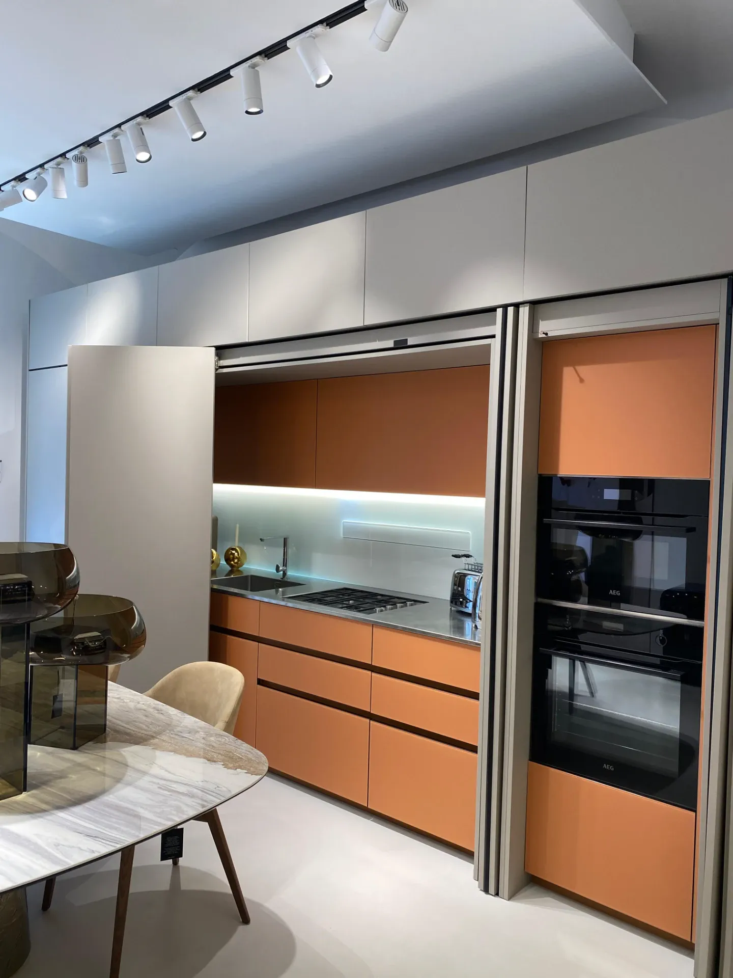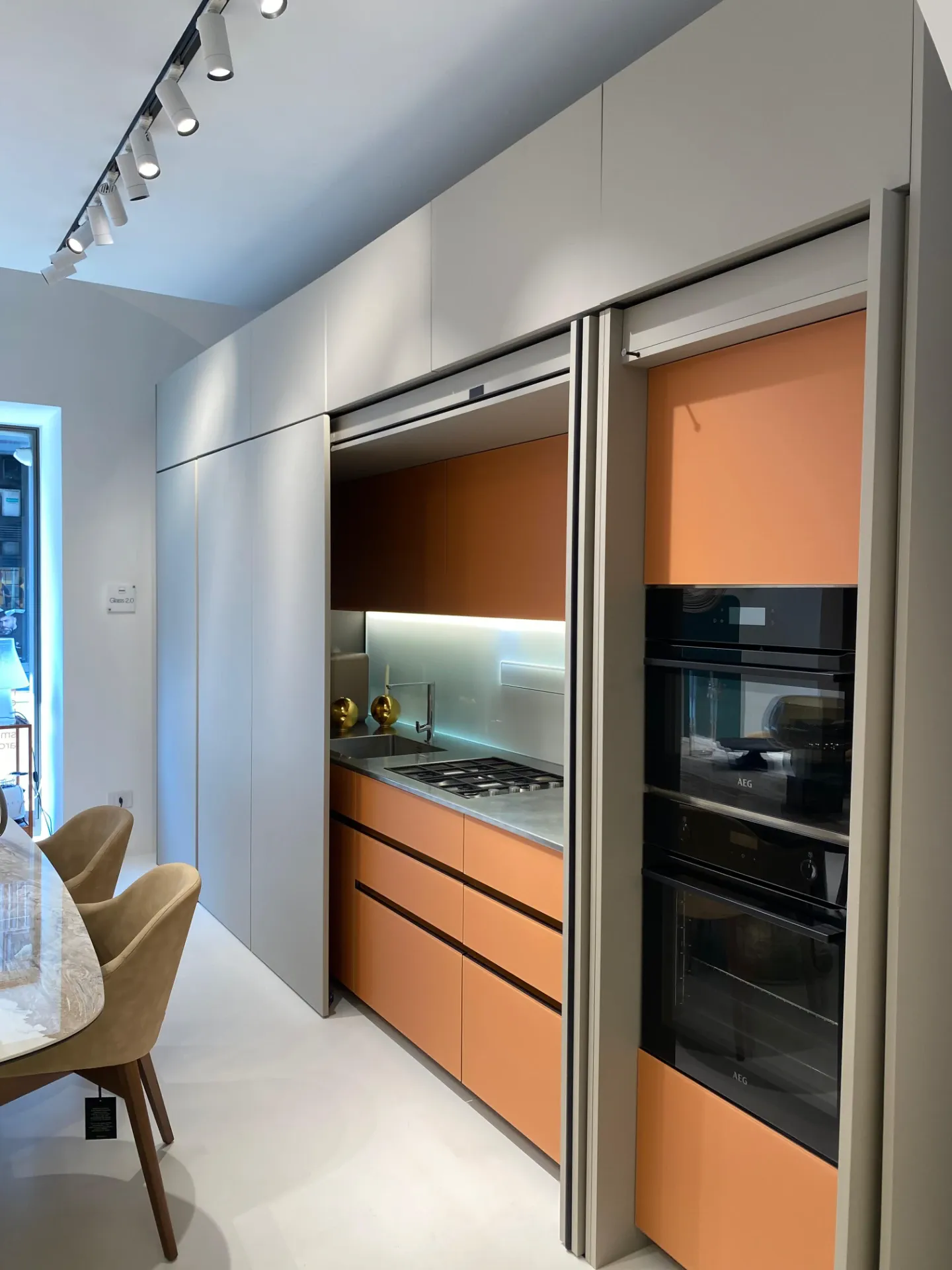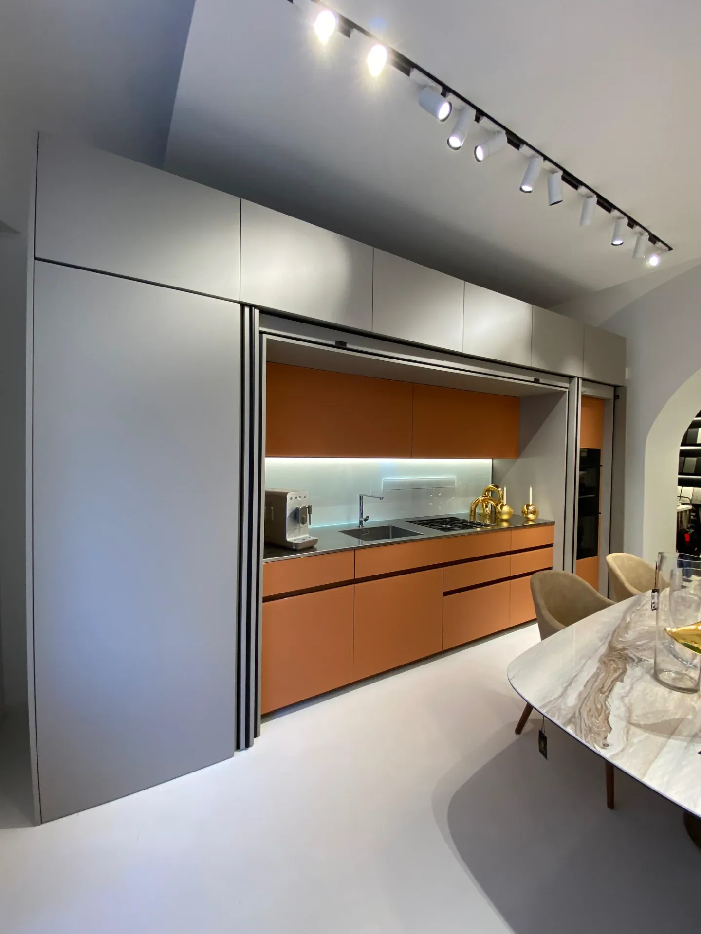Sì, perché la vera particolarità di questa cucina è il sistema a scomparsa Pocket: delle ante a tutta altezza ti permettono di chiudere completamente la composizione, trasformandola in un elegante armadio integrato. In un solo gesto, tutto scompare: elettrodomestici, piani di lavoro, pensili, rendendo l ambiente ordinato, essenziale, quasi zen.