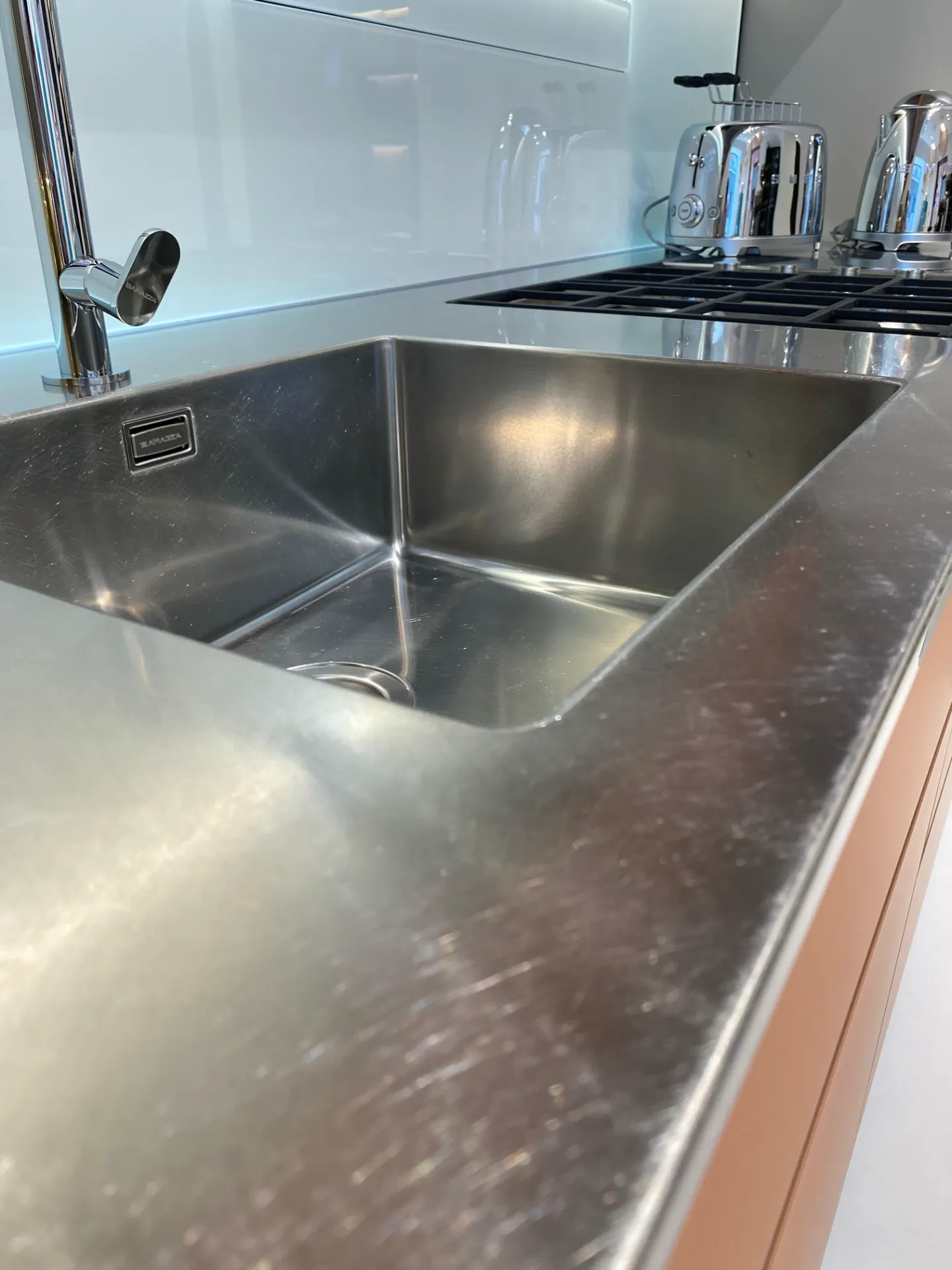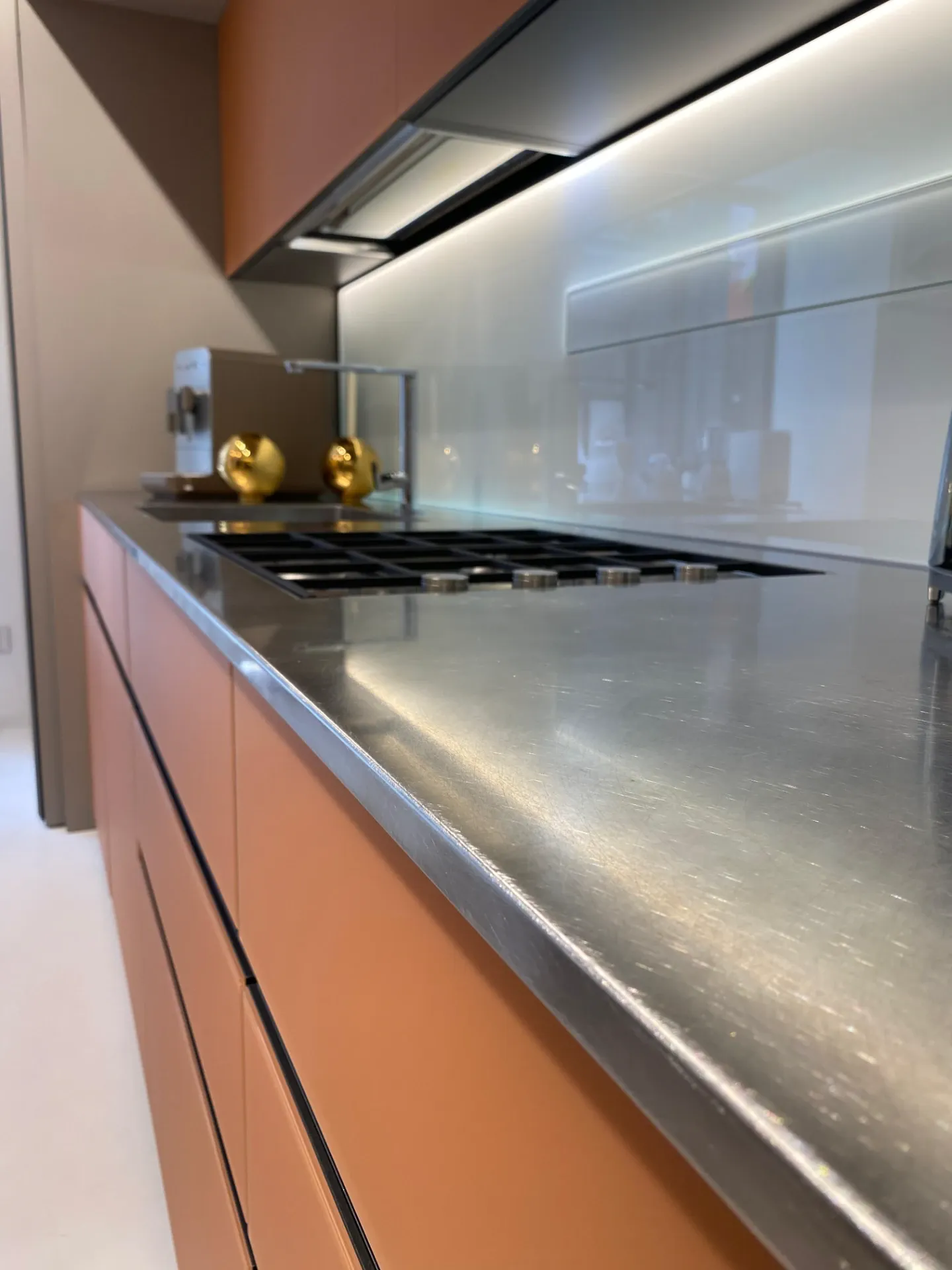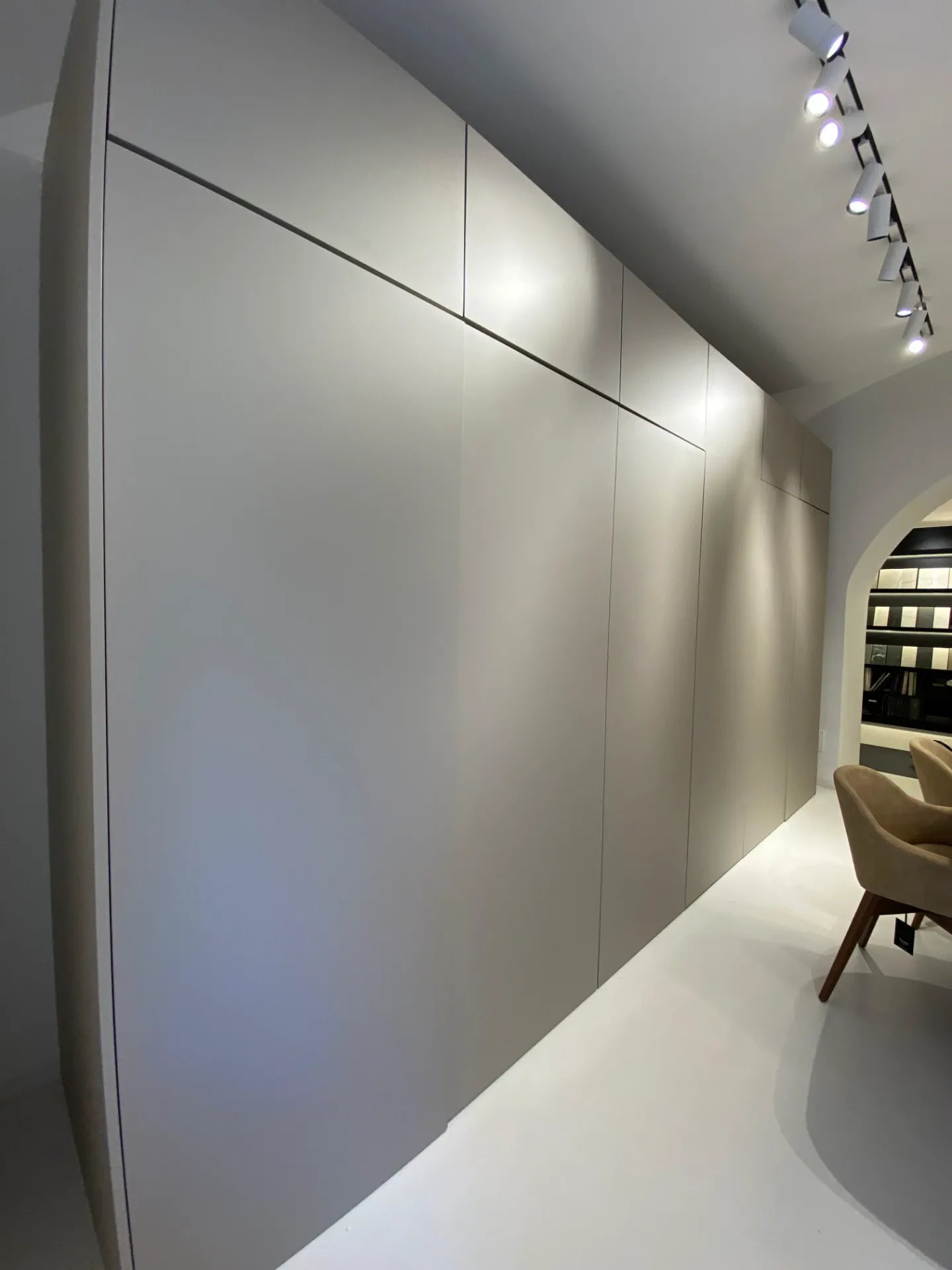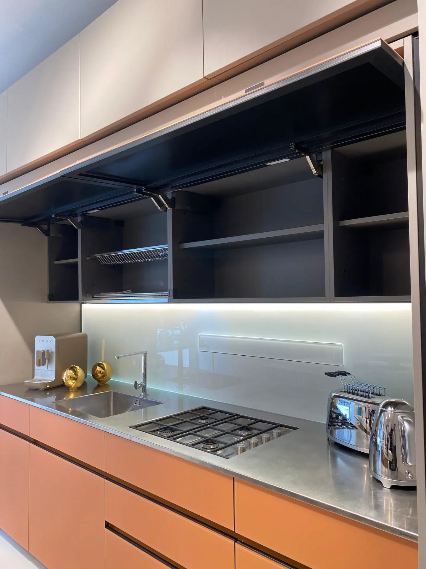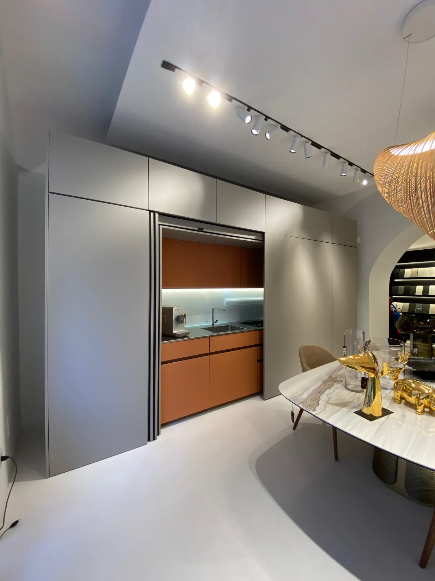 Sì, perché la vera particolarità di questa cucina è il sistema a scomparsa Pocket: delle ante a tutta altezza ti permettono di chiudere completamente la composizione, trasformandola in un elegante armadio integrato. In un solo gesto, tutto scompare: elettrodomestici, piani di lavoro, pensili, rendendo l ambiente ordinato, essenziale, quasi zen.